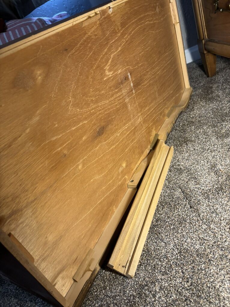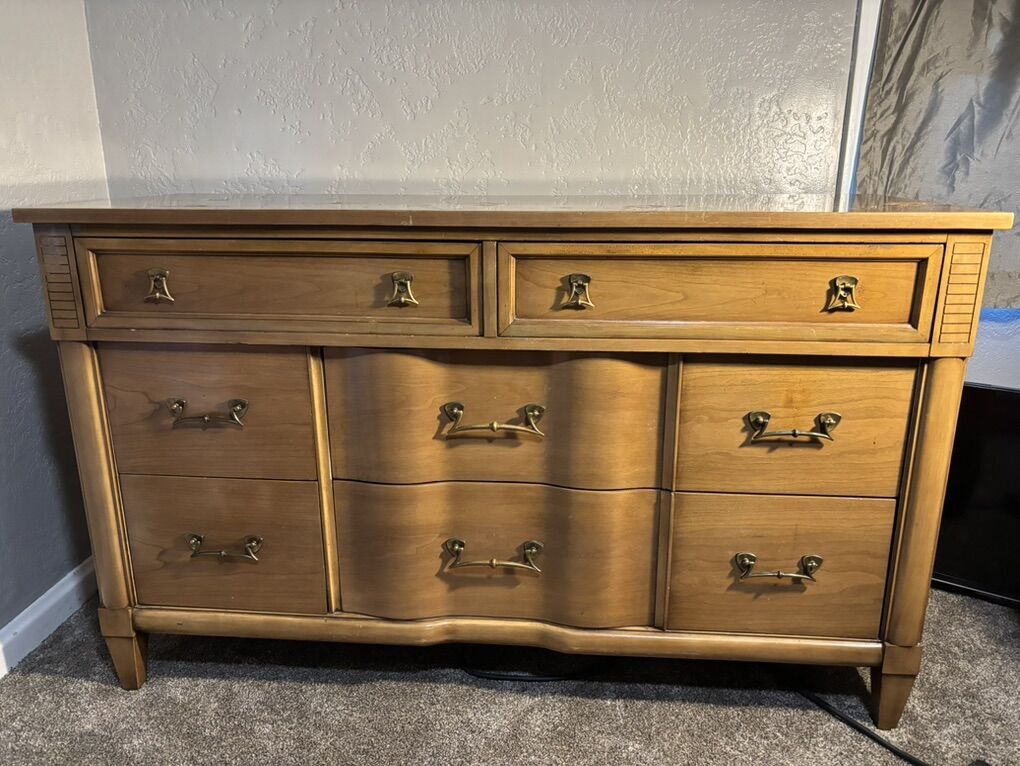 VenmoLoved Kent Coffey dresser. Walnut 6 drawer piece. About 32 1/2 inches tall, 54 long and 20 inches wide. The top has damage from candle burner marks and some other things. (Were already there when we bought it) Recently the track wood piece fell off one of the bottom of the drawers, but it just needs to be nailed or screwed back on. Original hardware. Would be beyond beautiful for anyone willing to put a little work into completely restoring it. :)