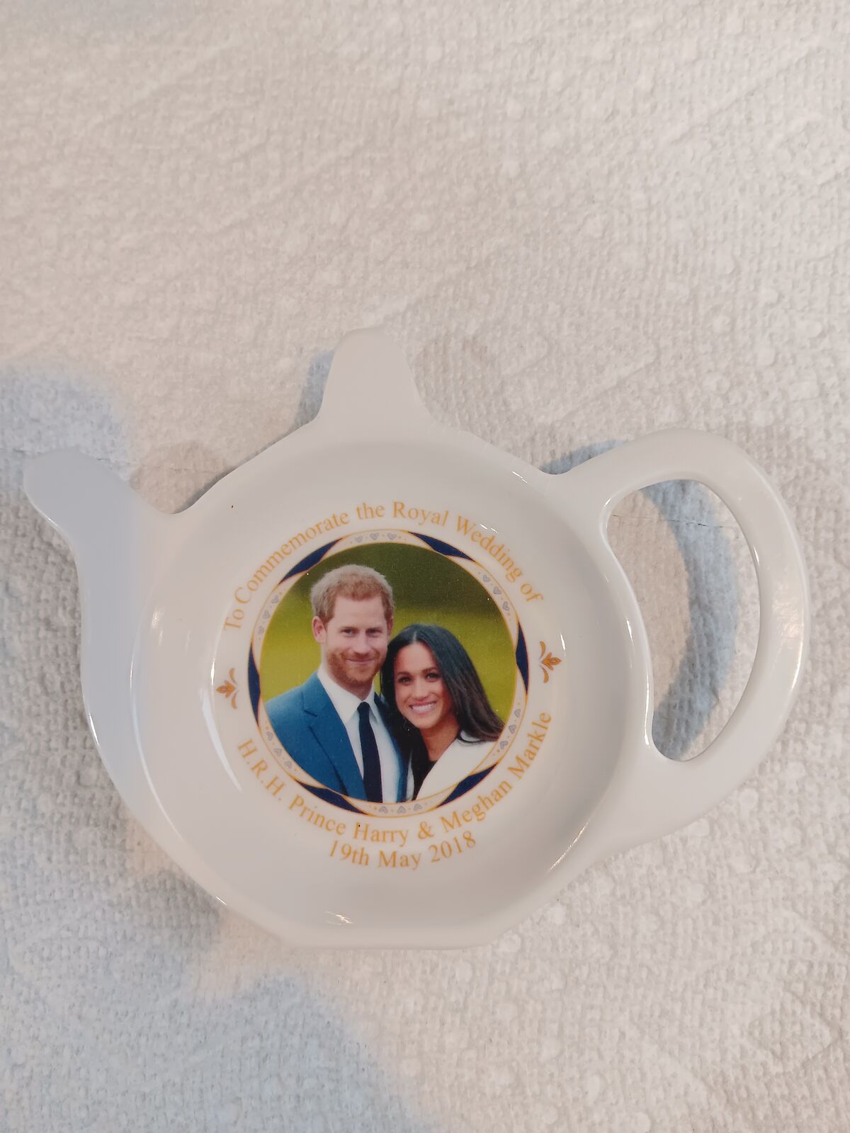Venmo2.5”w by 3.5”l Fridge Magnet and plastic t-bag holder featuring Prince Harry and Megham's Wedding.