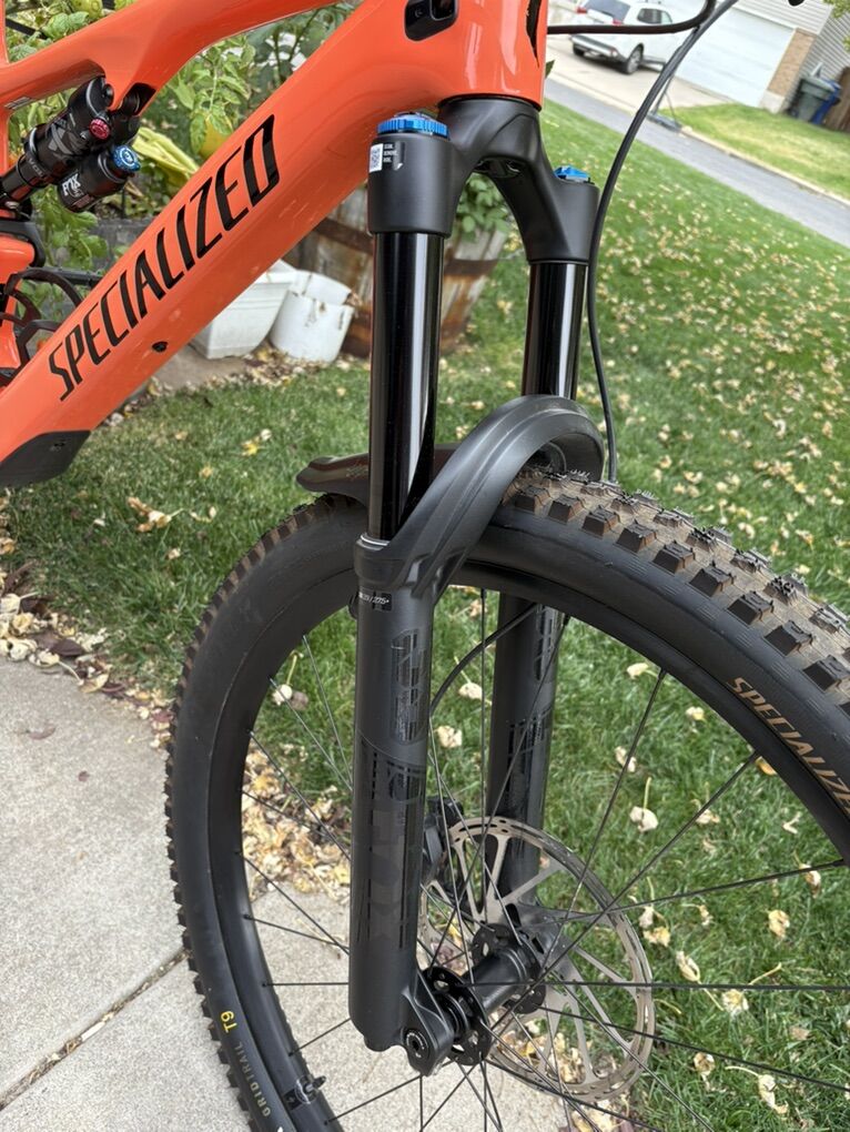 Fork Fox 38 performance Elite Rhythm, 29, 44mm offset, 160mm Brakes Front Brake SRAM Code RS, 4-piston caliper, hydraulic disc, 200mm Rear Brake SRAM Code RS, 4-piston caliper, hydraulic disc, 200mm Drivetrain Shift Levers SRAM GX, trigger, 12-speed Rear Derailleur SRAM GX Eagle AXS 12-speed Cassette Sram XG-1275, 12-speed, 10-52t Chain SRAM NX Eagle, 12-speed Crankset SRAM Alloy Crankset, Dub interface Chainrings New SL 1.2 spider, 104BCD w/SRAM 32t Transmission compatible alloy ring Wheels & Tires Rims Specialized 29/27.5, hookless alloy, 30mm inner width, tubeless ready Front Hub Alloy, sealed cartridge bearings, 15x110mm thru-axle, 28h Rear Hub Alloy, sealed cartridge bearings, 148mmx12mm thru-axle, 28h Spokes DT Swiss Industry Front Tire Butcher, GRID TRAIL casing, GRIPTON® T9 compound, 2Bliss Ready, 29x2.3 Rear Tire Eliminator, GRID TRAIL casing, GRIPTON® T7 compound, 2Bliss Ready, 27.5 x 2.3 Inner Tubes Standard, Presta Valve Cockpit Stem Alloy Trail Stem, 35mm bar bore Handlebars Specialized, 6061 alloy, 6-degree upsweep, 8-degree backsweep, 30mm rise, 780mm width Grips Specialized Trail Grips Saddle Bridge Comp, Hollow Cr-mo rails, 155/143mm SeatPost X-Fusion Manic, infinite adjustable, two-bolt head, bottom mount cable routing, remote SLR LE lever, 34.9, S5: 170mm