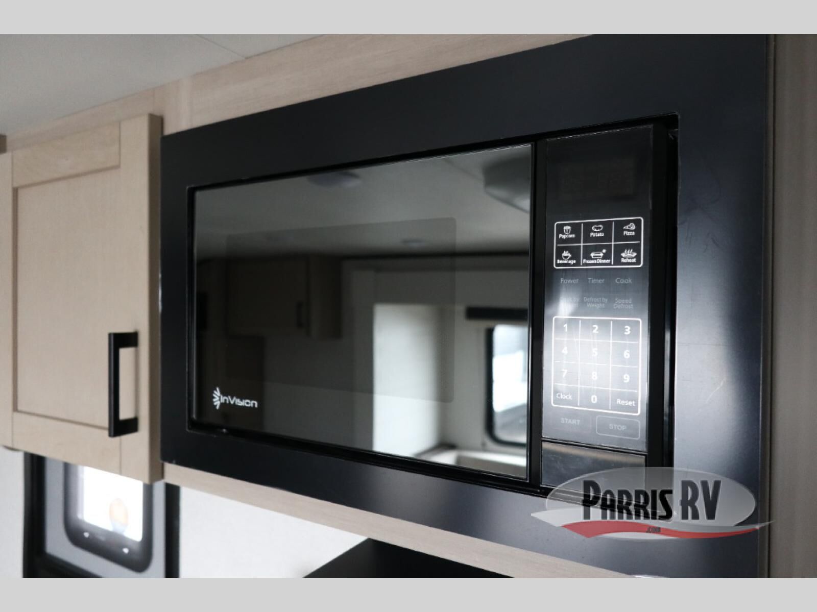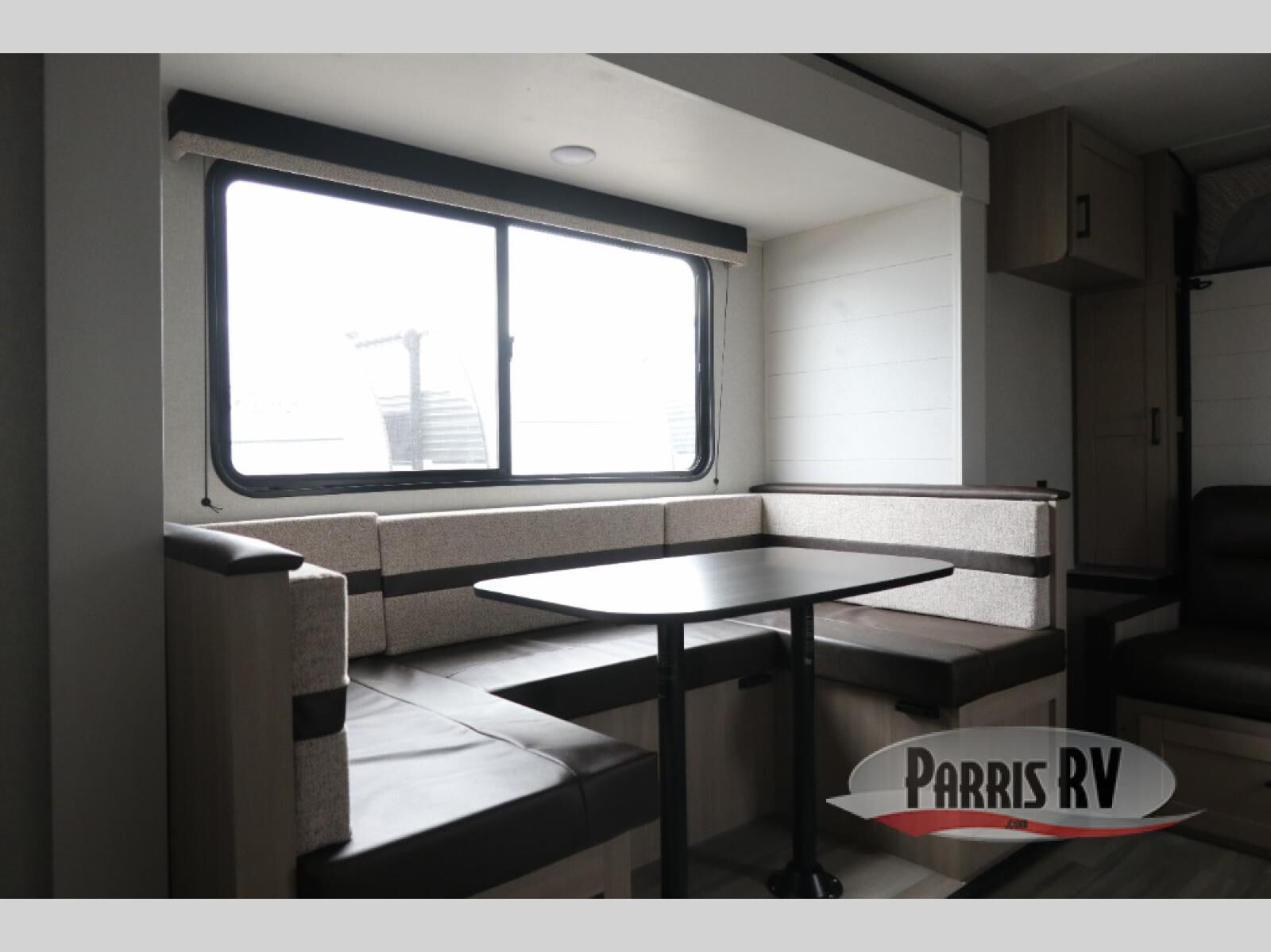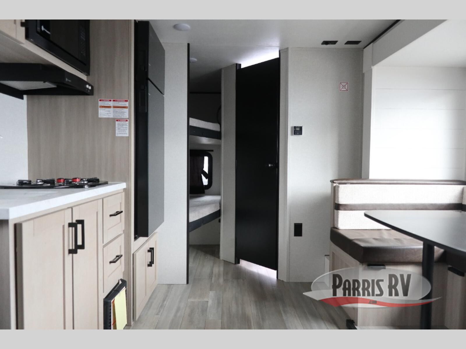 Camping trips are made easy in this travel trailer with double-size bunk beds for guests or little ones. There is a front Murphy bed that will provide you with more space during the day when you put it away to reveal the jack knife sofa. The rear corner full bath includes a foot-flush toilet, a 30" x 36" shower and a sink, so you won't have to leave the camper in the middle of the night. A two-burner cooktop and microwave oven will let you make meals each day, and you can dine around the U-shaped dinette, which is also within a slide out for more space!