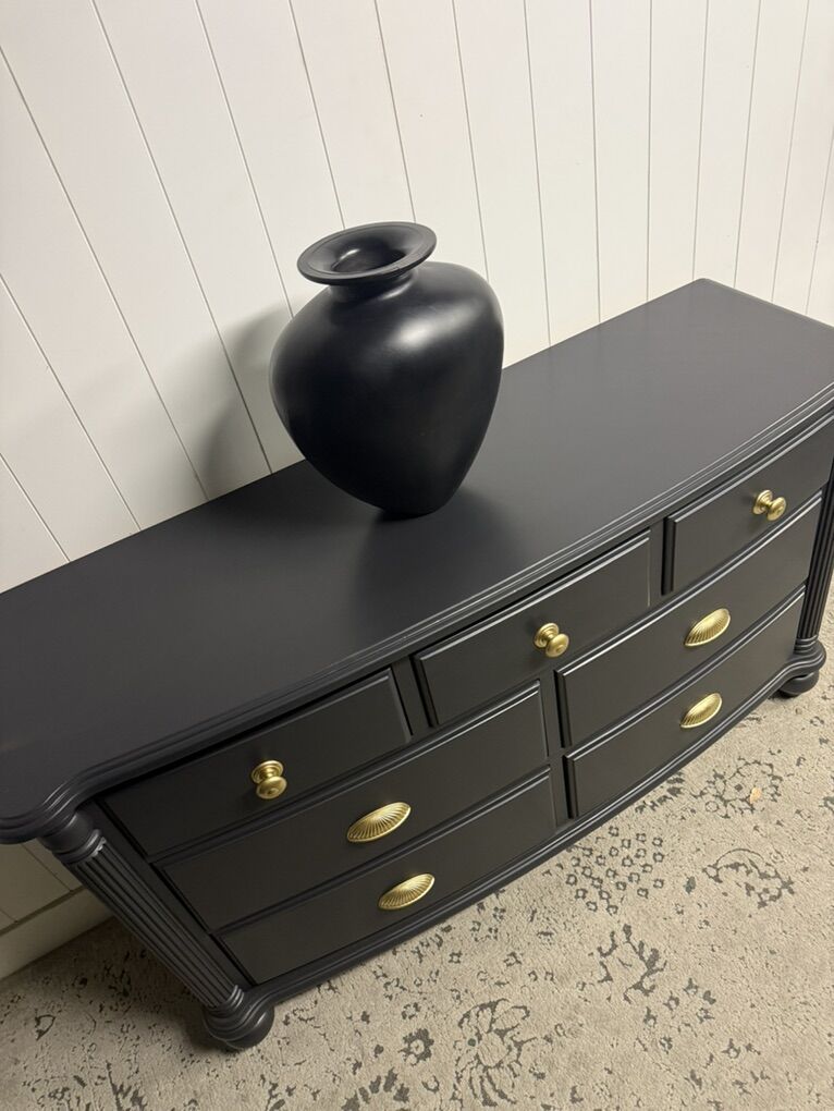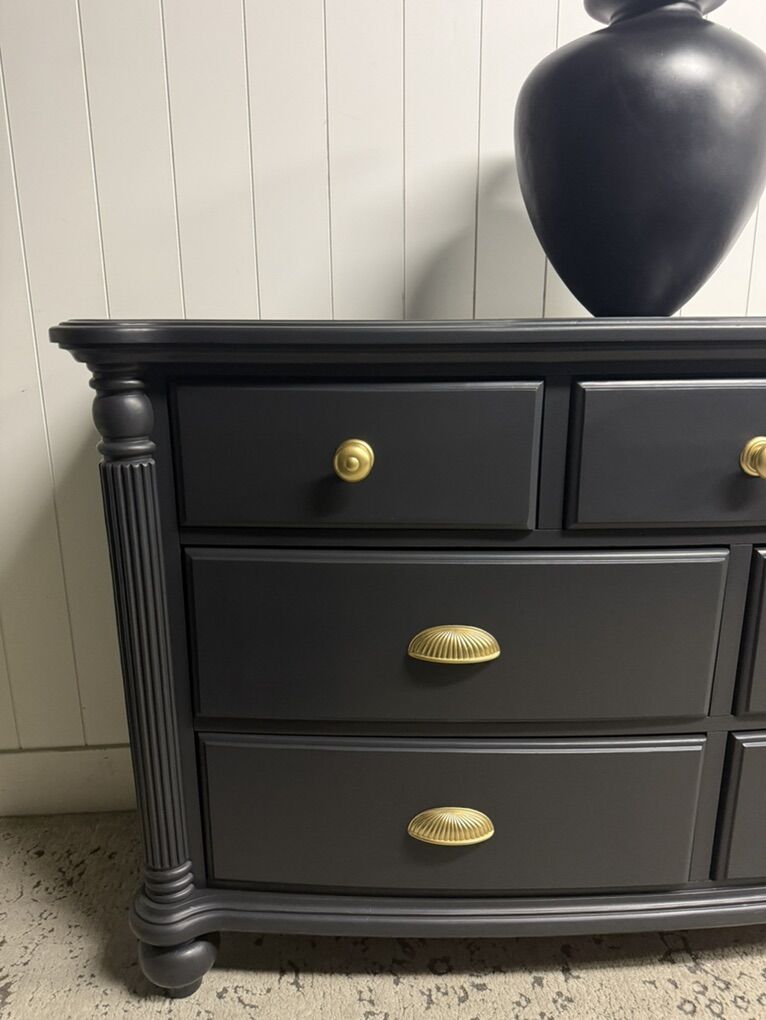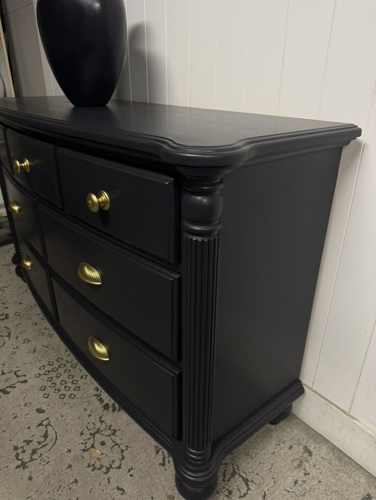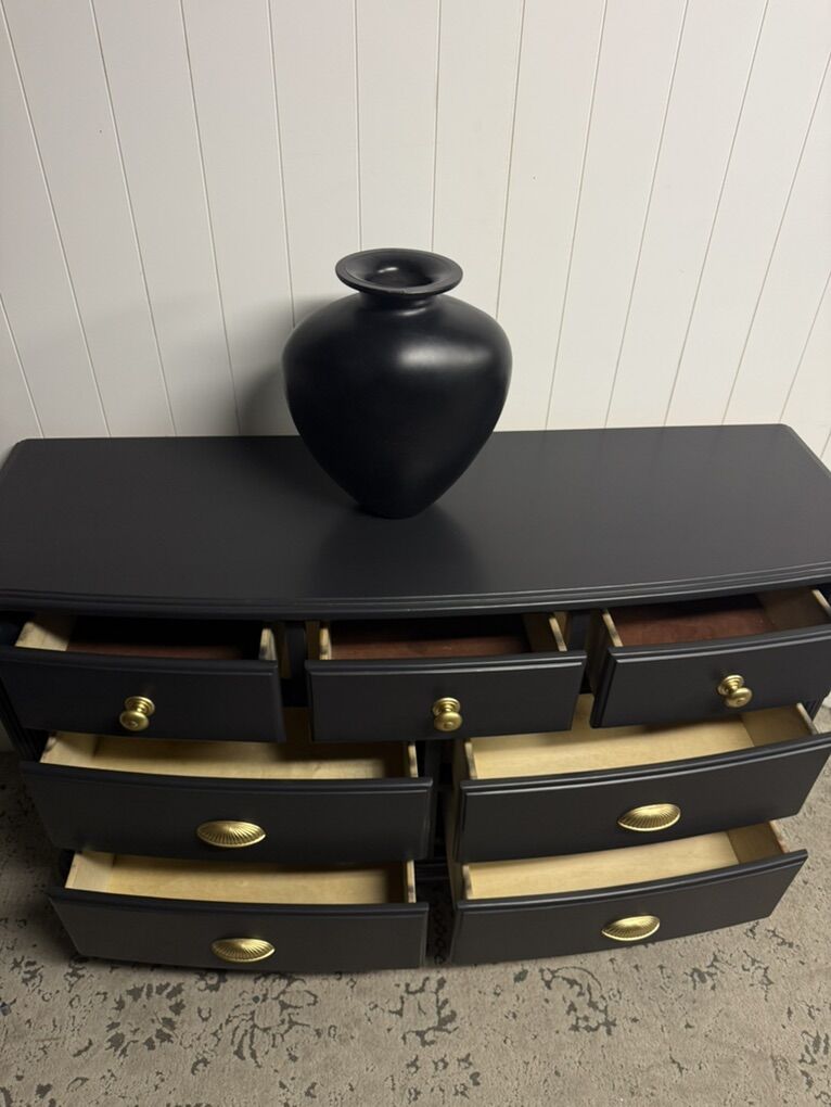 VenmoBeautiful solid wood dresser refinished in Black with gold hardware! Dresser has 7 drawers all function properly and the top three are lined in the original velvet liner. Beautiful dresser ready for its new home! Drawers will be lined in a matte black liner.