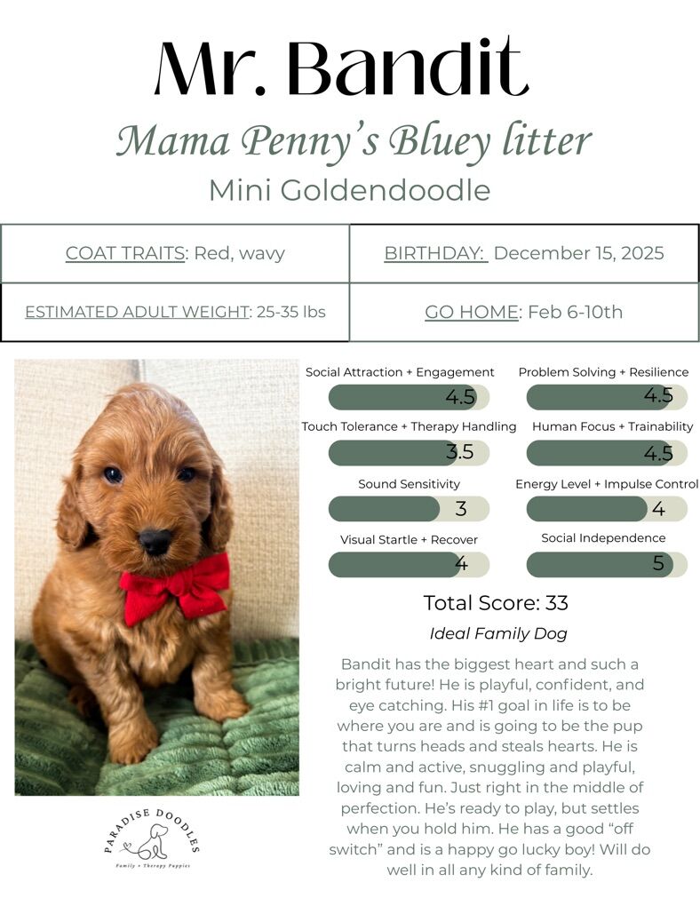 ZelleM R. B A N D I T Bandit is the sweetest puppy with a confident, people- focused personality. He has medium energy and will love an active home who will let him tag along on adventures and sit on the couch to binge your favorite tv show. With his tender heart, he is going to be the pup you bond with and can’t imagine life without. We added his report card of his temperament testing in the photos. He would be great as a family dog with children! Mini Goldendoodle 25-35 lbs Wavy, thick fleece coat Non shedding Ready to go home Feb 6-10th We have been breeding for almost 16 years! It’s our passion. We raise all of our puppies on a therapy based, puppy training curriculum… it starts on day 1. We also offer an extended 4 weeks of puppy training with our famous Puppy Start program. WE ONLY HAVE ONE SPOT LEFT! The info is on our website www.paradisedoodlesoflogan.com Our instagram is @paradisepuppystart