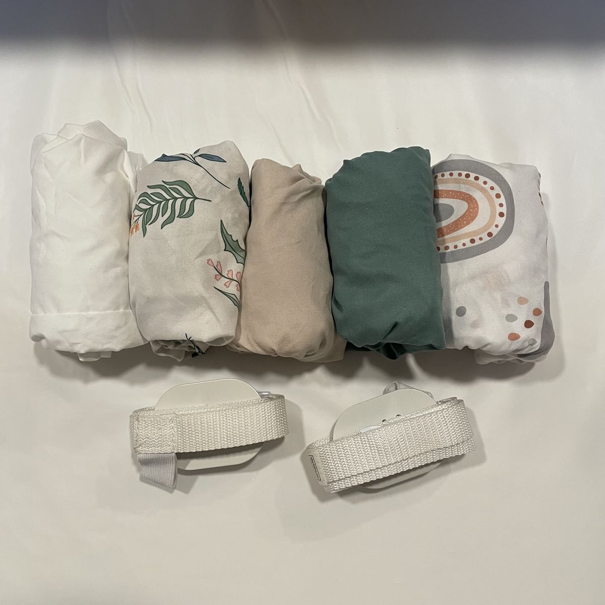 The removable cover has some small scuff marks that’s really only noticeable if you’re looking for it, but can easily be washed. Includes 5 fitted bassinet sheets and a bassinet net/cover for mosquitos or curious pets.