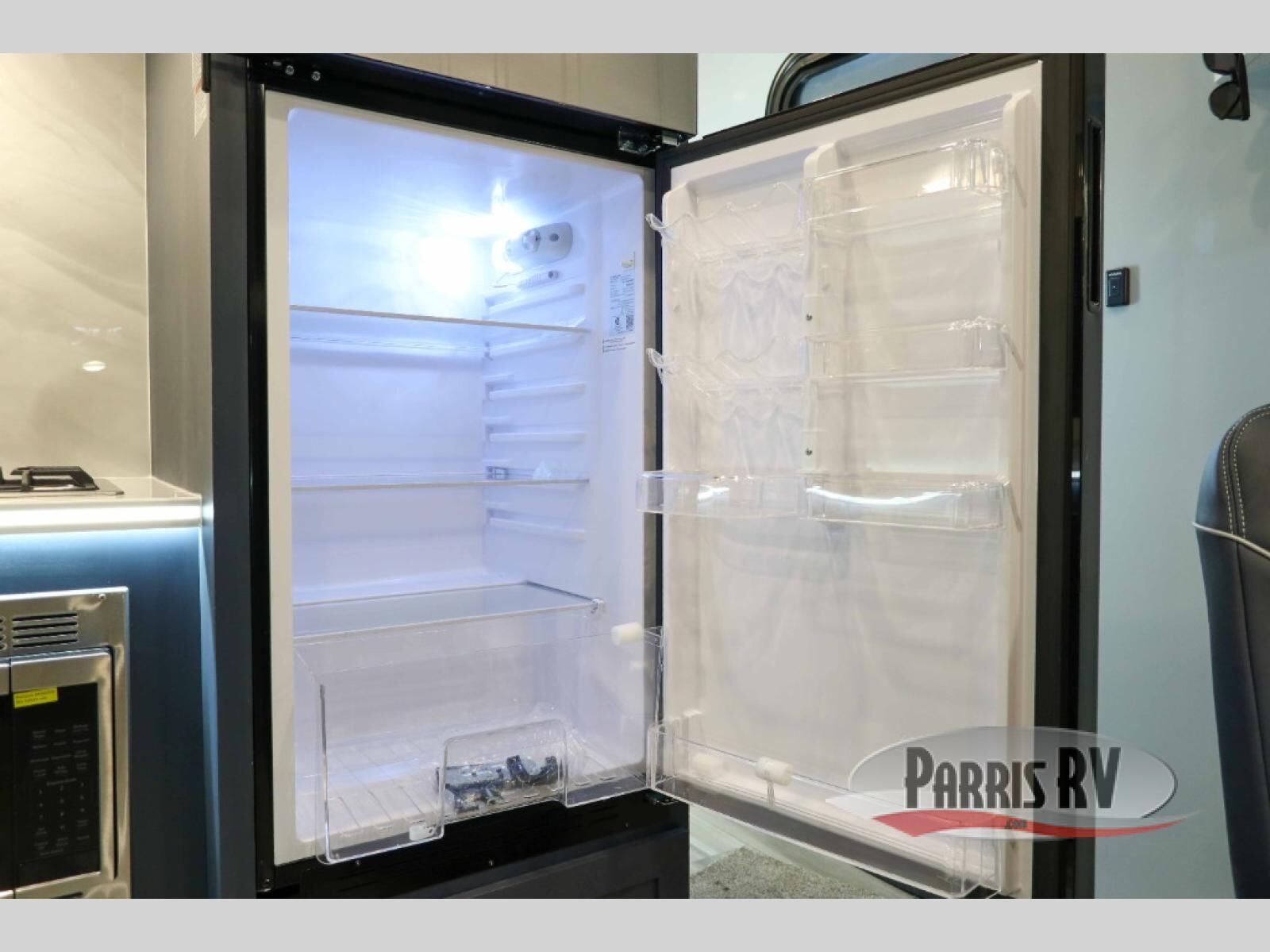 Pack your bags and head for the campground in this luxury toy hauler! You will love having your own bedroom up front with a 70" x 80" king bed, dual nightstands and wardrobes, plus overhead storage. If you have any guests staying over, they can sleep on the drop-down queen bed or bottom power dinette. A three-burner gas cooktop and 10.7 cu. ft. 12V refrigerator will let you cook and store food, and the full bath onboard means you won't have to leave the camper in the middle of the night! There is also a lounge chair with a table where you can relax with a book in the evenings or your coffee in the morning!