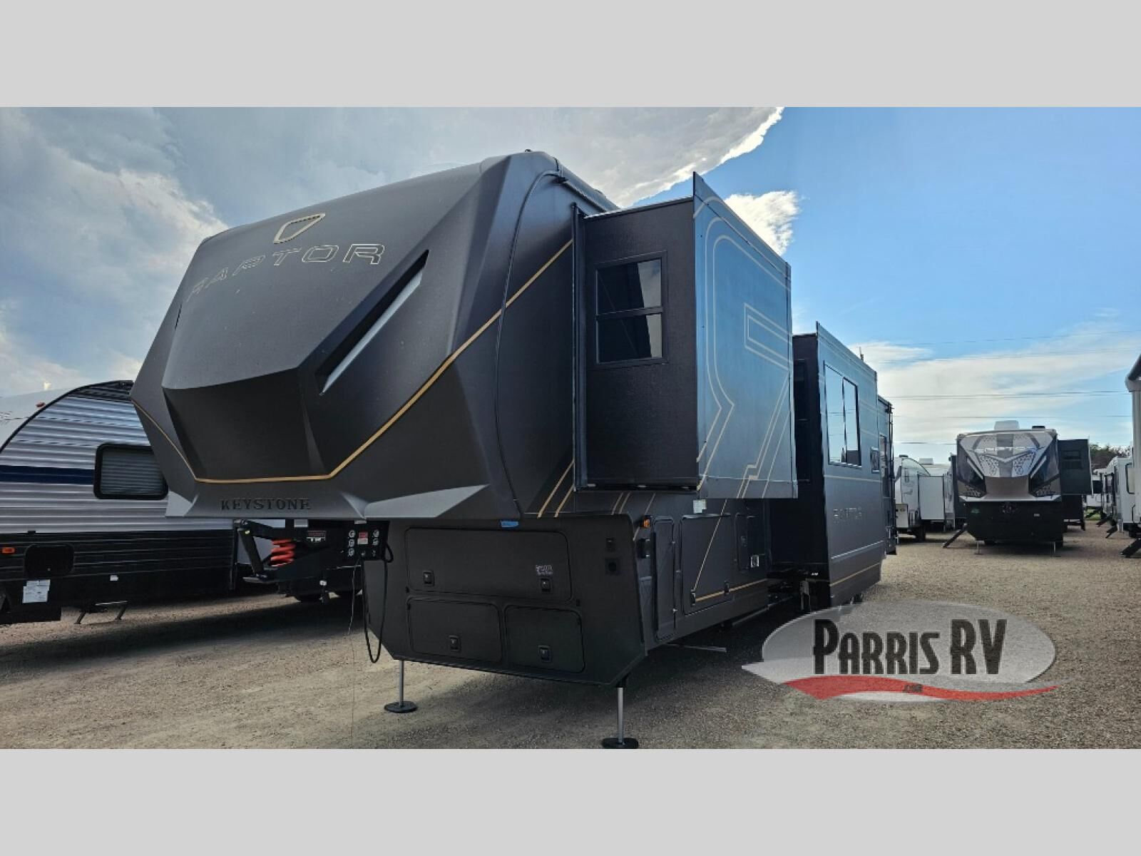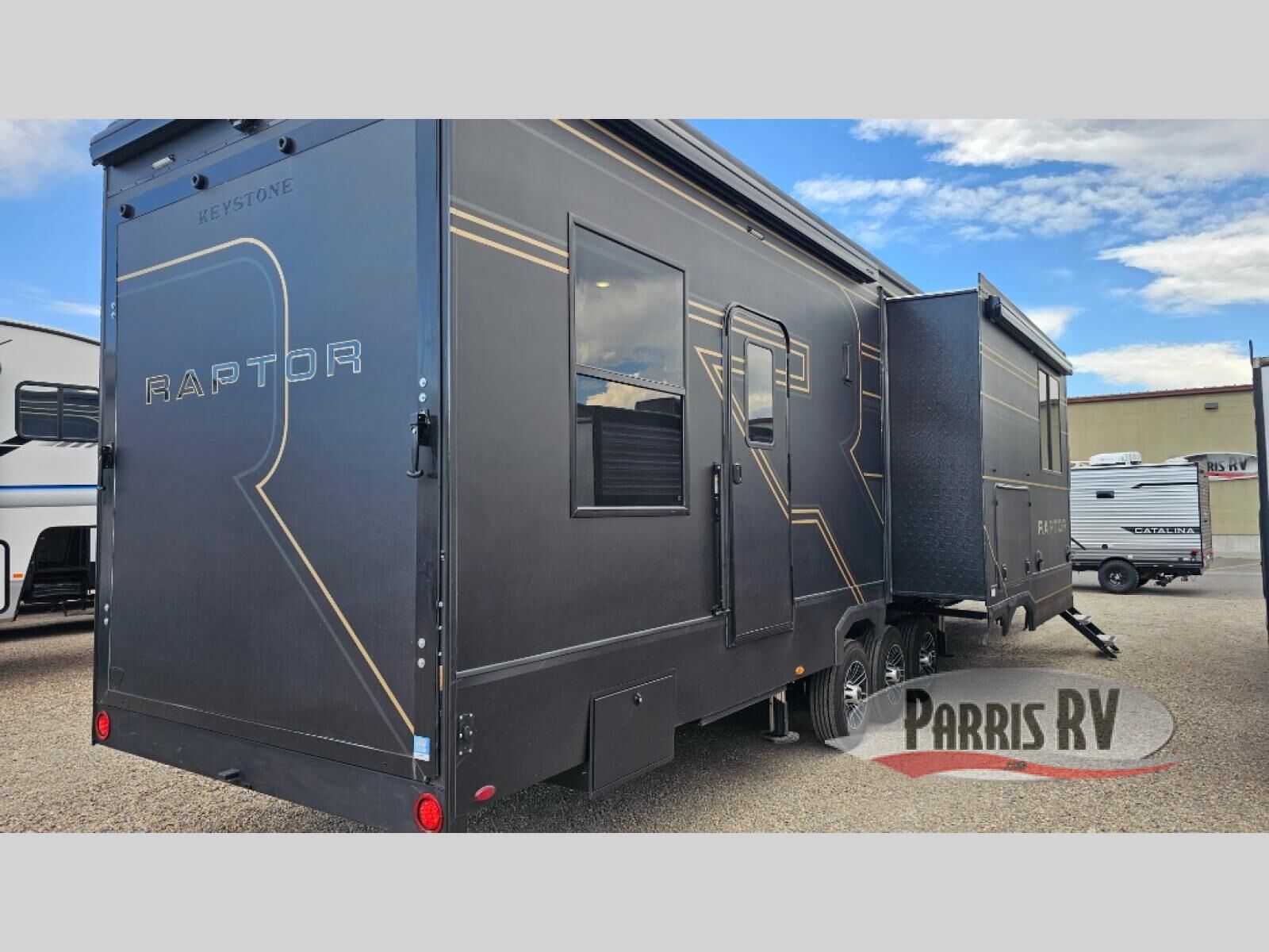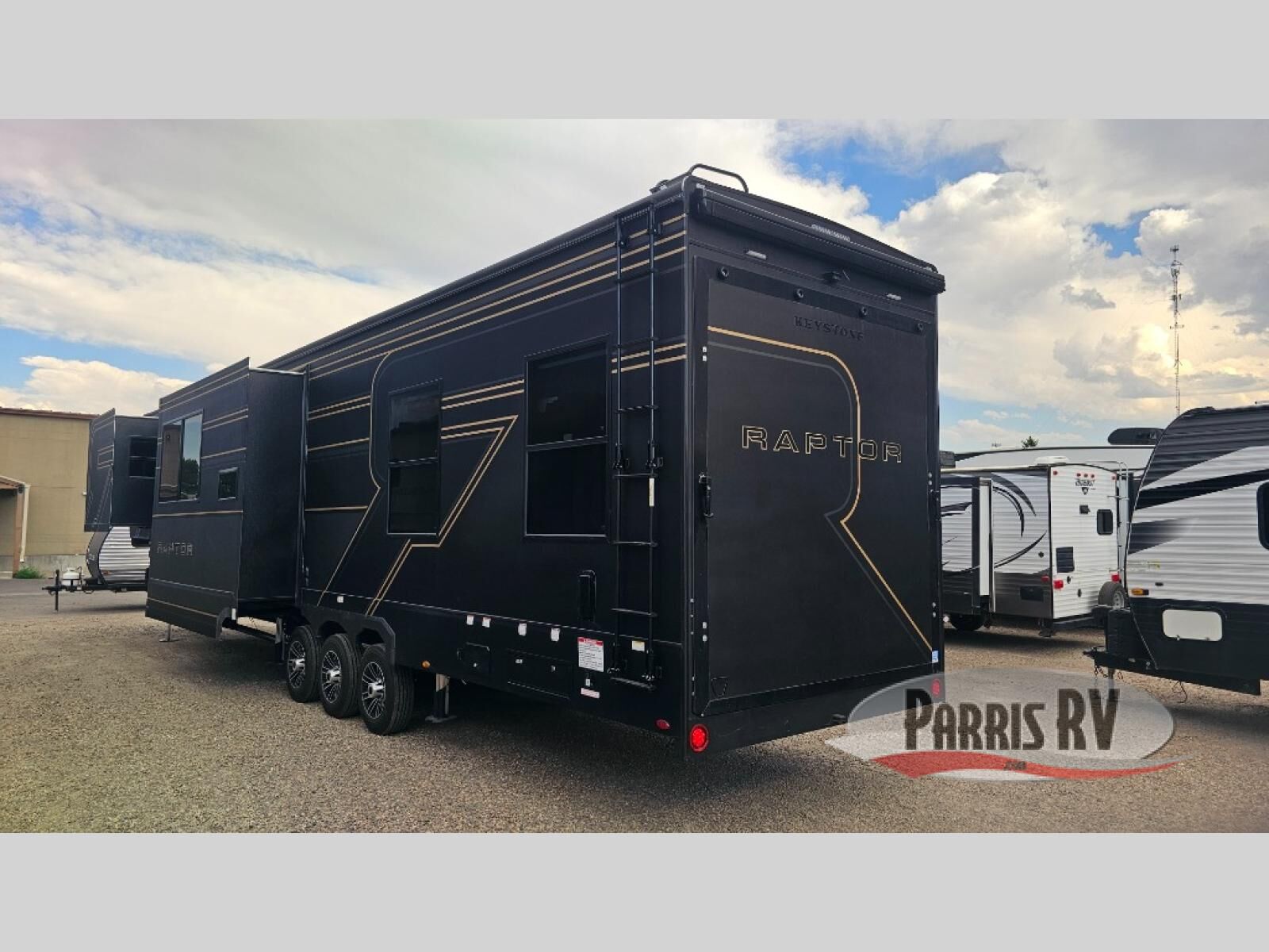 Experience a breath of fresh air with one of these Keystone RV Raptor fifth wheel toy haulers! Their rugged construction consists of a one-piece Alpha Super Flex TPO roof membrane, Dyna Span floor decking, and 5,000 lb. frame-welded tie- downs to keep your toys in place as you travel. Some unexpected conveniences you will appreciate include an Omni-Chill A/C system to keep you cool on those hot summer days, a Furrion backup camera, MaxTurnTM technology with a HeluxTM pin box, and a Generation 3 iN-Command smart automation system with Global Connect to make life easier. There is also designer style vinyl flooring throughout, along with hardwood ceiling treatment with LED accent lighting, beach wood and white cabinetry, and many more interior comforts!