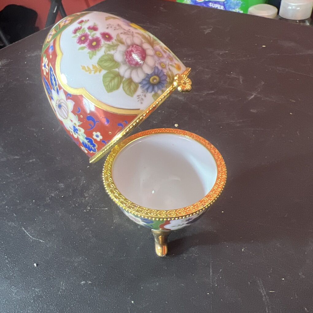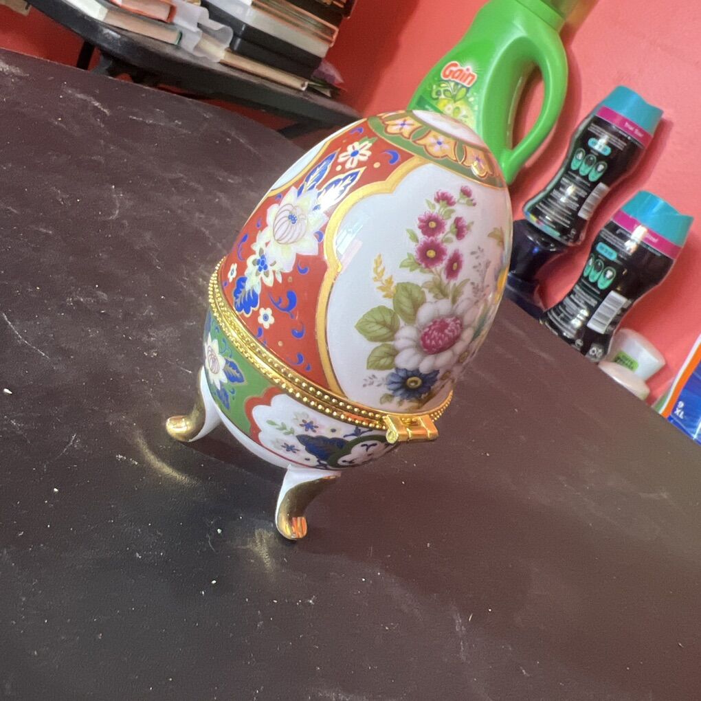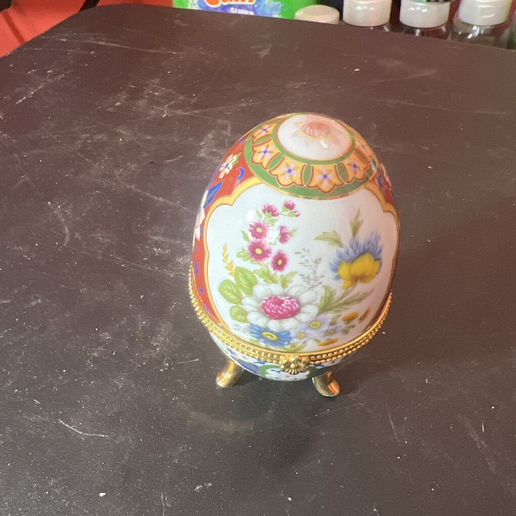 GooglePayVintage Floral Ceramic 3 Footed Egg Shaped Hinged Trinket Box with Gold Trim