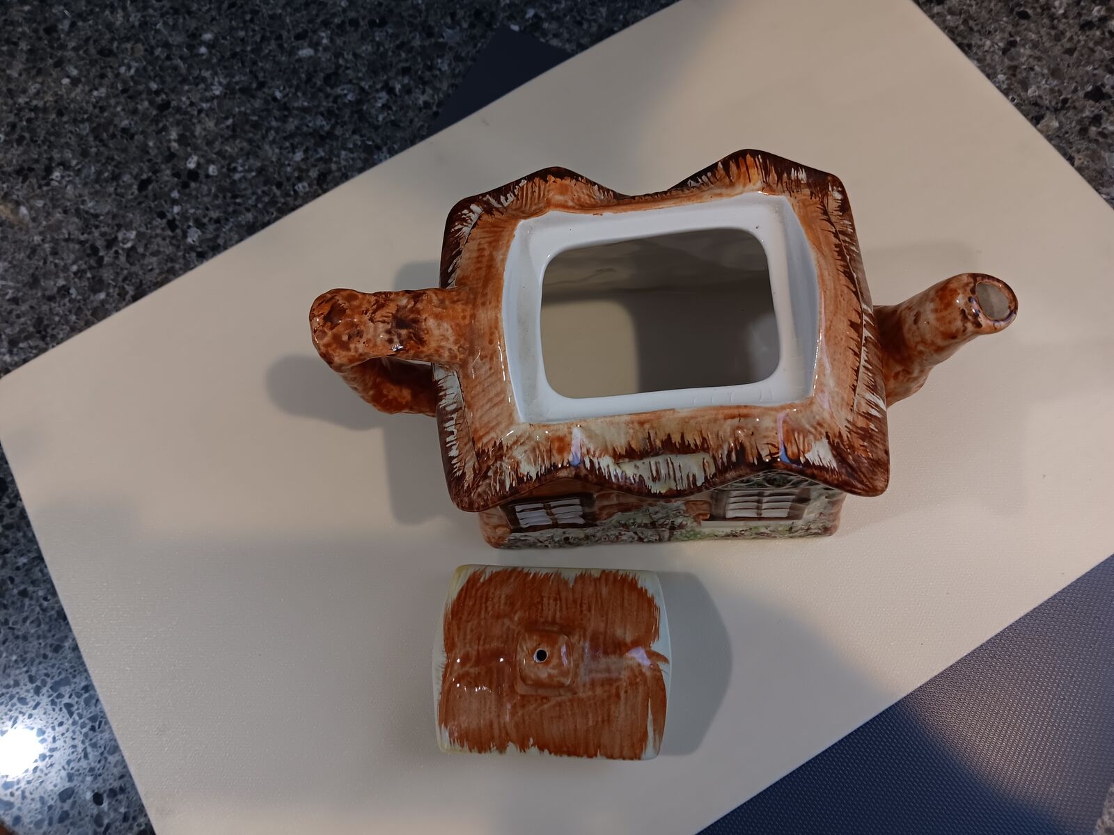 VenmoIt is a hand painted ceramic teapot shaped like a cottage with a brownthatched roof.