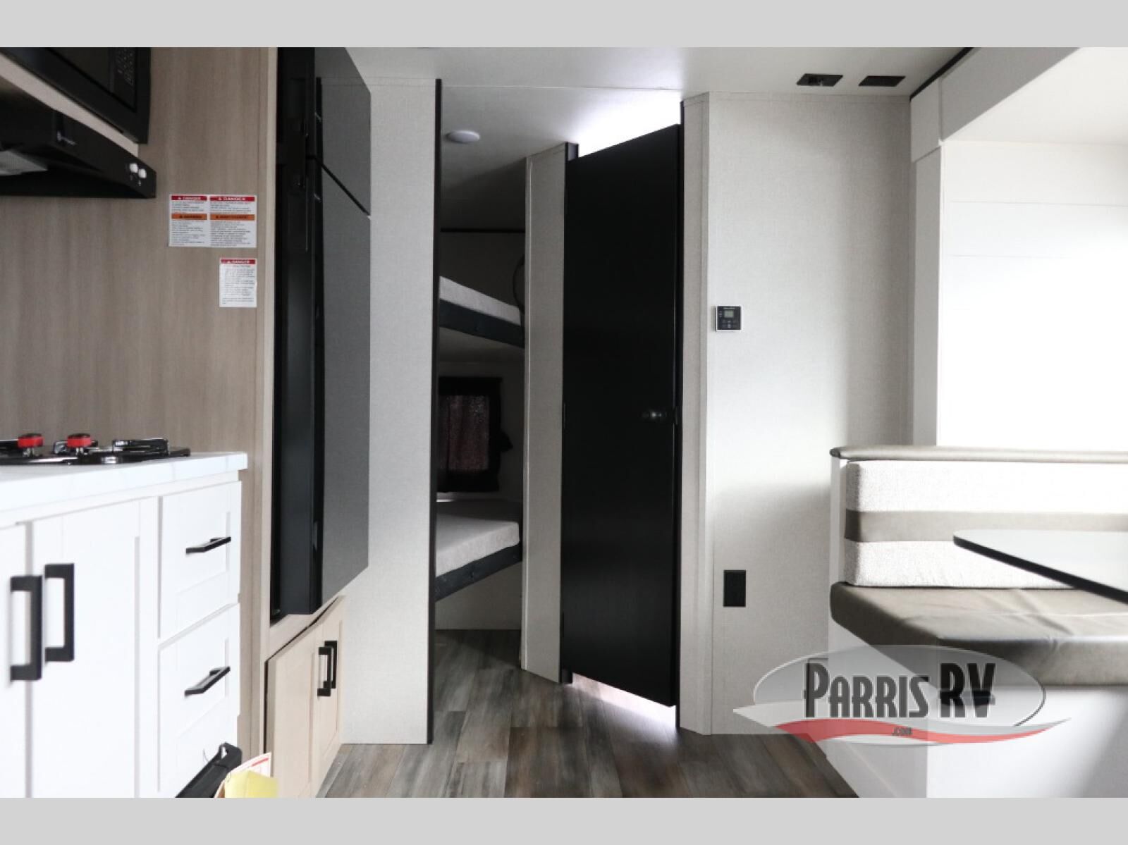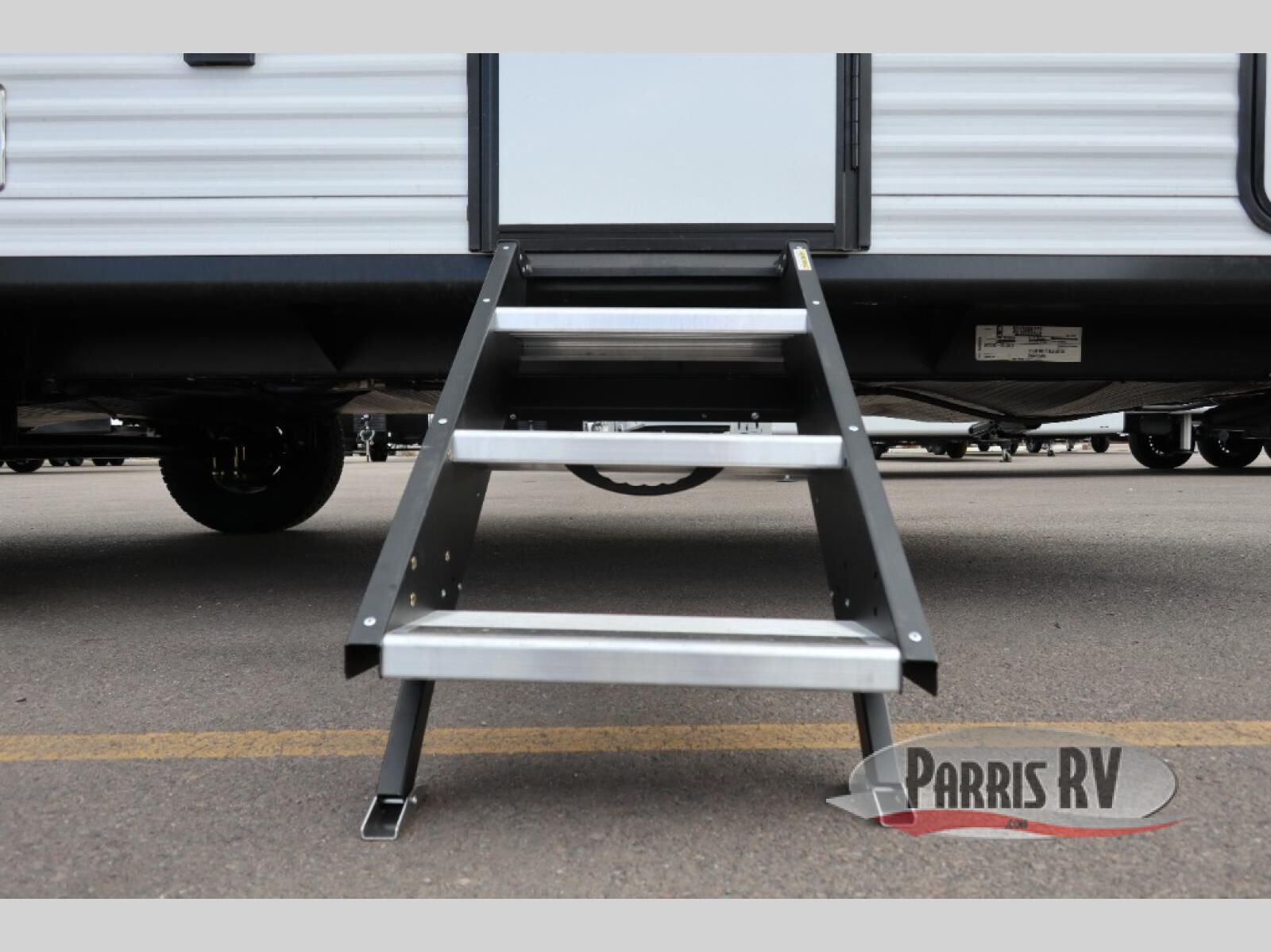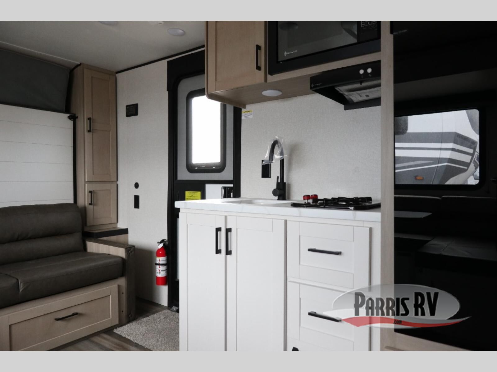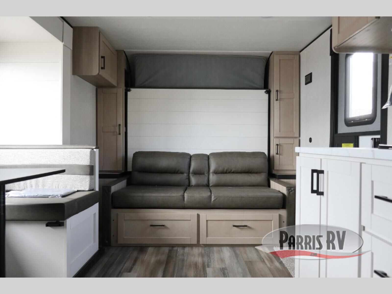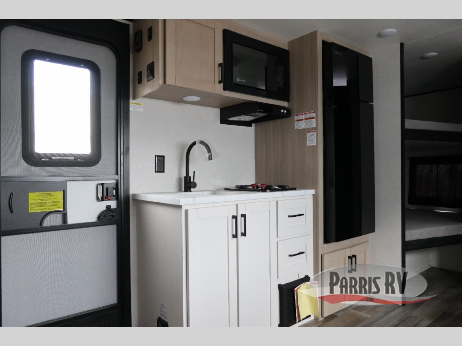 This travel trailer features compact sleeping spaces thanks to the double-size bunk beds in the rear corner, and the private full bath is right next to the bunks for easy nighttime use! You'll have the front Murphy bed all to yourselves, and in the morning, you can fold it away to sit on the jack-knife sofa. A cooktop and microwave oven will let you make meals each day, and there is a 12V refrigerator to keep your cold items fresh. Outside, you'll enjoy the 13' power awning for added shade, and there are two exterior storage compartments to keep fishing poles, hiking gear and more!