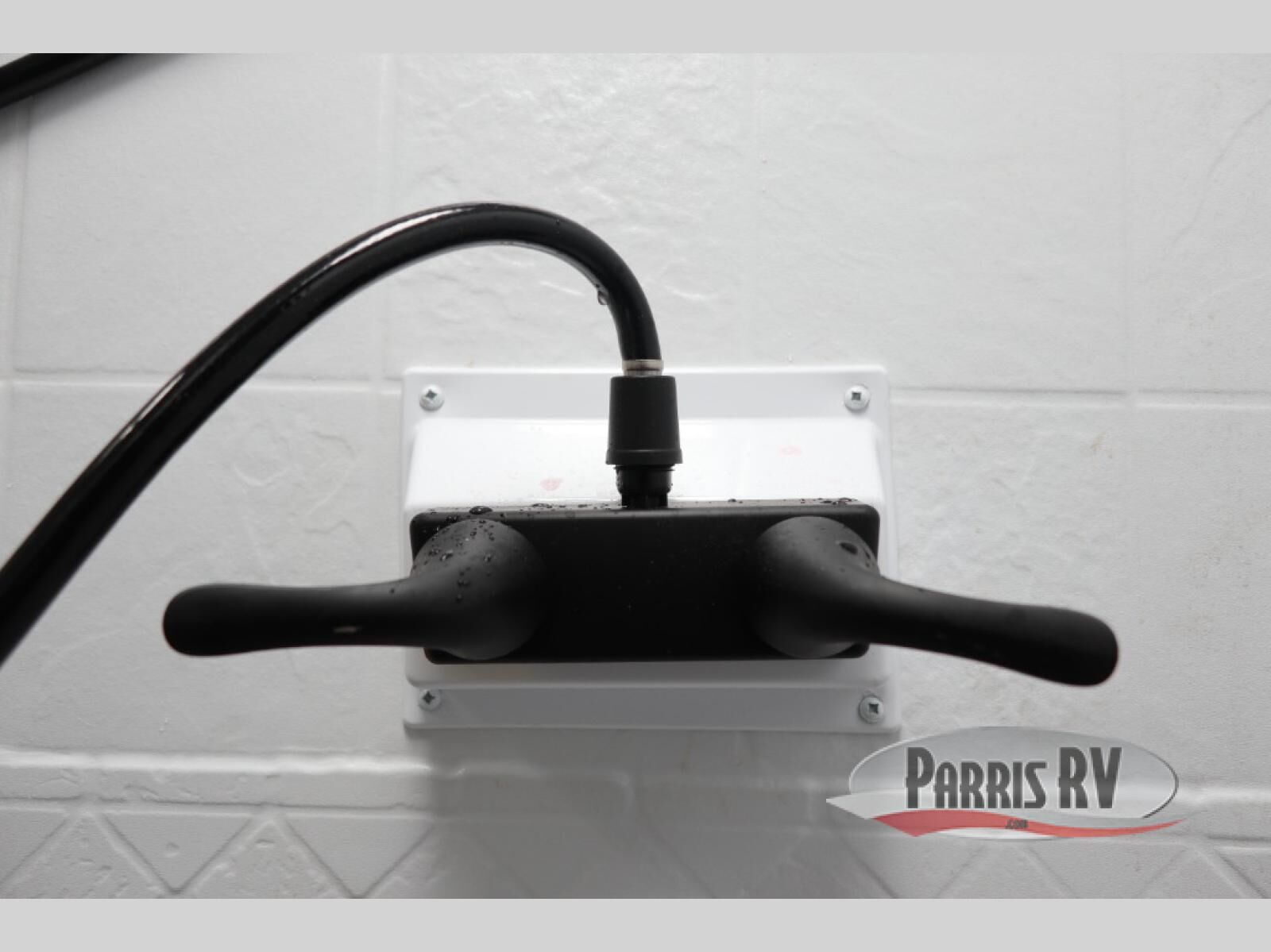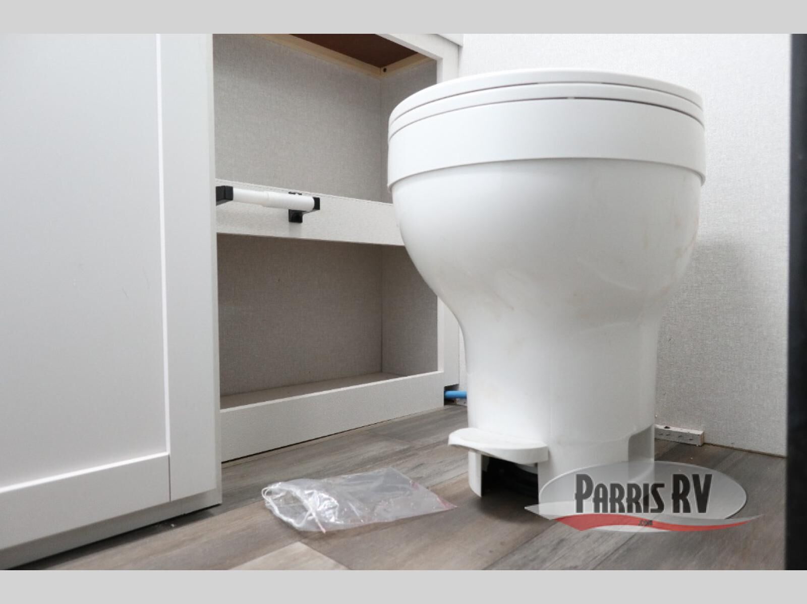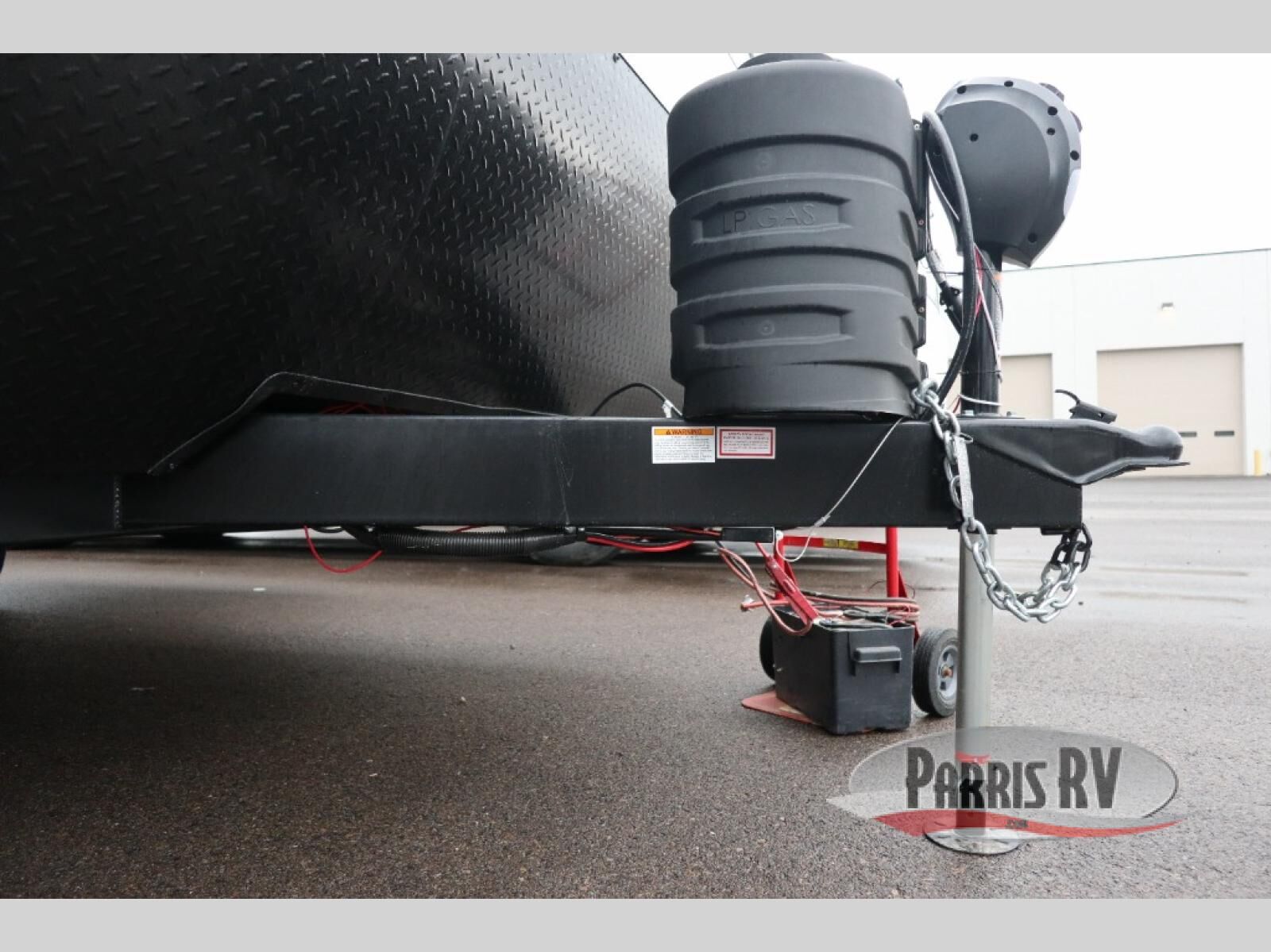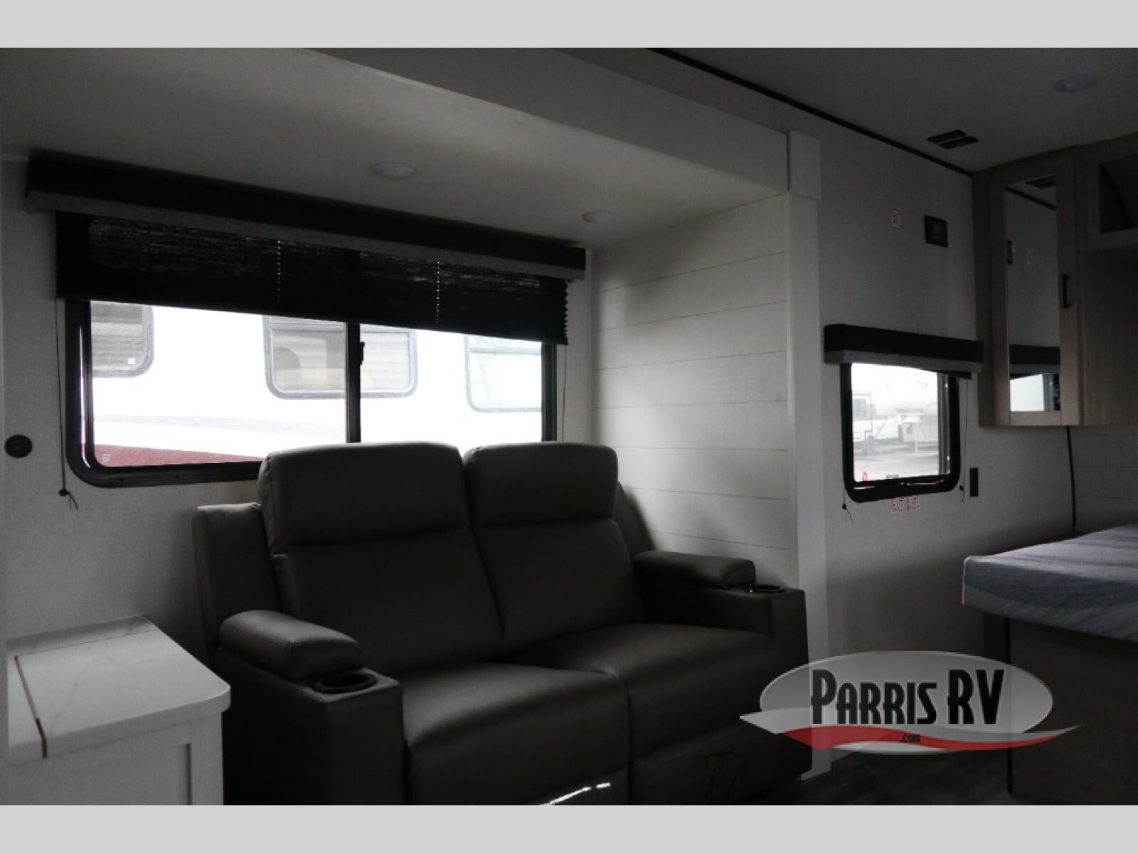 This couple's travel trailer is perfect for weekend trips to the lake! Once you arrive at the campground, you can unload the exterior storage, put out the 17' power awning with LED lights, then relax in your camp chairs. Head inside to make lunch on the three-burner cooktop in the rear corner kitchen, and you'll be pleased to find ample counter space here. The theater seat includes swivel tables where you can dine together, and the front queen bed is sure to bring a great night's rest!