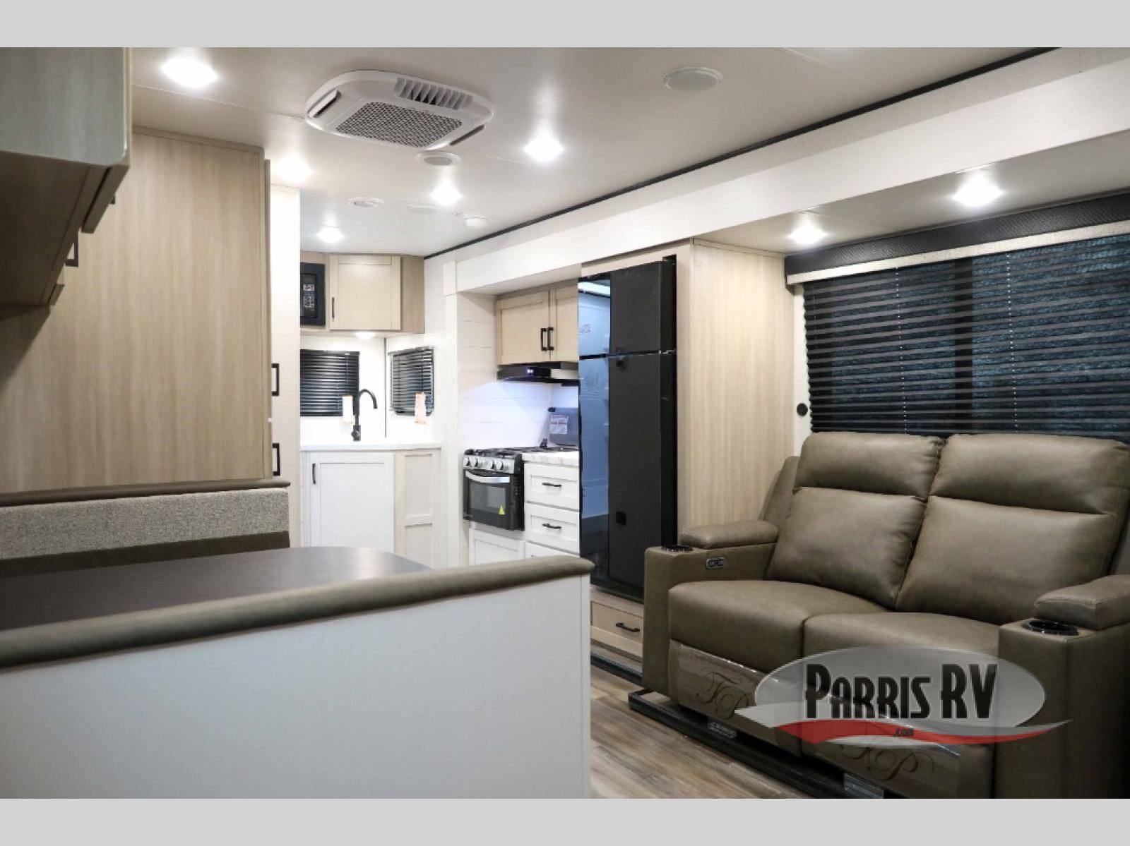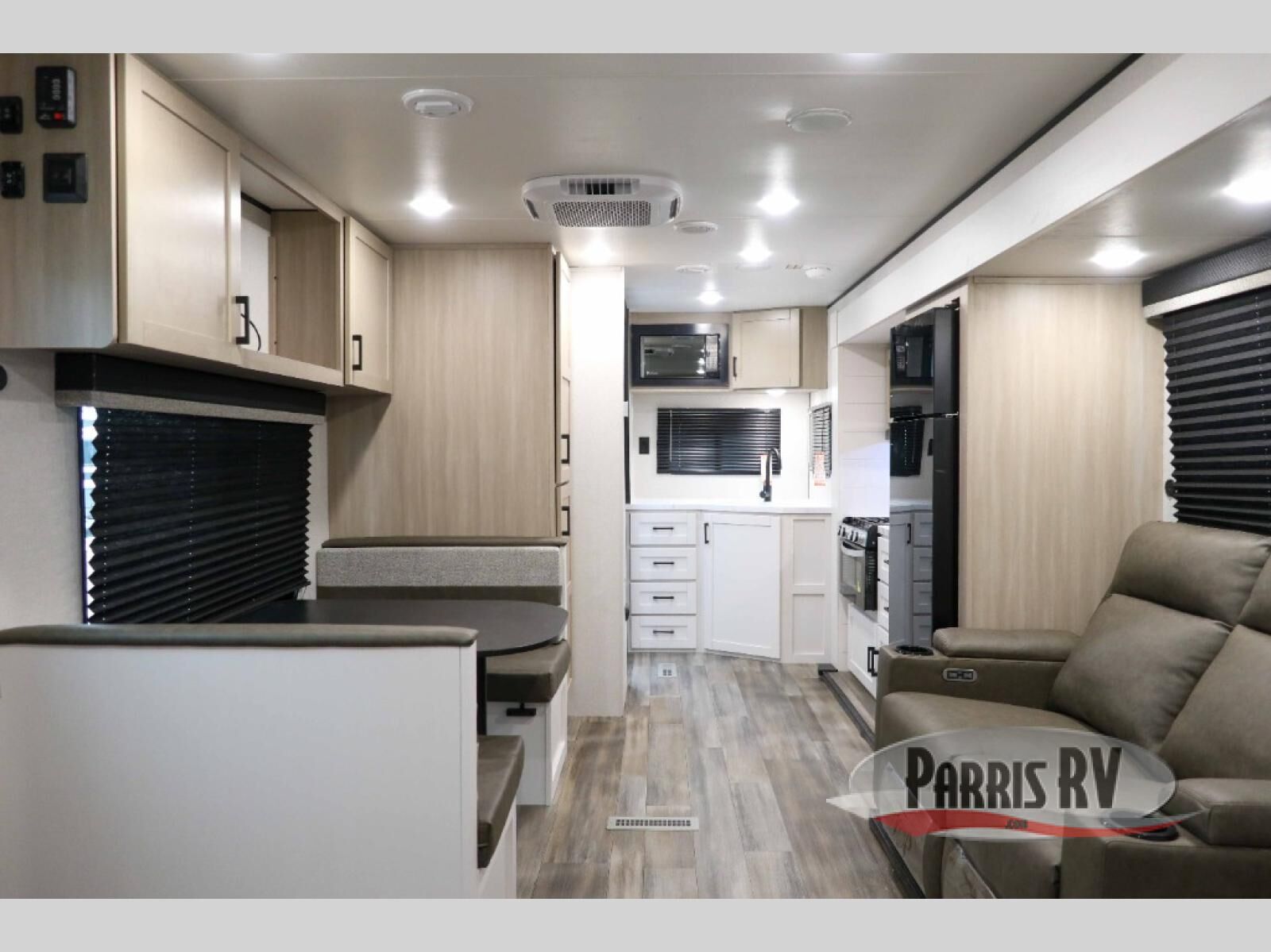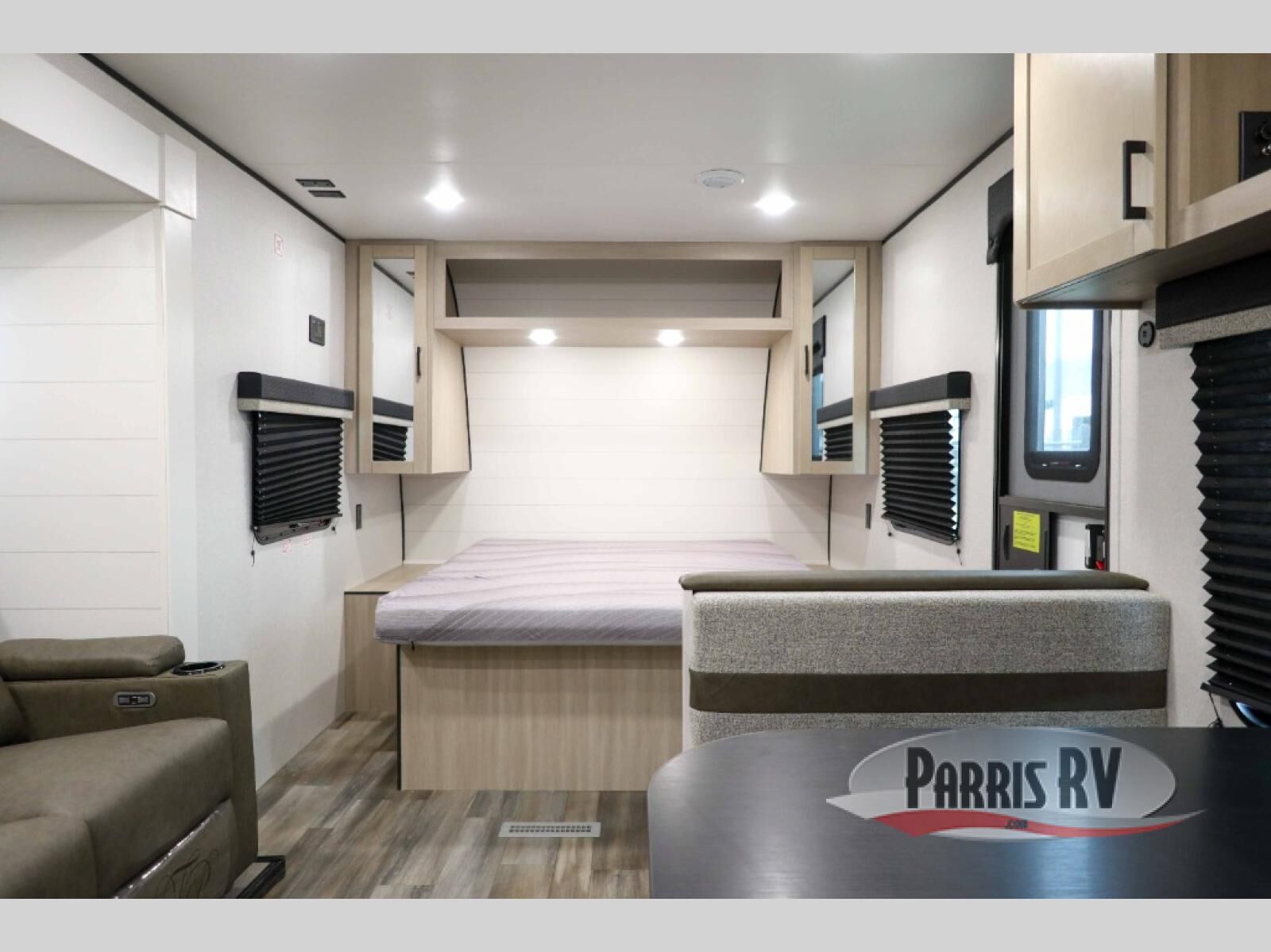 This travel trailer is perfect for weekend trips to the lake! Once you arrive at the campground, you can unload the exterior storage, put out the 18' power awning with LED lights, then relax in your camp chairs. Head inside to make lunch on the three-burner cooktop in the rear corner kitchen, and you'll find the full bath in the other rear corner for quick access. A booth dinette provides a place to dine together, and a theater seat within the large slide out is sure to bring comfort. This unit includes a queen bed in the front semi-private bedroom with a privacy curtain and dual wardrobes for your things!