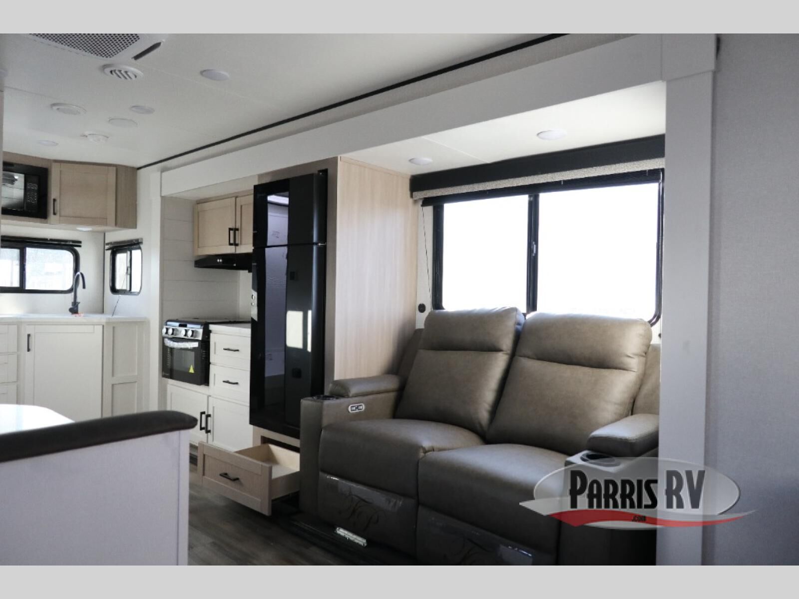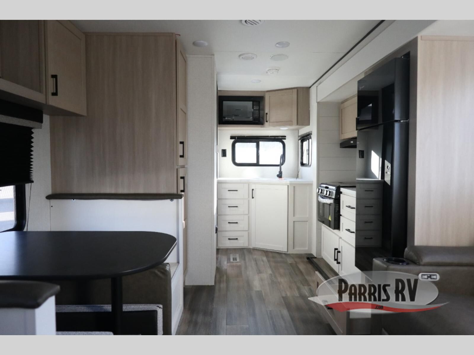 This travel trailer is perfect for weekend trips to the lake! Once you arrive at the campground, you can unload the exterior storage, put out the 18' power awning with LED lights, then relax in your camp chairs. Head inside to make lunch on the three-burner cooktop in the rear corner kitchen, and you'll find the full bath in the other rear corner for quick access. A booth dinette provides a place to dine together, and a theater seat within the large slide out is sure to bring comfort. This unit includes a queen bed in the front semi-private bedroom with a privacy curtain and dual wardrobes for your things!