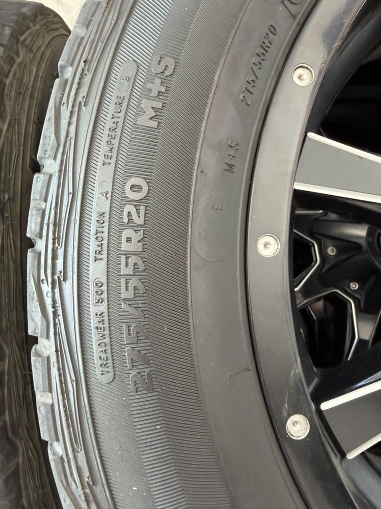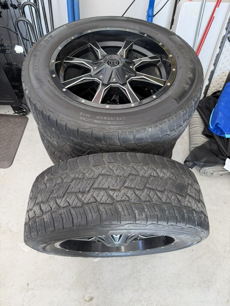 Set of 20-inch wheels and Big O Big Foot A/T tires in great condition. Tires are size 275/55R20 and have good tread remaining. Wheels are clean and straight with normal light wear from use.