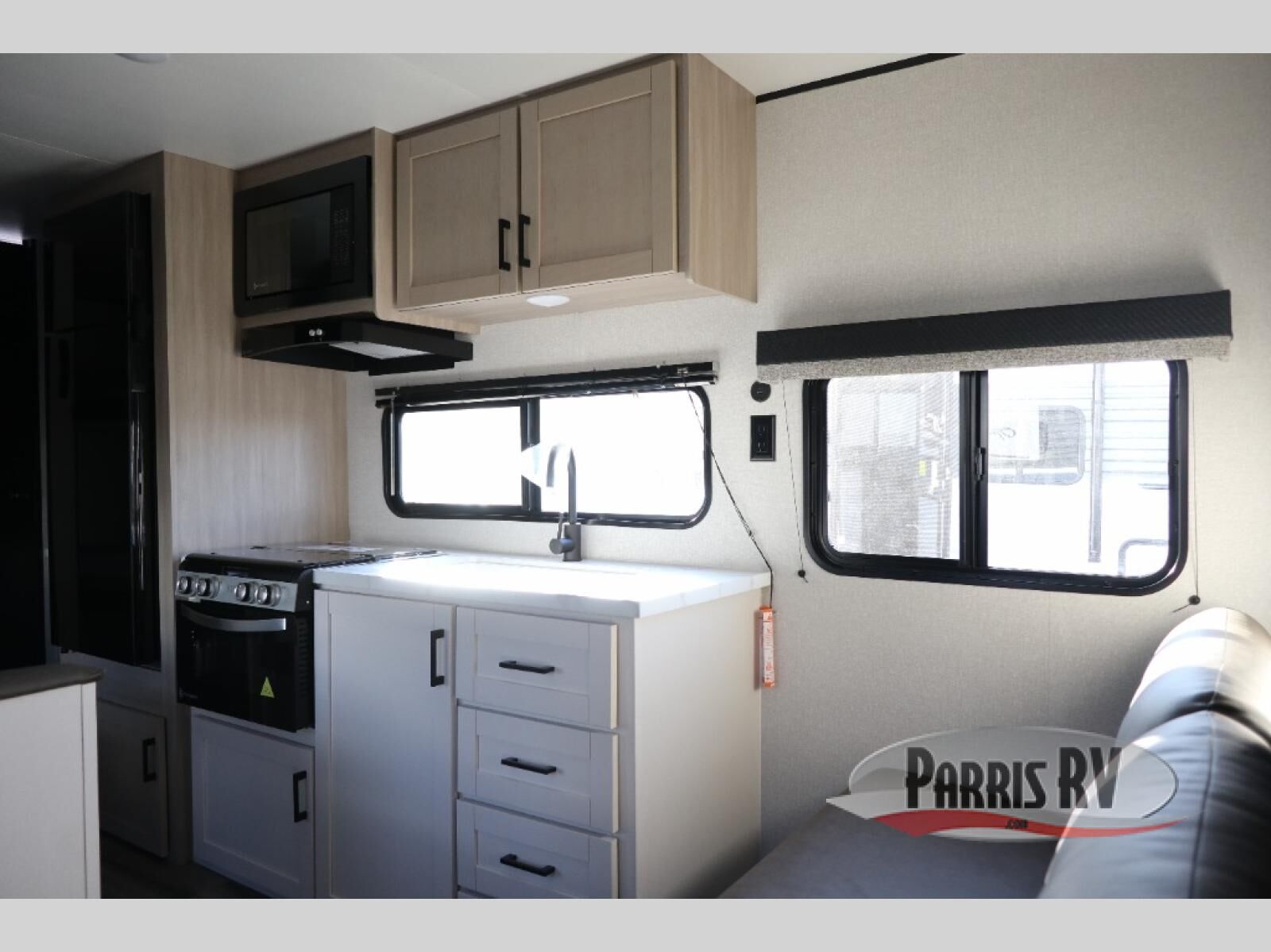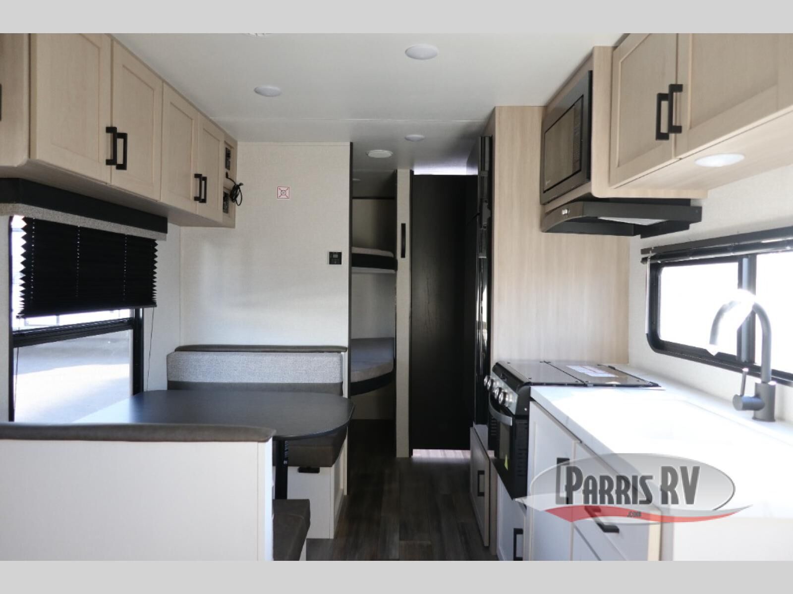 If you enjoy camping with a larger group, this travel trailer is perfect for you! There are double-size bunks in the back, which are right next to the private bath with a toilet and 40" tub/shower. You can take the front RV queen bed with dual wardrobes and a privacy curtain, and any other guests can convert the sofa and booth dinette to sleeping space. A three-burner cooktop will let you make breakfast for everyone in the morning, and a 12V refrigerator will keep your perishables fresh!