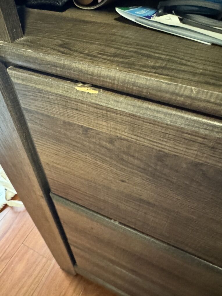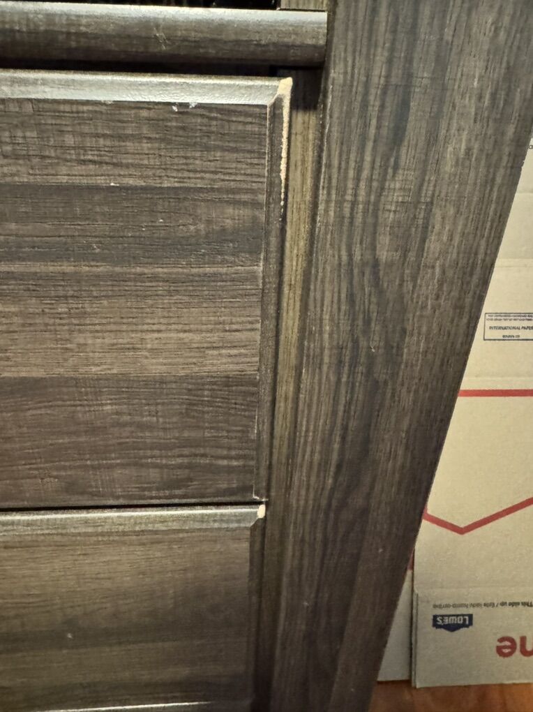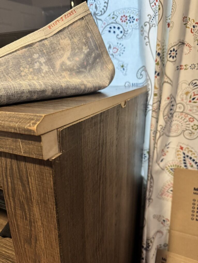 VenmoThis dresser is 44” high, 44” tall, and 17” deep (according to the Measure app on my phone) (which I think works but had never used it before.) It is super heavy, a little chipped, but works great. Drawers open and close smoothly. Three drawers and then two open spots. Idk what they are supposed to be for. I use them to store my records and board games. The top part was too wide to fit in my closet, so we cut an inch off each side. (See pics.) I just put a runner over it.