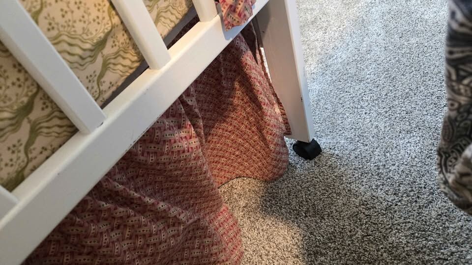 White crib with removable wheels (legs can be taken off for added stability).