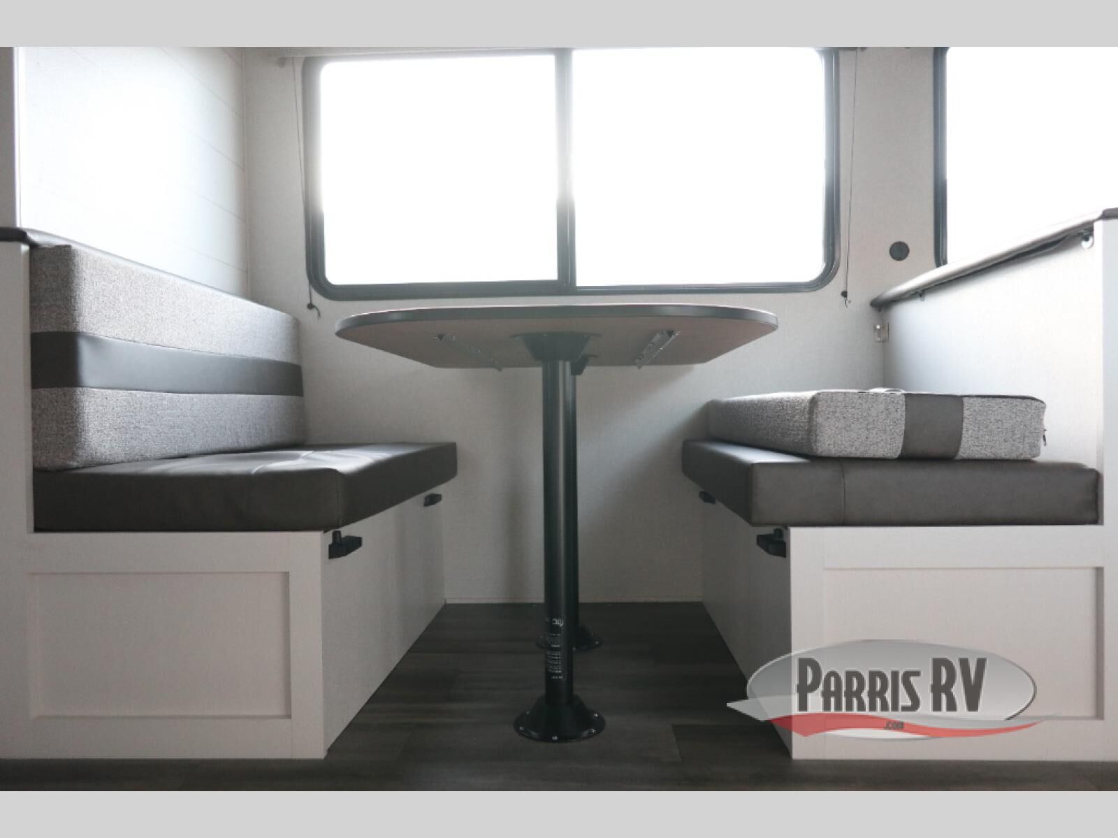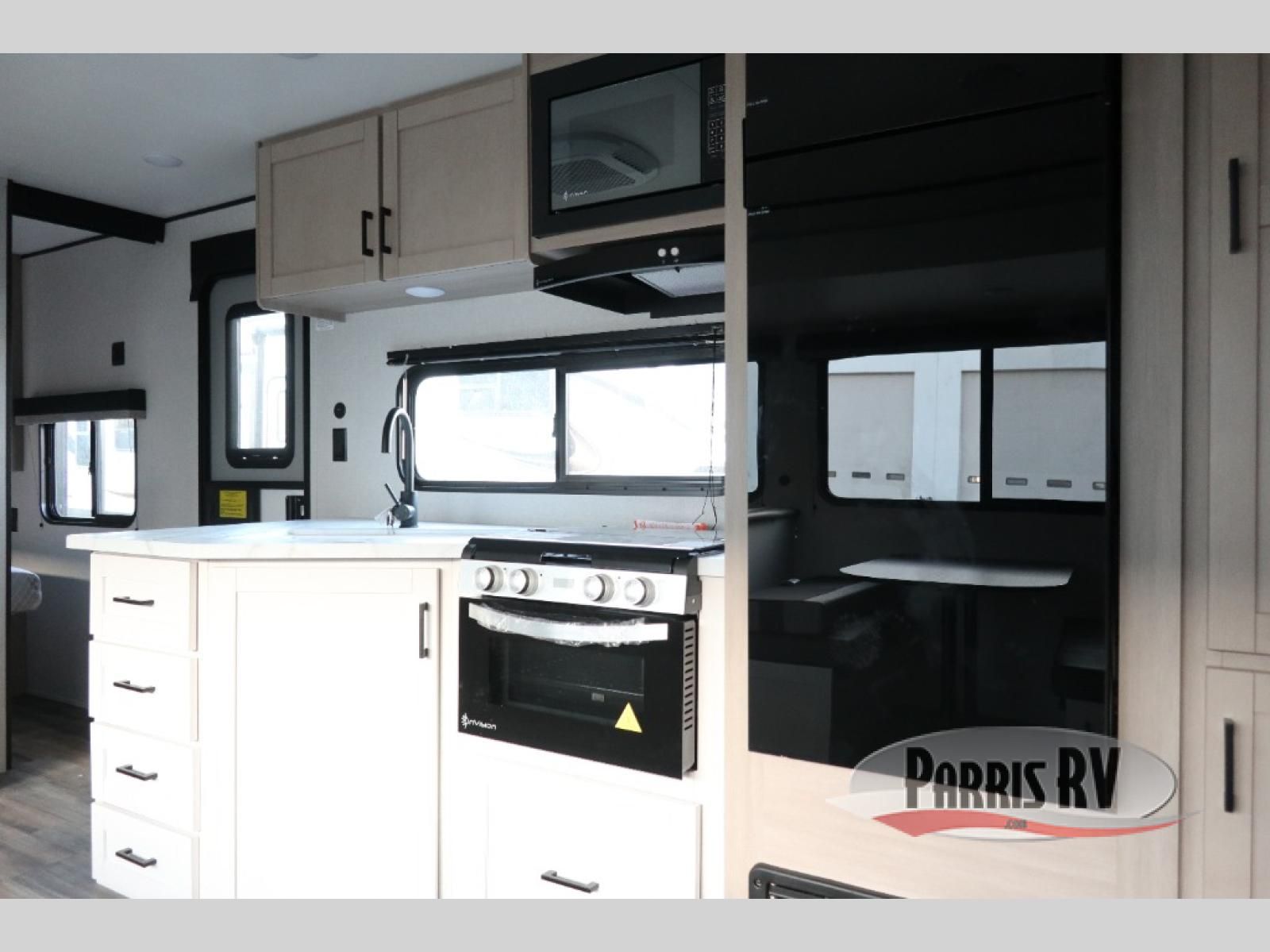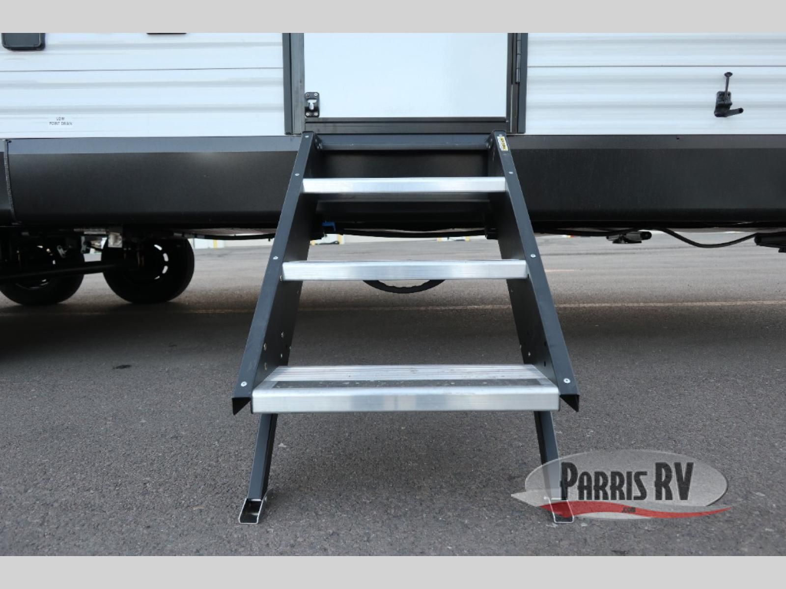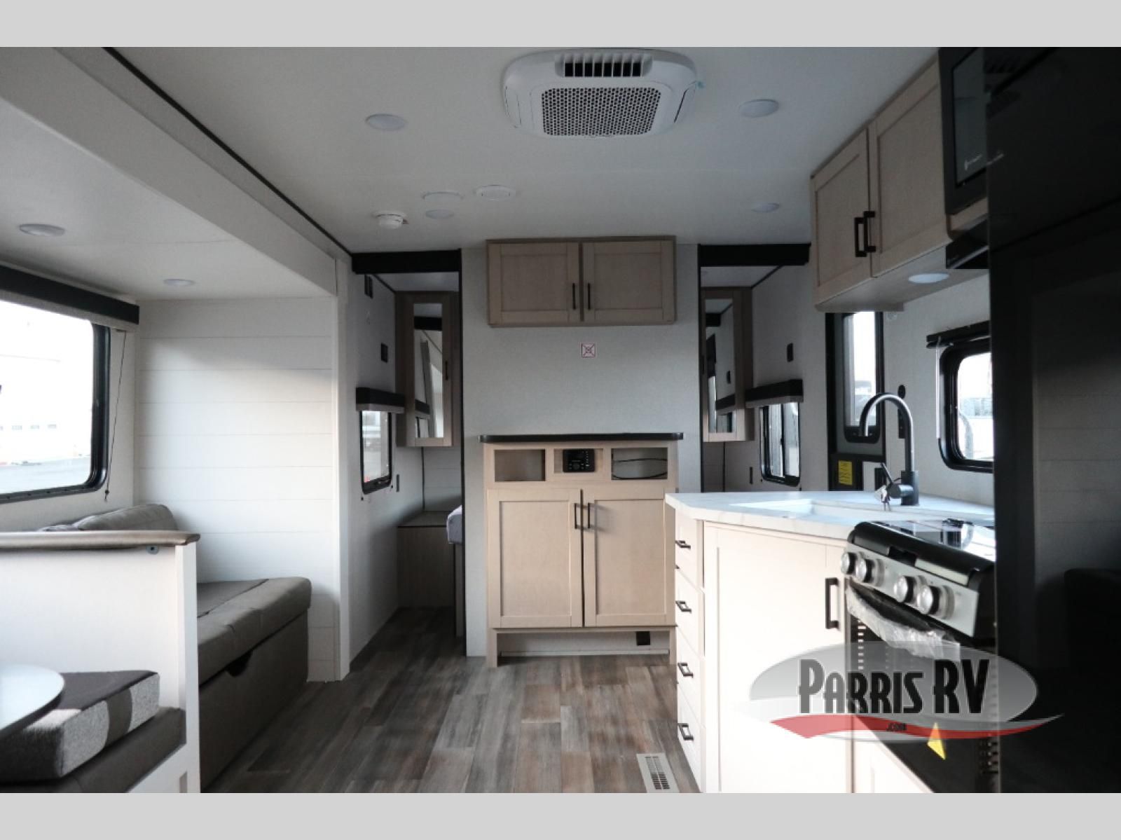 This travel trailer with double-size bunks is spacious and cozy! Once you've unloaded the exterior storage, your crew can put out the 16' power awning with LED lights, then start lunch on the outside kitchen. If the weather isn't cooperating, there is a three-burner cooktop and microwave oven inside, plus comfortable seating on the jack-knife sofa and booth dinette. You're sure to appreciate the front private bedroom with an RV queen bed, dual wardrobes, plus an overhead shelf for books, and the rear corner full bath will let everyone freshen up each day!