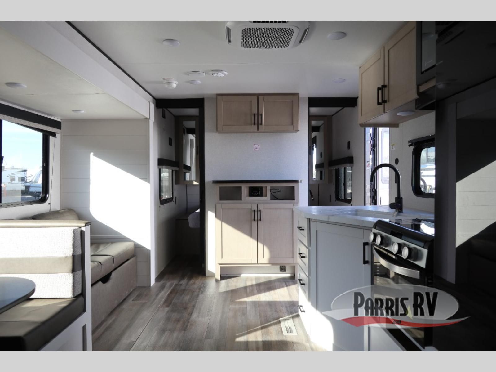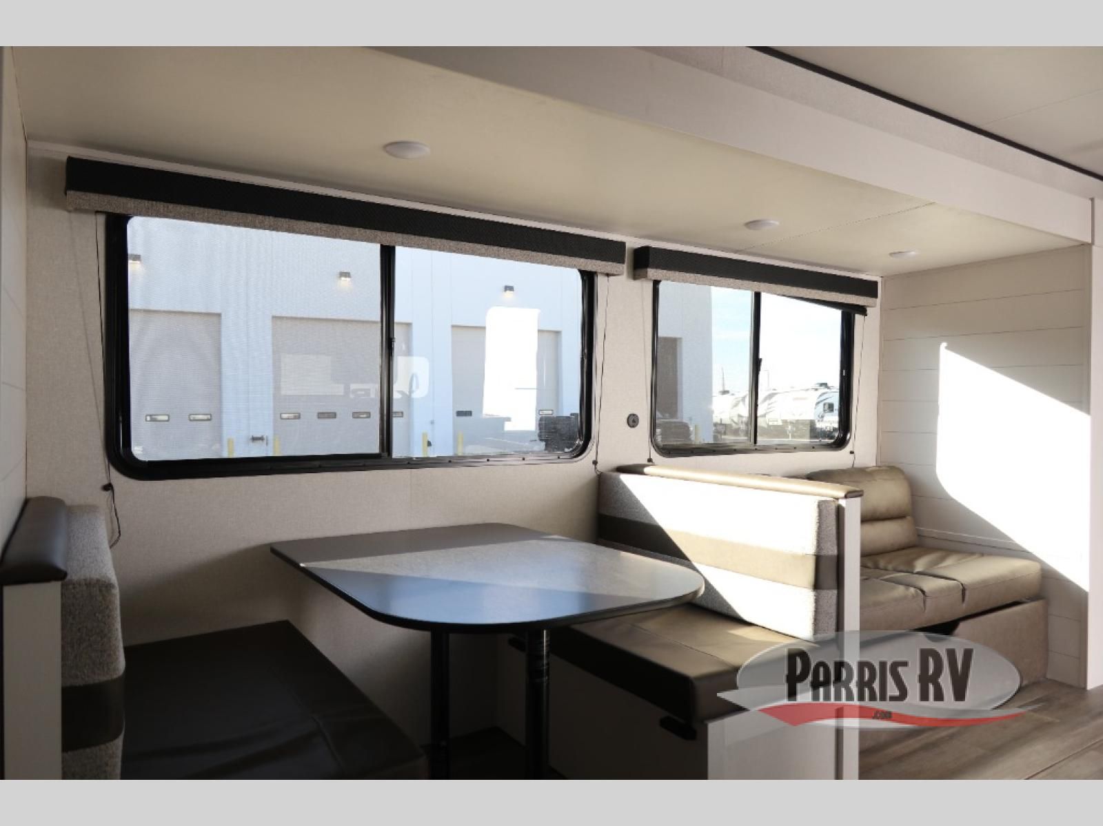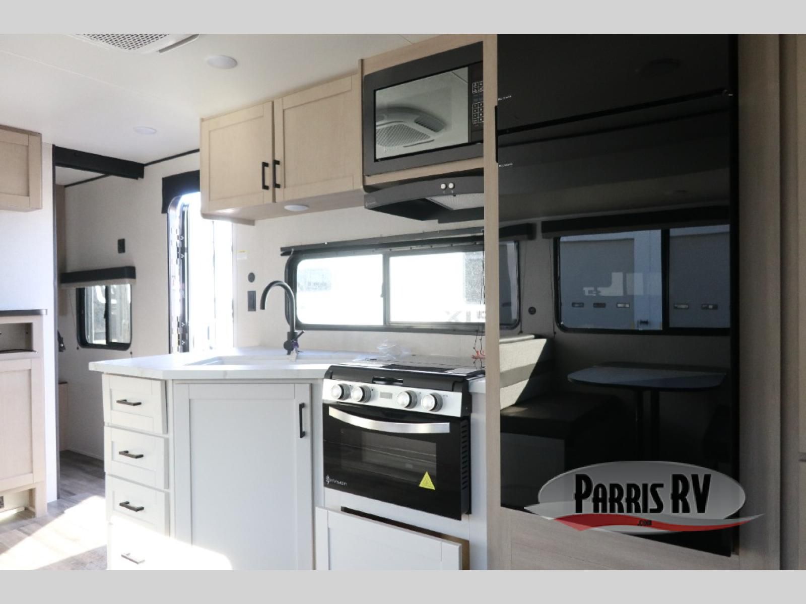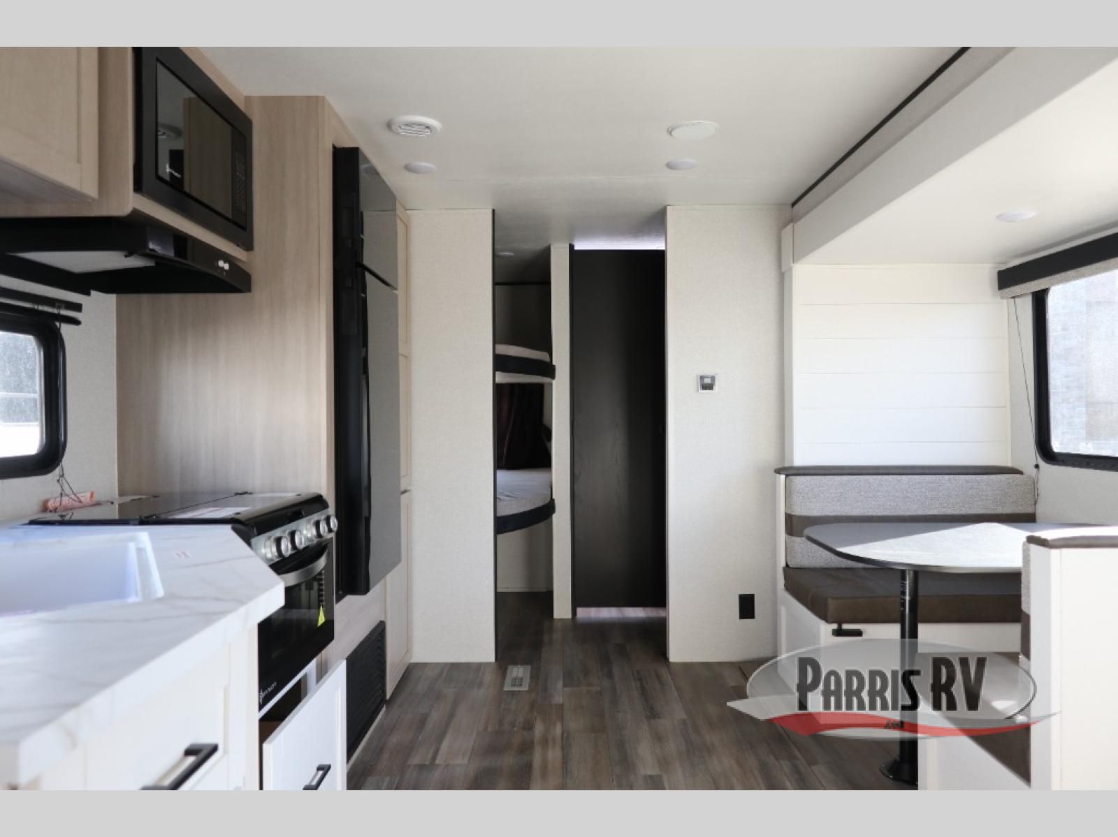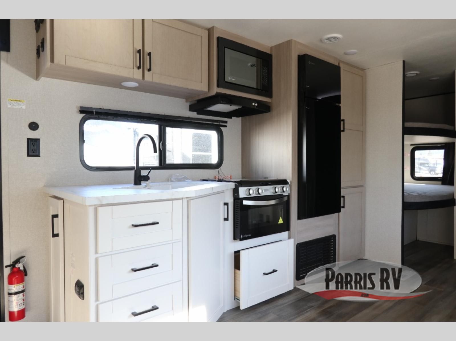 This travel trailer with double-size bunks is spacious and cozy! Once you've unloaded the exterior storage, your crew can put out the 16' power awning with LED lights, then start lunch on the outside kitchen. If the weather isn't cooperating, there is a three-burner cooktop and microwave oven inside, plus comfortable seating on the jack-knife sofa and booth dinette. You're sure to appreciate the front private bedroom with an RV queen bed, dual wardrobes, plus an overhead shelf for books, and the rear corner full bath will let everyone freshen up each day!