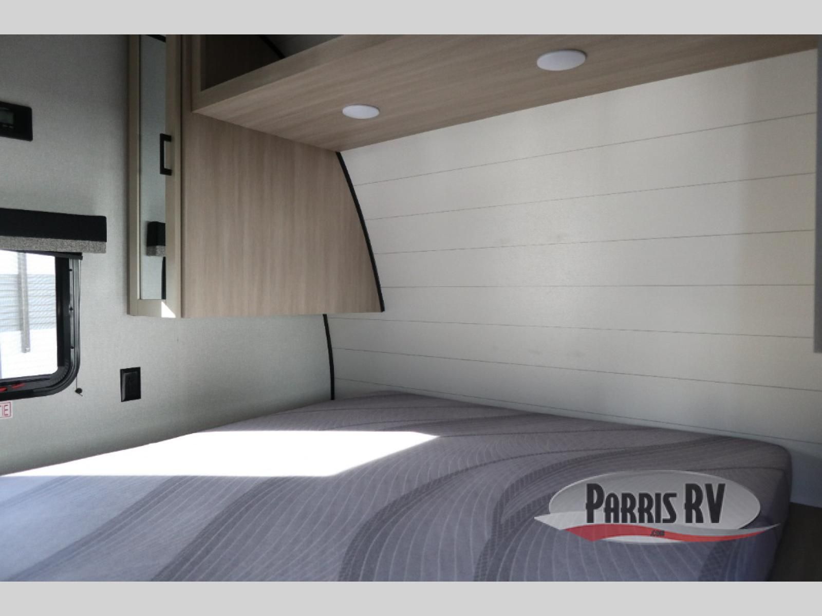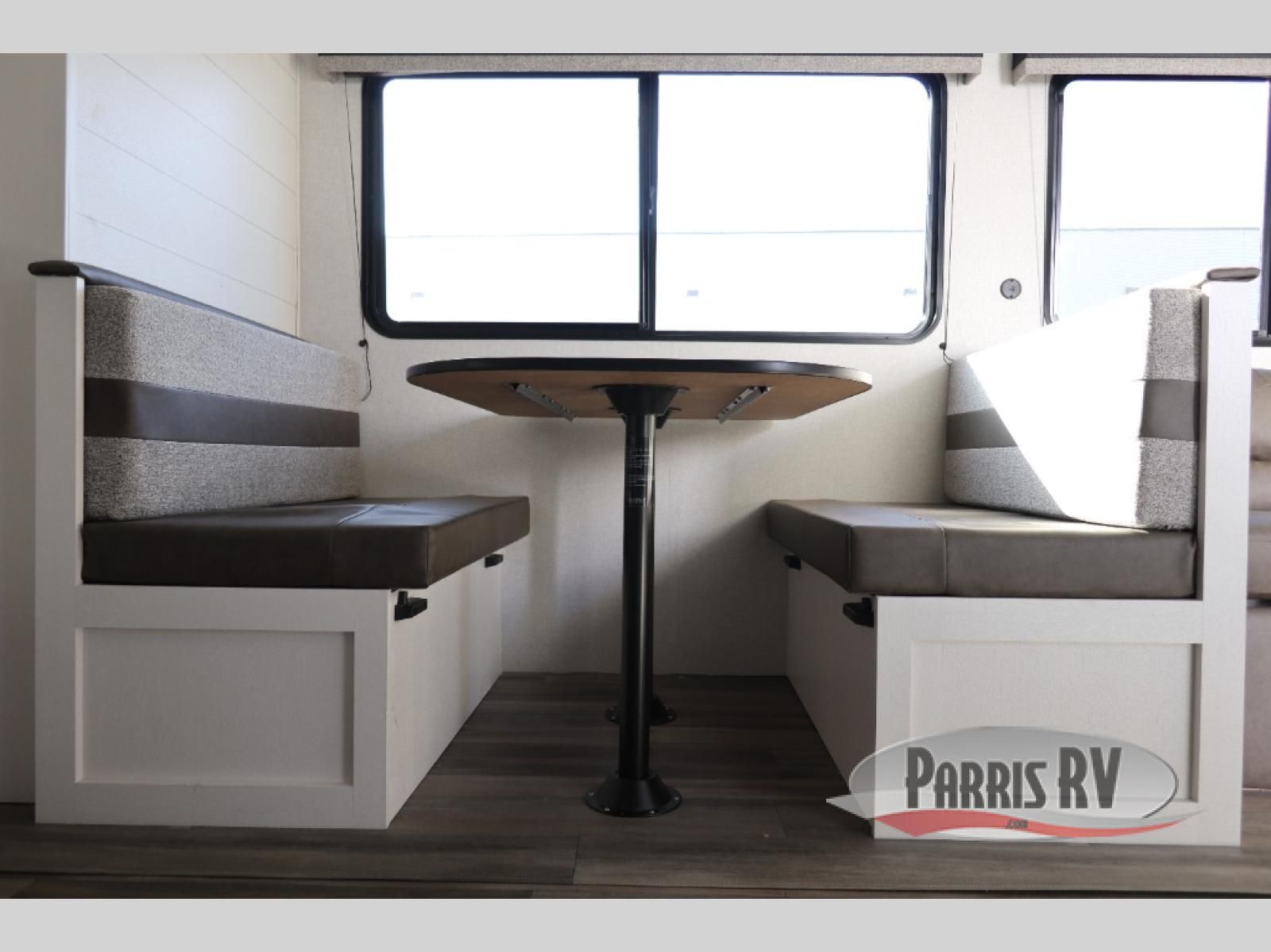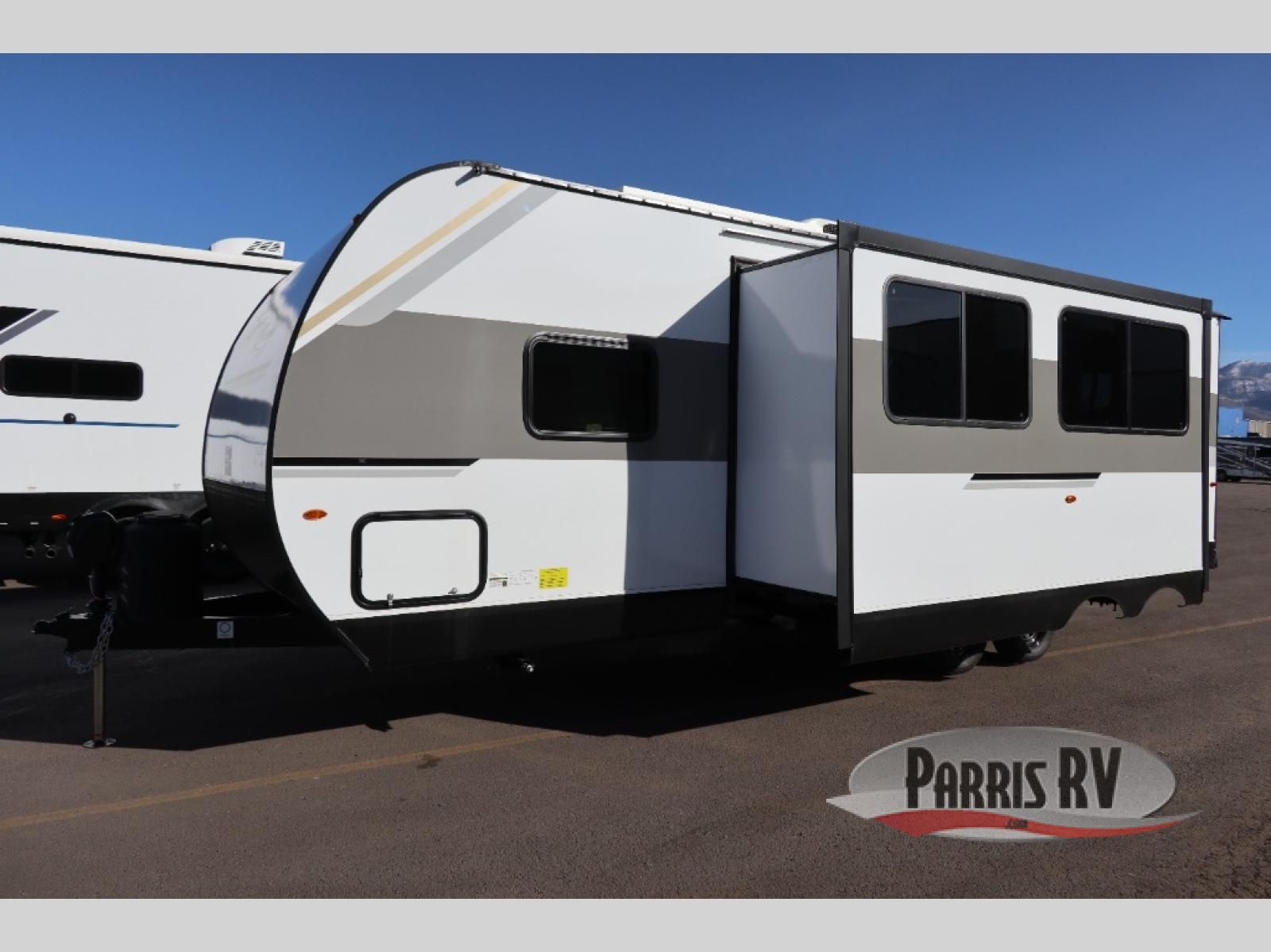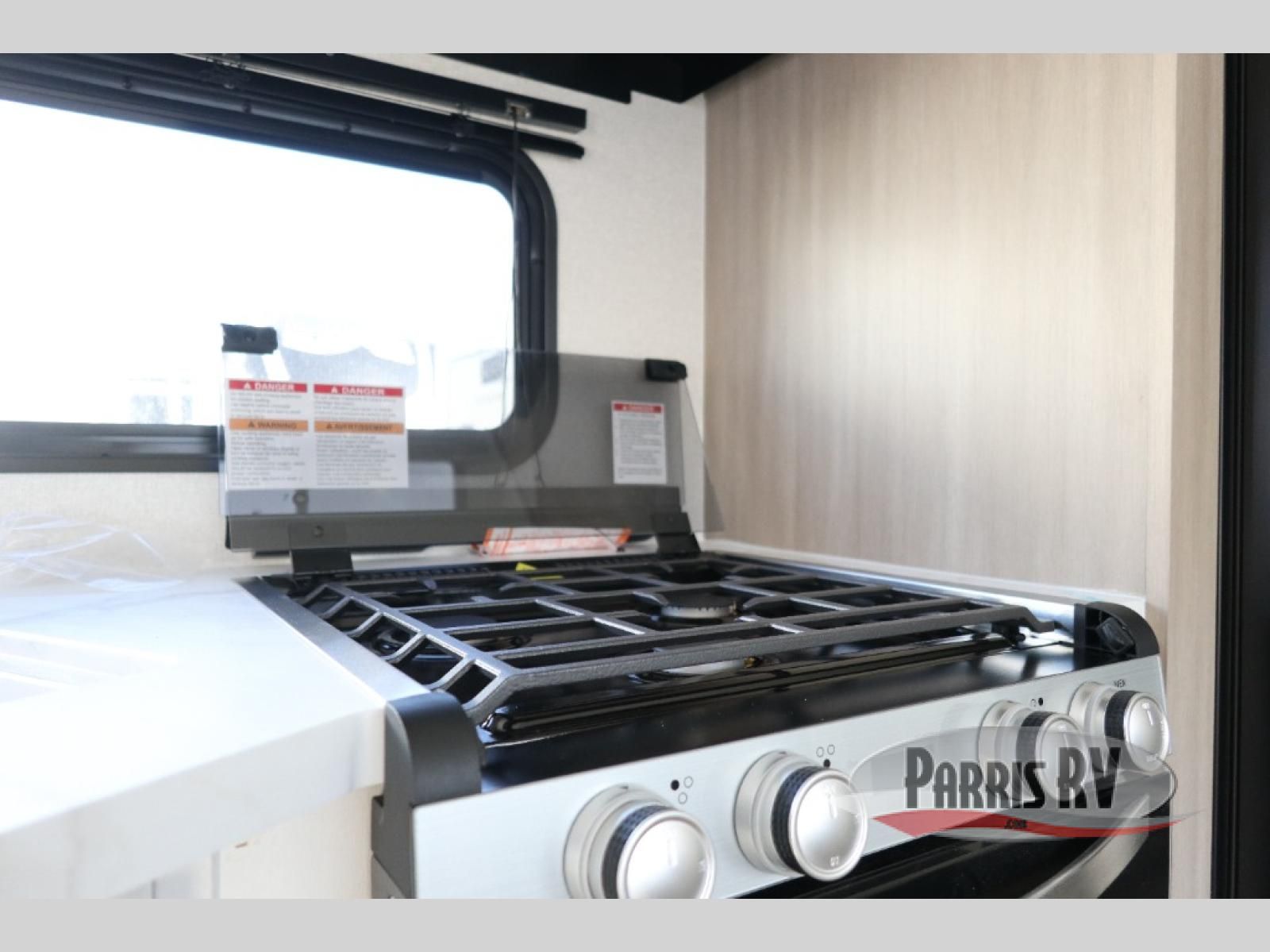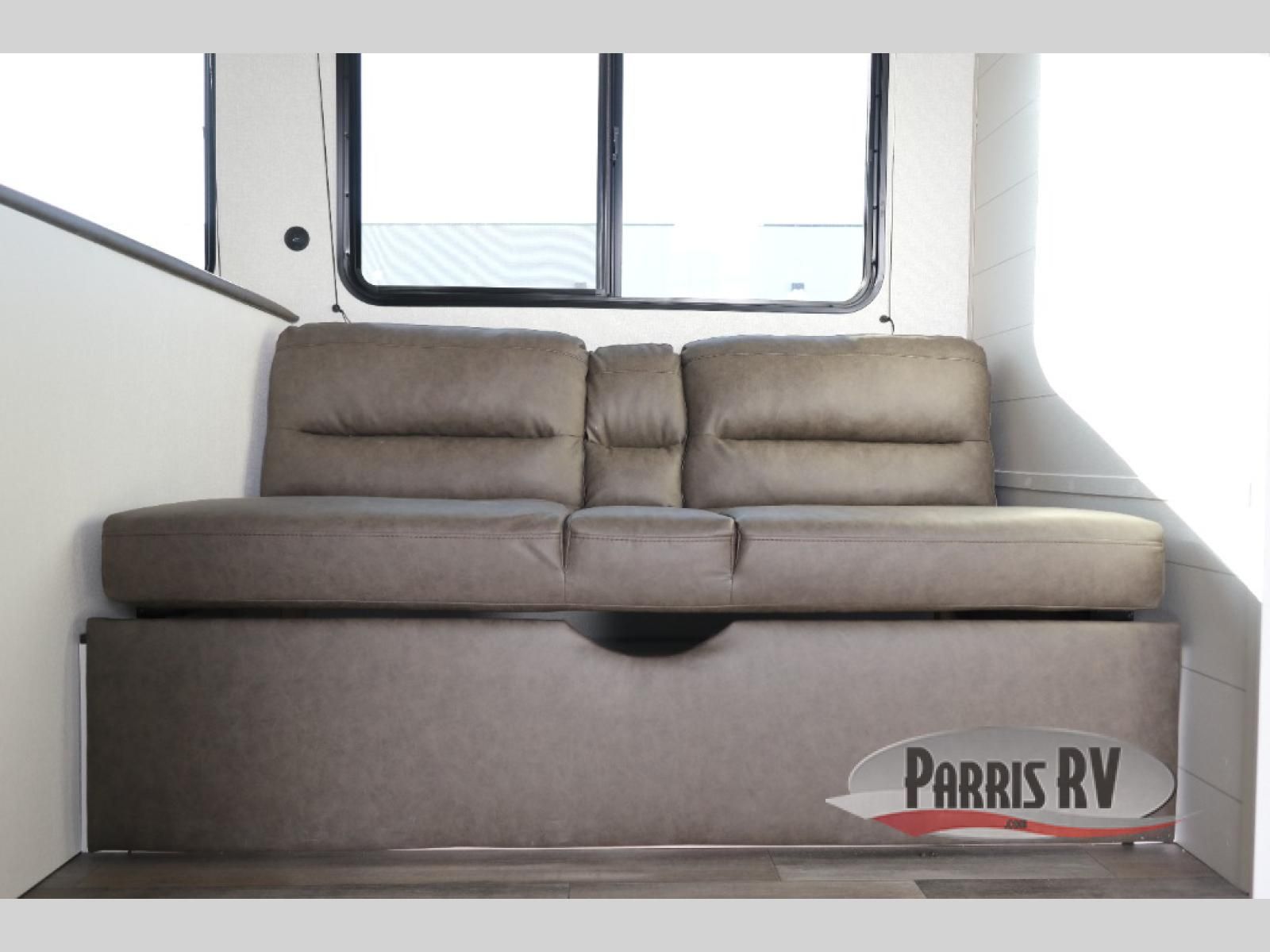 This travel trailer with double-size bunks is spacious and cozy! Once you've unloaded the exterior storage, your crew can put out the 16' power awning with LED lights, then start lunch on the outside kitchen. If the weather isn't cooperating, there is a three-burner cooktop and microwave oven inside, plus comfortable seating on the jack-knife sofa and booth dinette. You're sure to appreciate the front private bedroom with an RV queen bed, dual wardrobes, plus an overhead shelf for books, and the rear corner full bath will let everyone freshen up each day!
