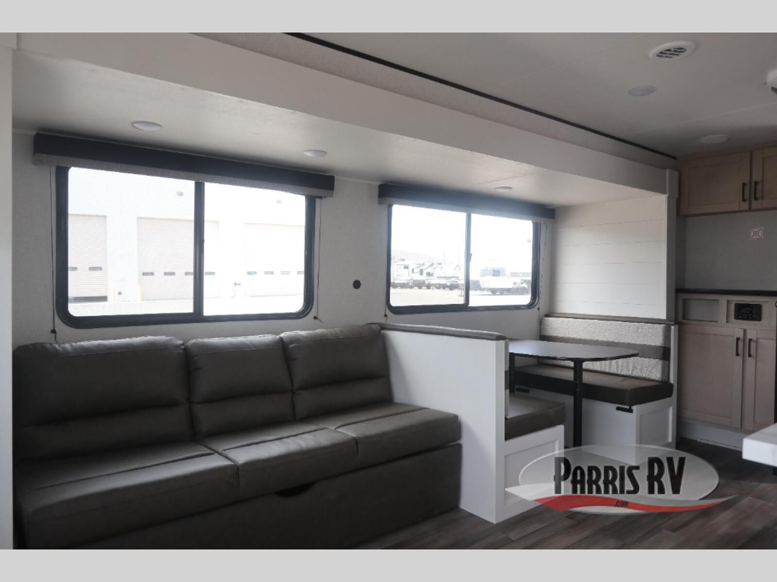 With dual entry doors in this unit, you can enter in through the front master bedroom or the rear living room! The dual lounge chairs in the back will let you relax with a book and your coffee, and there is a large slide out with a jack-knife sofa and booth dinette for additional seating spaces. The chef of your group can make meals on the three-burner cooktop or in the microwave oven, and there is a pantry for dry goods or snacks. The walk-thru bath is easily accessible for everyone to use, and the front master bedroom with a 60" x 74" RV queen bed will make you feel right at home!