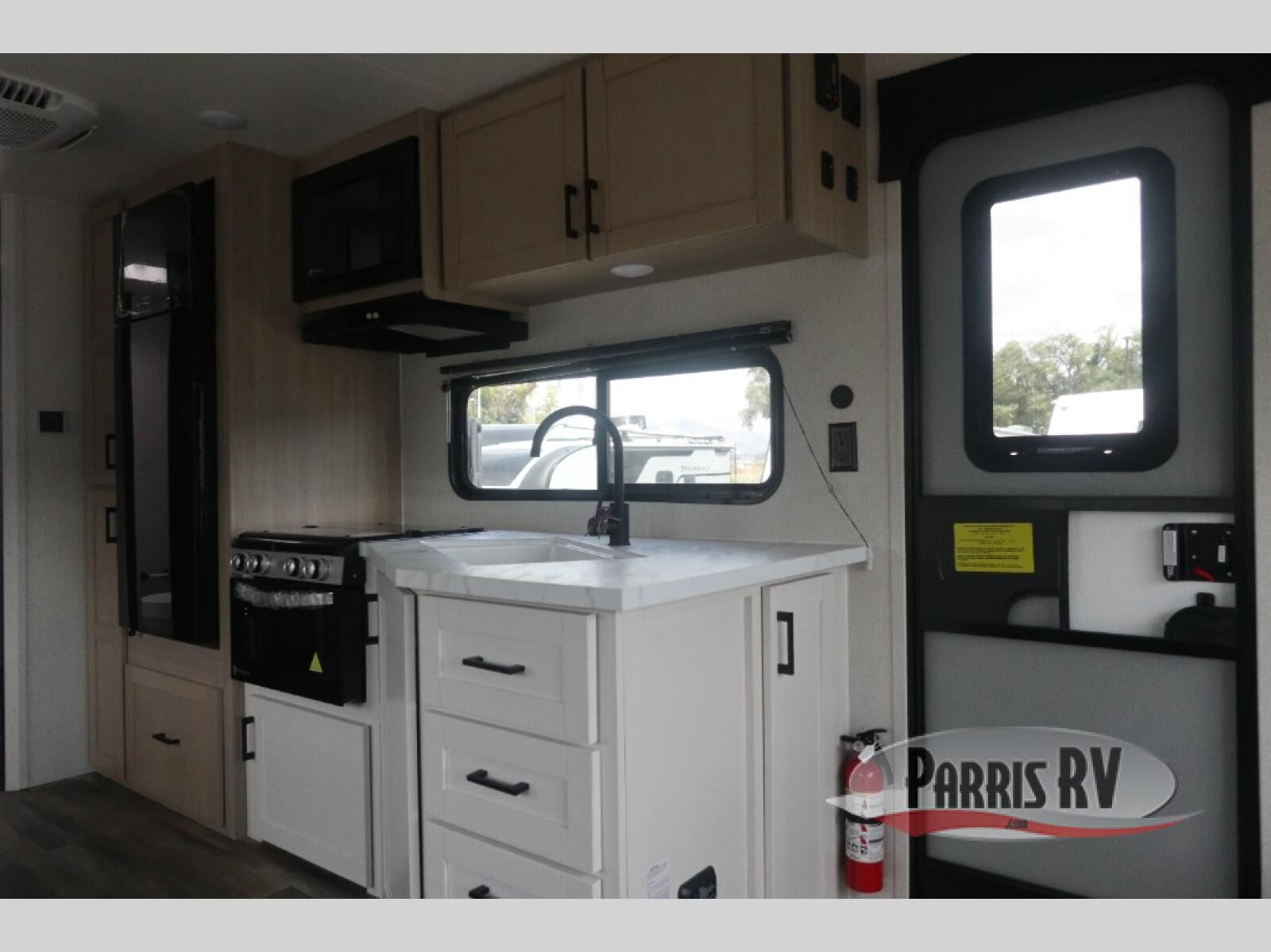 With dual entry doors in this unit, you can enter in through the front master bedroom or the rear living room! The dual lounge chairs in the back will let you relax with a book and your coffee, and there is a large slide out with a jack-knife sofa and booth dinette for additional seating spaces. The chef of your group can make meals on the three-burner cooktop or in the microwave oven, and there is a pantry for dry goods or snacks. The walk-thru bath is easily accessible for everyone to use, and the front master bedroom with a 60" x 74" RV queen bed will make you feel right at home!