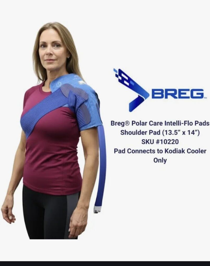 PayPalBrand new. Still in original packaging .The Breg Intelli-Flo Shoulder Pad is a machine-cooled, reusable cold therapy pad designed for use with the Breg Polar Care Kodiak unit. It provides, on average, 13-1/2 X 14 inches of coverage for the shoulder, utilizing ergonomic, contoured design with hook-and-loop straps to treat post-surgical or injury-related pain. Exclusively designed for the Breg Polar Care Kodiak. Standard size (13.5 x 14) fits most. Reusable pad featuring targeted cold delivery and built-in insulation. Fits both the left and right shoulder. The pad is ideal for reducing swelling and managing pain after surgeries like arthroscopic procedures, often used in conjunction with the Kodiak unit to maintain consistent temperature.