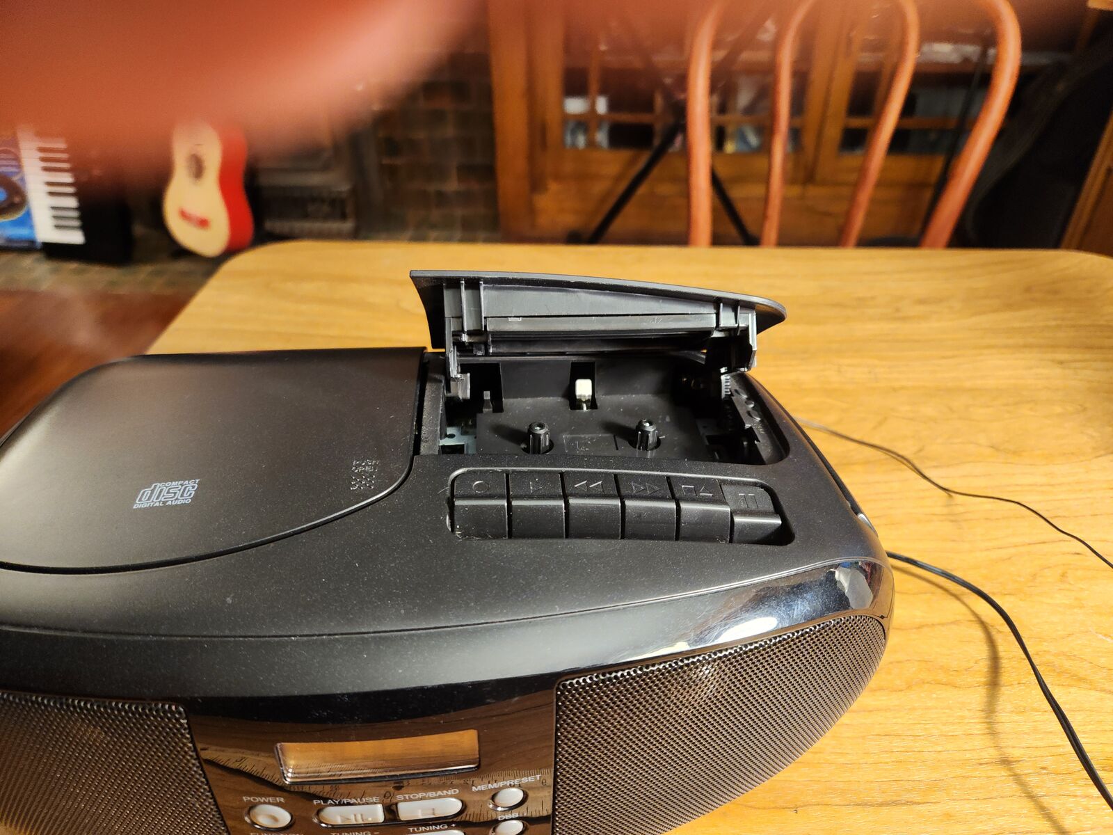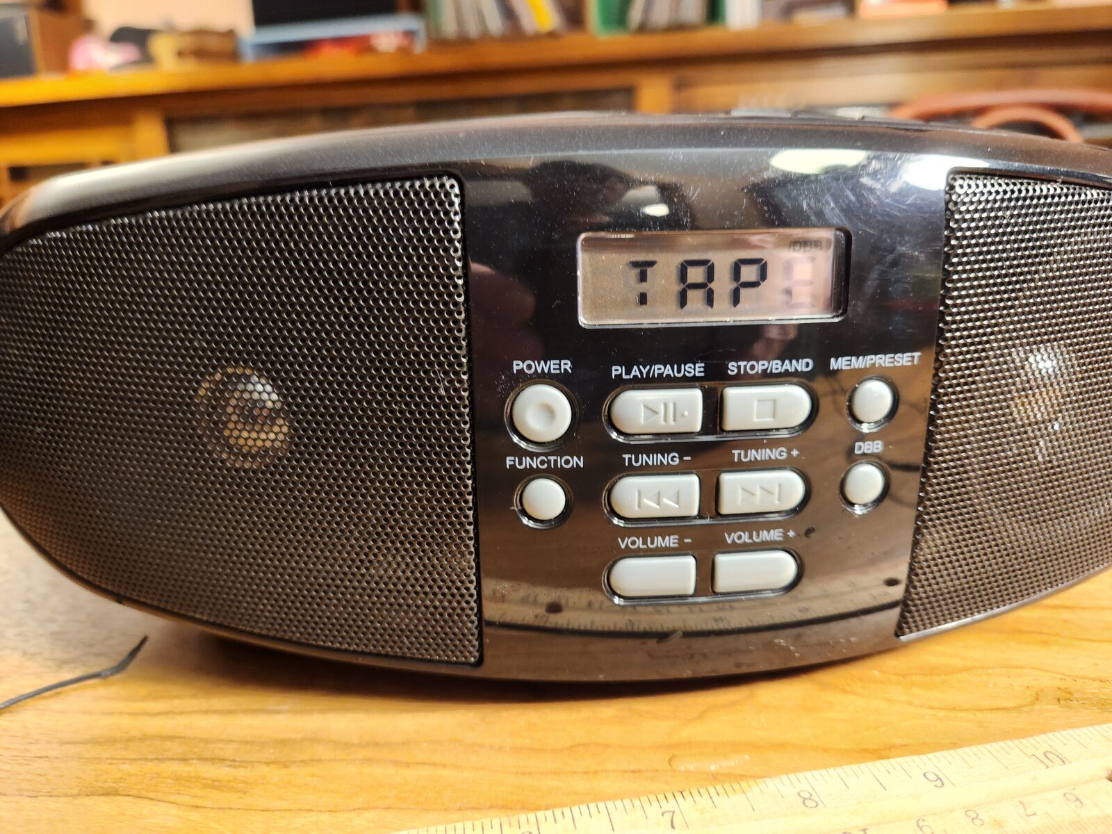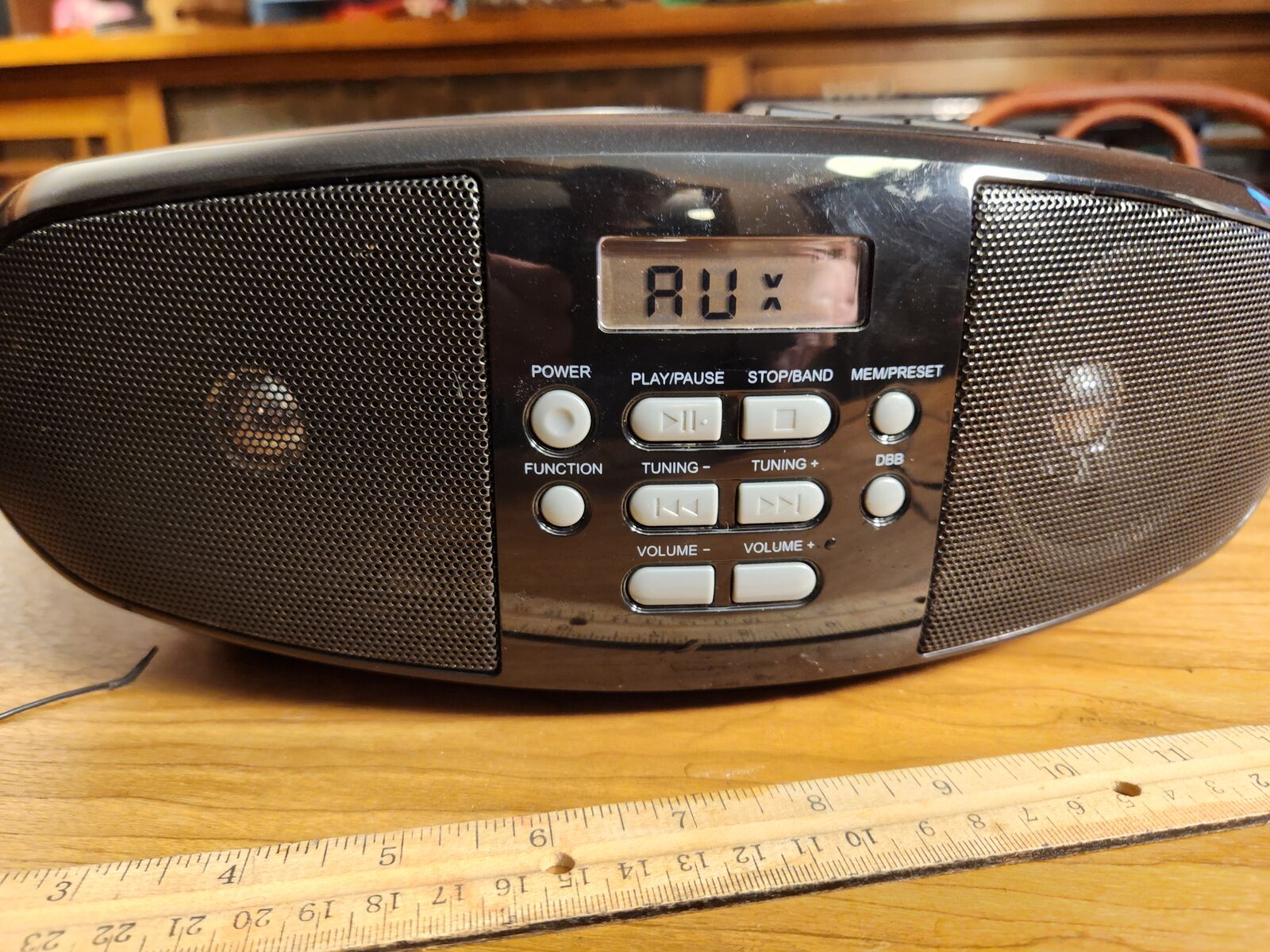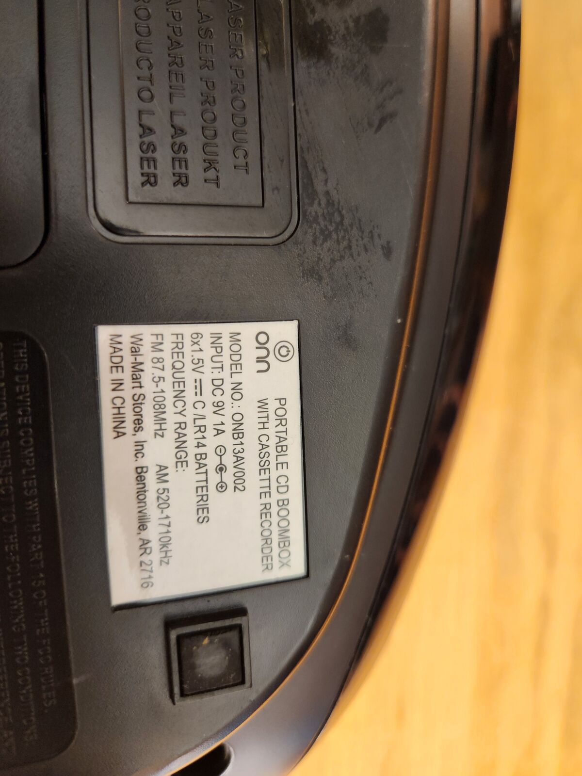 ONN boom box with Radio, CD, Tape, and Auxiliarry input. Everything works great.