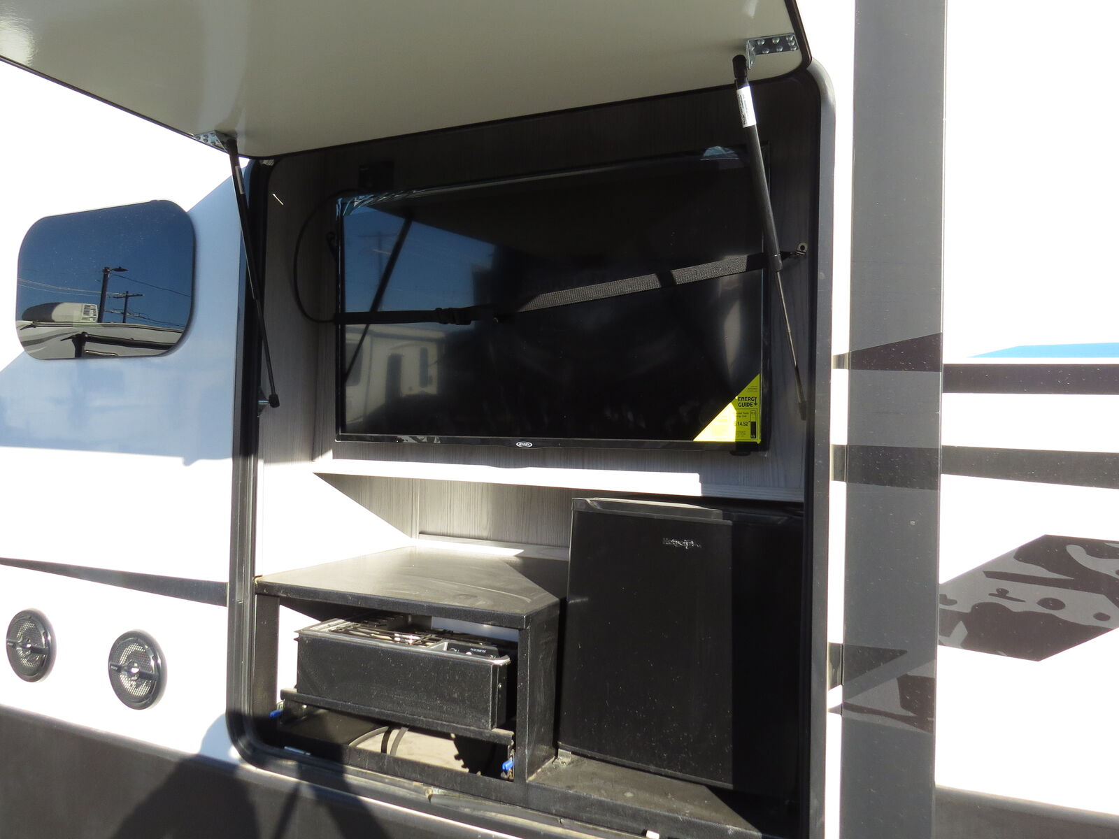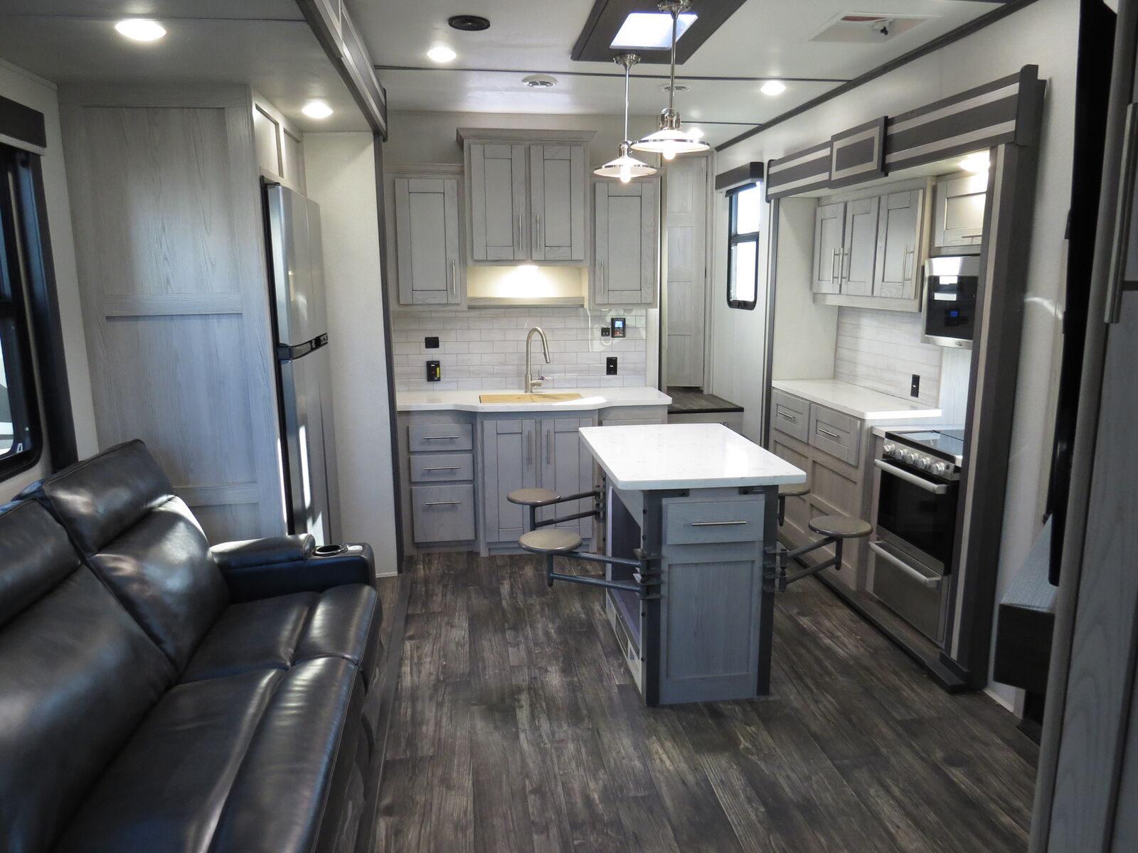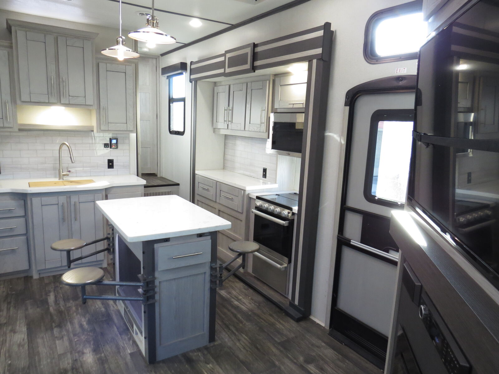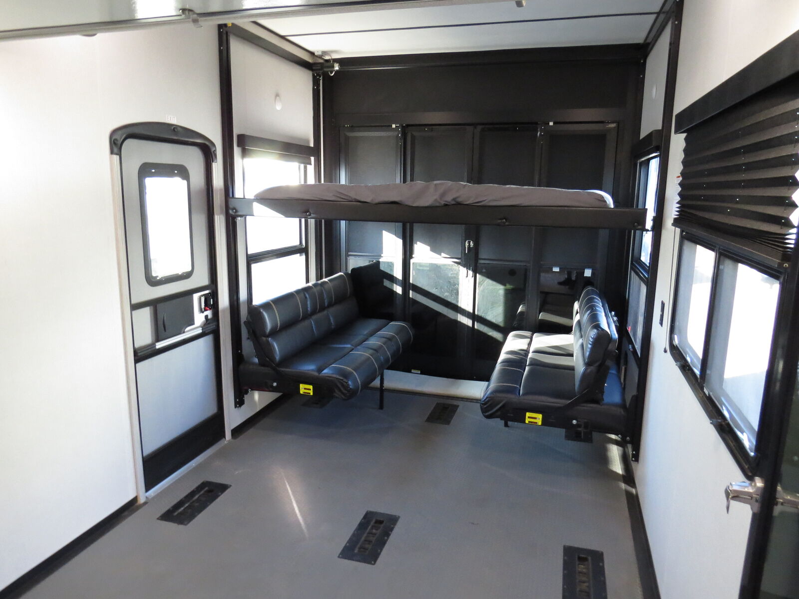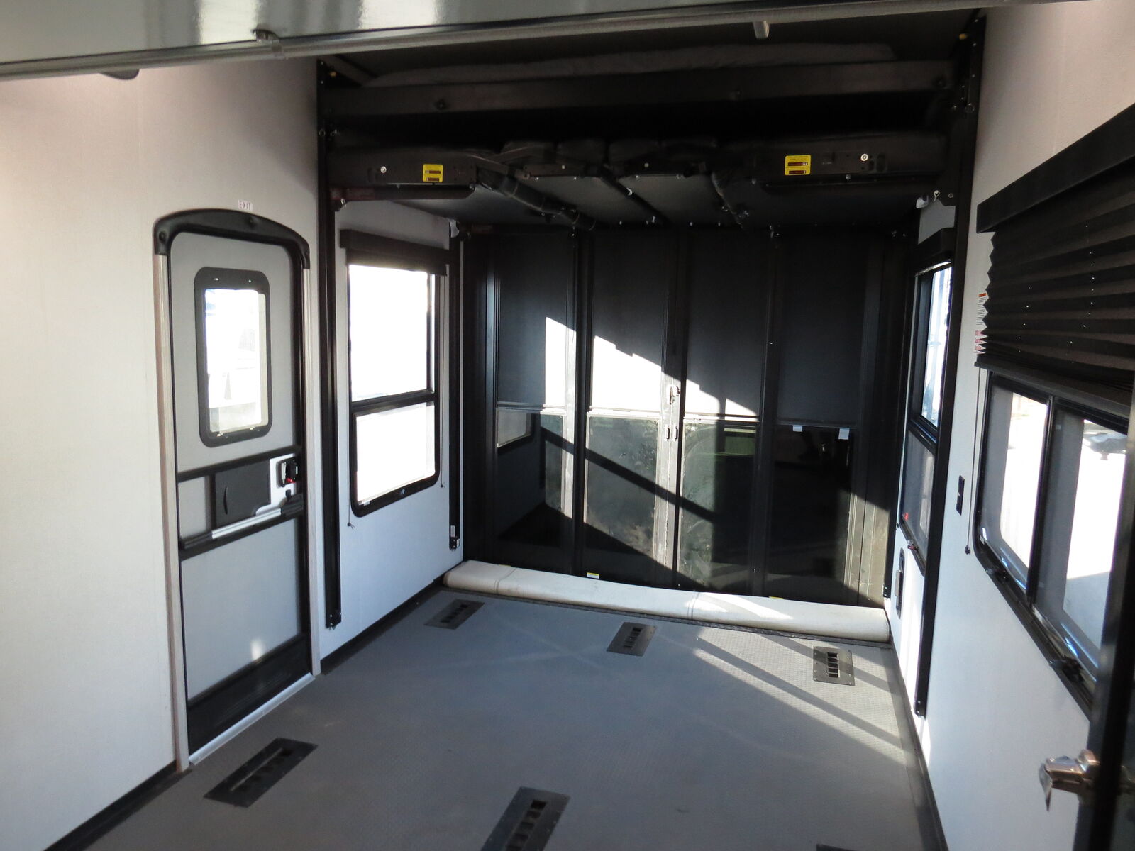 14' 6" Separate Garage!, 3 slides, SOLAR!, Generator 5500 Watt, Fuel station, Big Couch & Fridge SLIDE! Big Couch Slide, Lots of storage, Rear double electric beds (Bottom bed makes into Booth Dinette), Big island with 4 Swing Stools, Kitchen Slide, Front KING Bed Slide, Double Electric patio awnings, Fiberglass exterior, (3) A/C units and Heat.