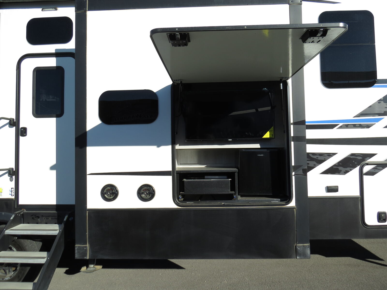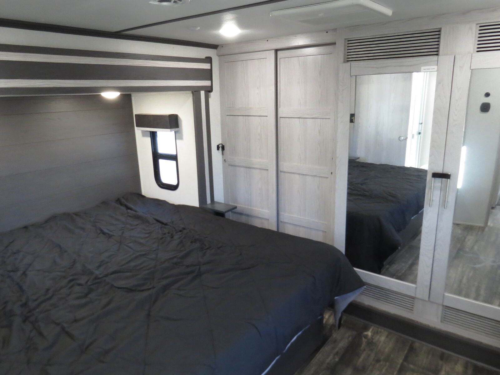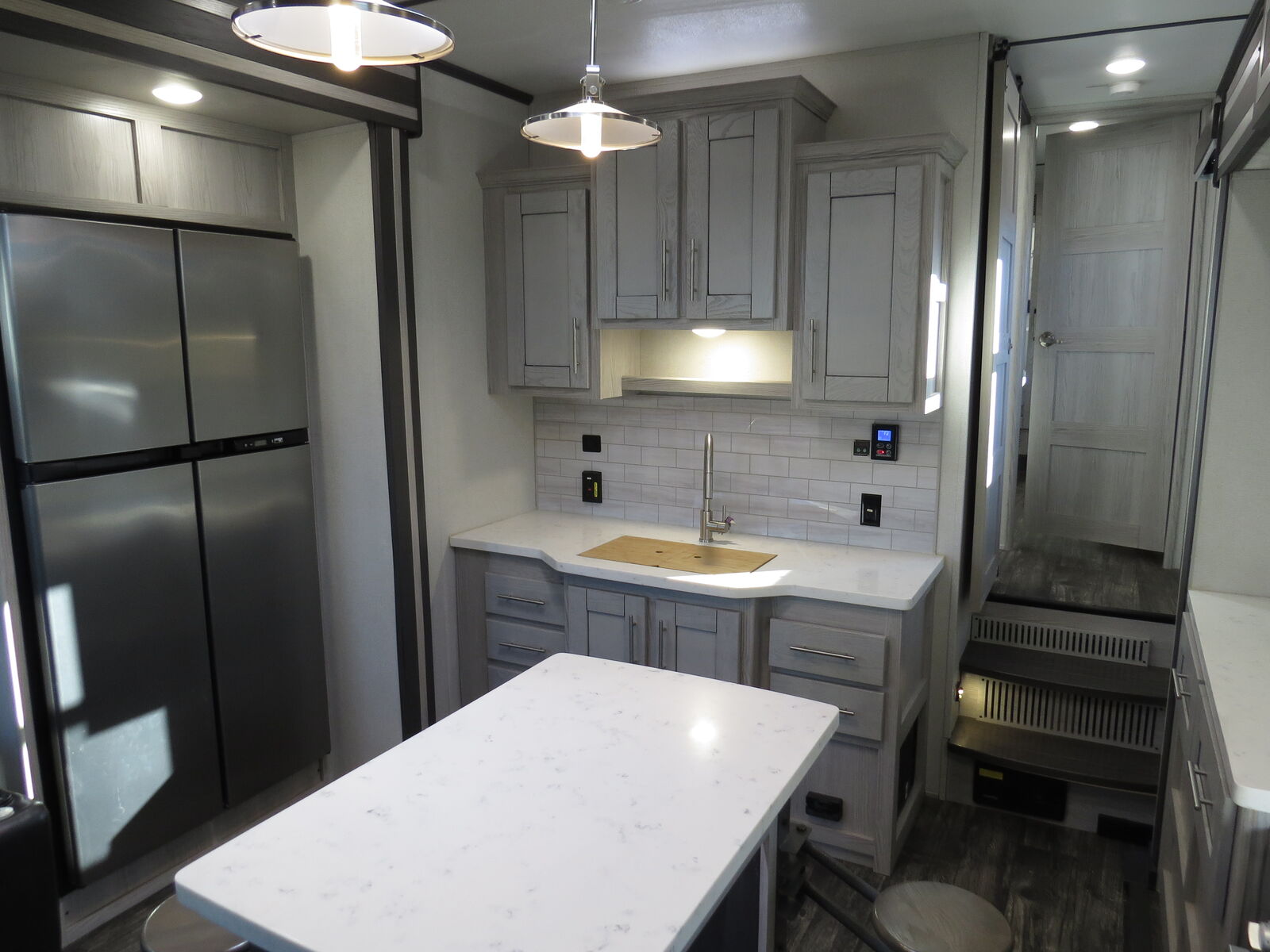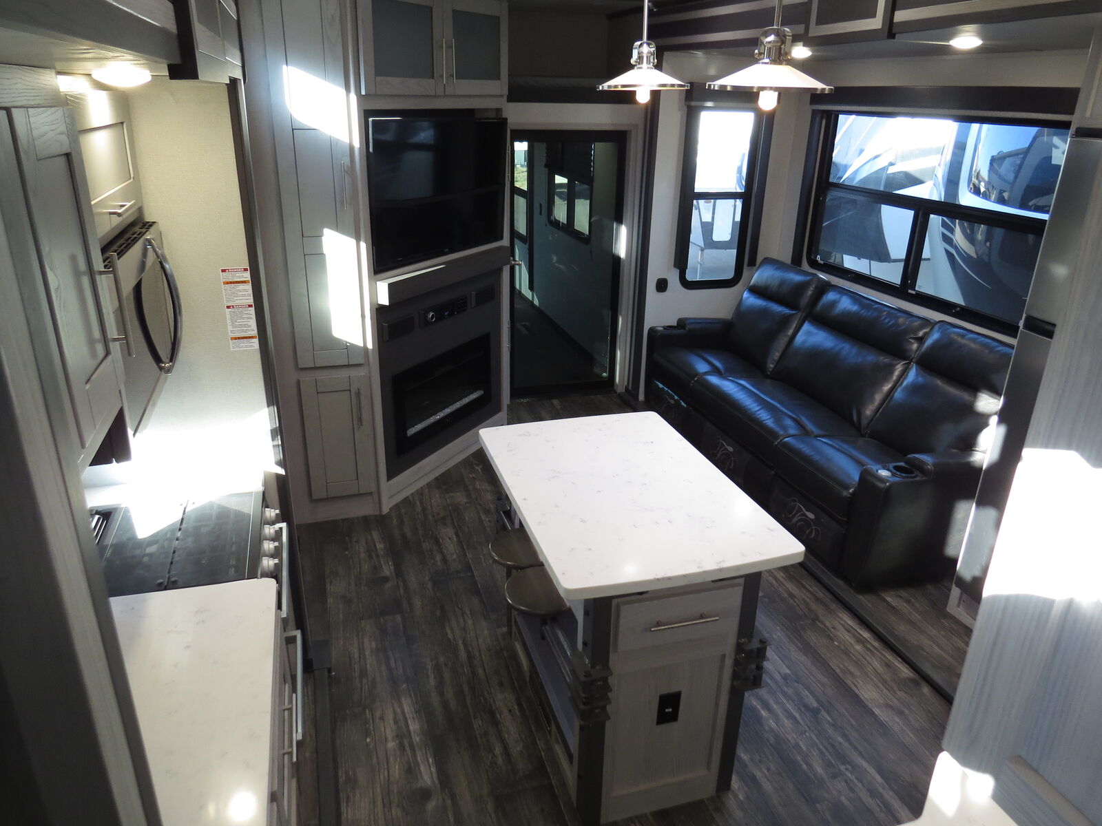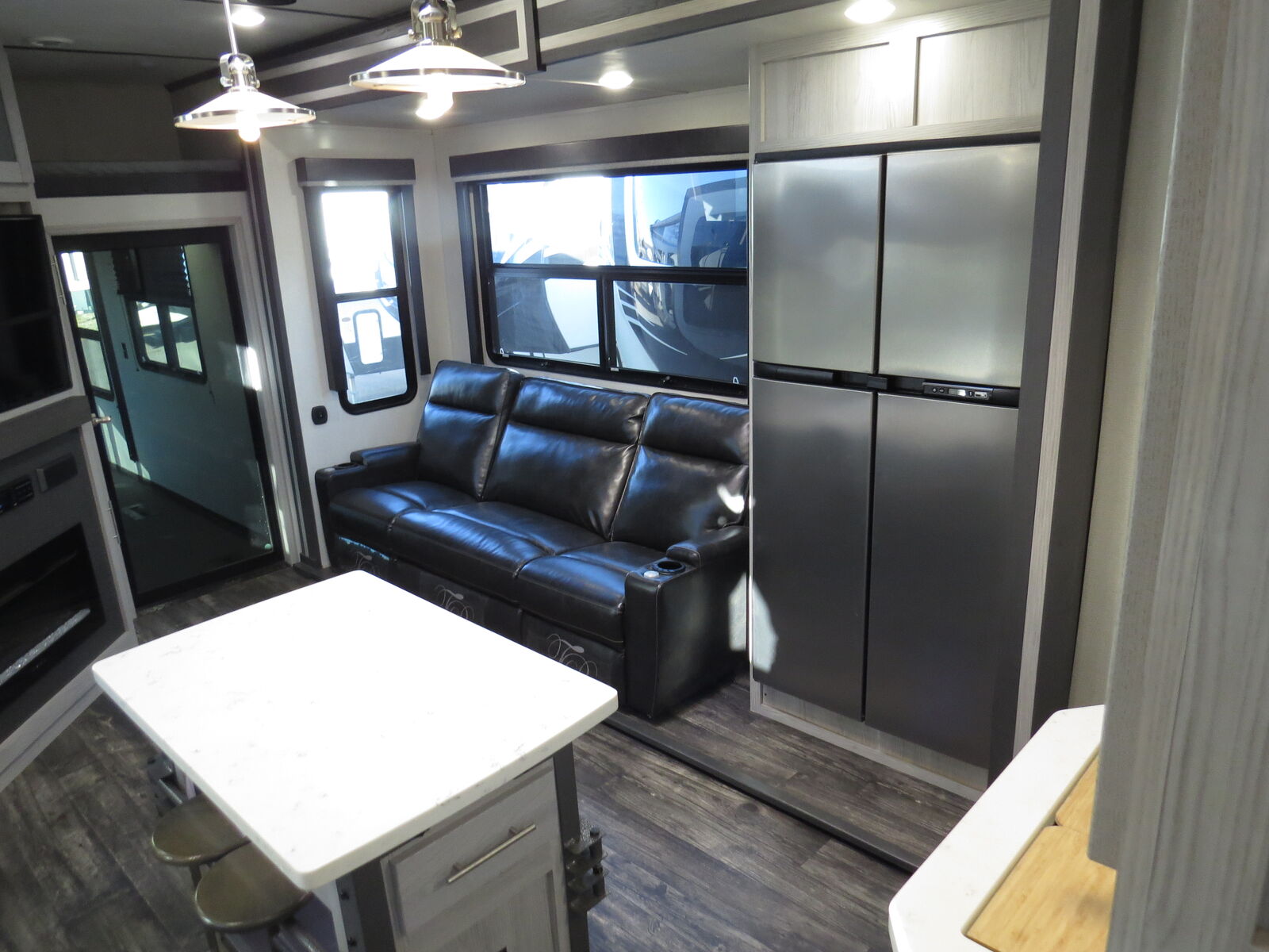 14' 6" Separate Garage!, 3 slides, SOLAR!, Generator 5500 Watt, Fuel station, Big Couch & Fridge SLIDE! Big Couch Slide, Lots of storage, Rear double electric beds (Bottom bed makes into Booth Dinette), Big island with 4 Swing Stools, Kitchen Slide, Front KING Bed Slide, Double Electric patio awnings, Fiberglass exterior, (3) A/C units and Heat.