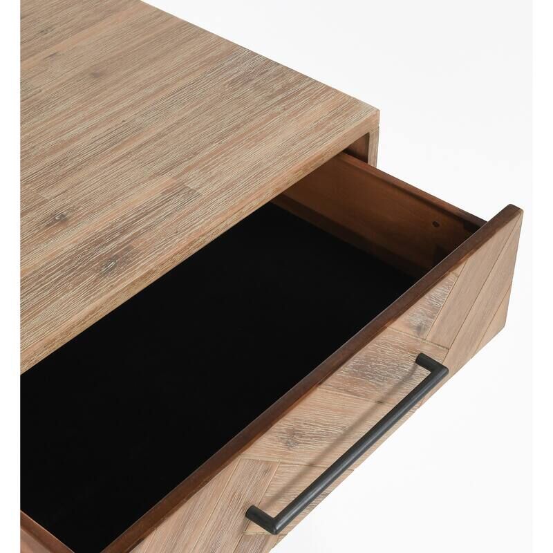 VenmoThe Dexter Nightstand is made with solid acacia wood that has been set in a classic herringbone pattern along the front of its two drawers. The body of the piece features the same acacia wood arranged in straightforward plank construction. Simple iron pulls accent the drawers and complement the dark stained, solid wood legs. Elegantly styled with handcrafted materials, Dexter is a standout accent for the bedroom. 24W x 18D x 24H Acacia Wood Iron Solid Wood Contruction Drawers Included Hand Finished and Distressed Transitional
