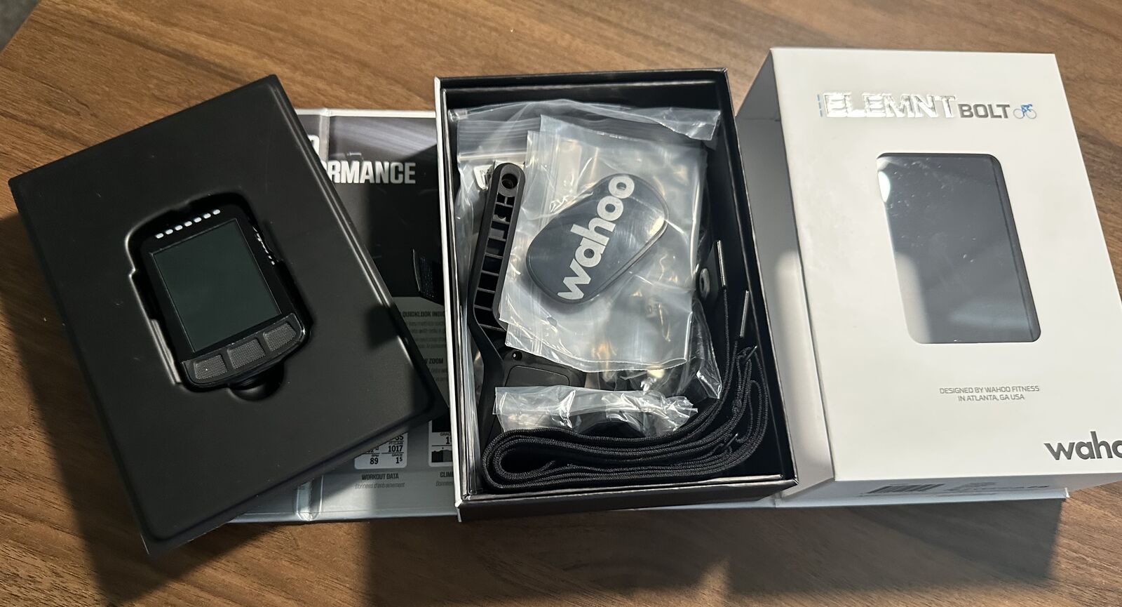 VenmoBought new March 2021 Contains all original parts and fully functional Includes heart rate monitor, speed sensor, cadence sensor, and handlebar mount. Reference: https://www.amazon.com/Wahoo-ELEMNT-Bolt-Bike-Computer/dp/B06XT3YX7T?th=1