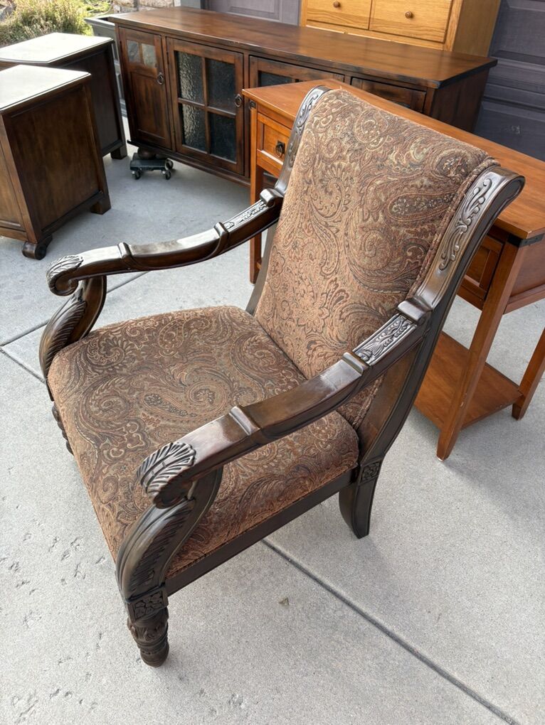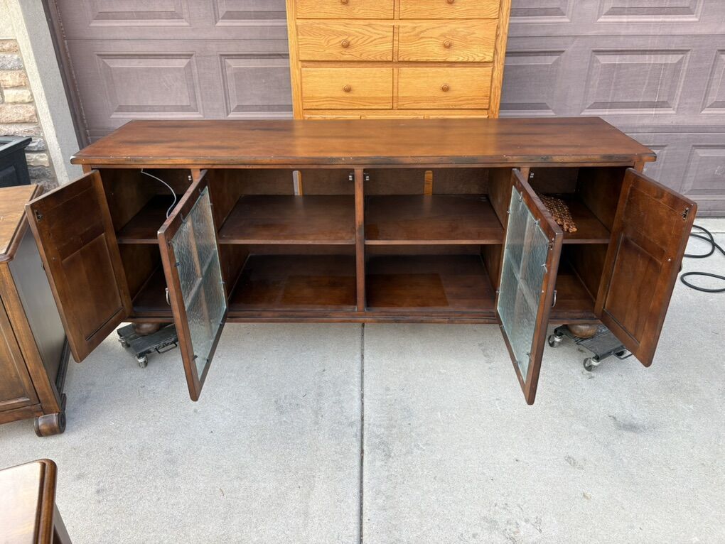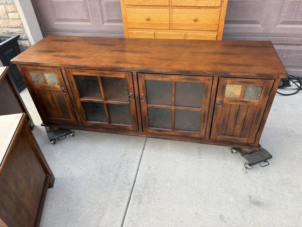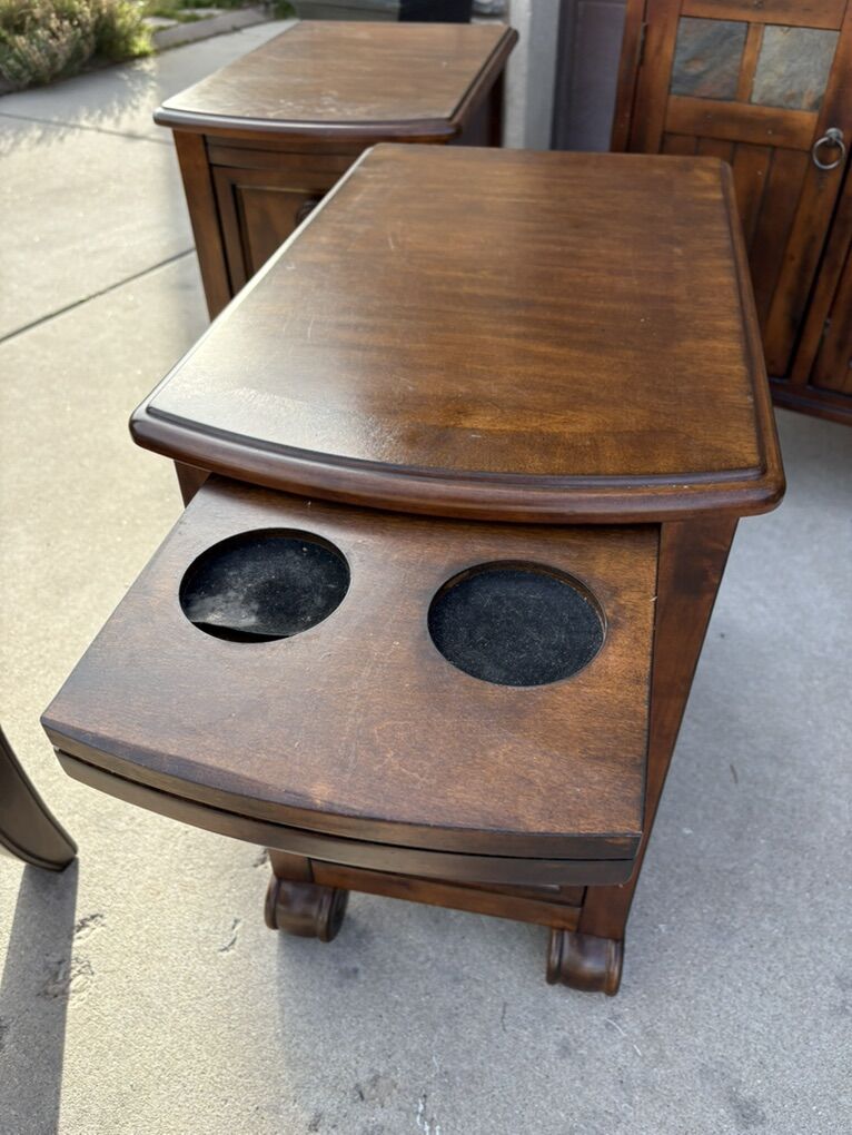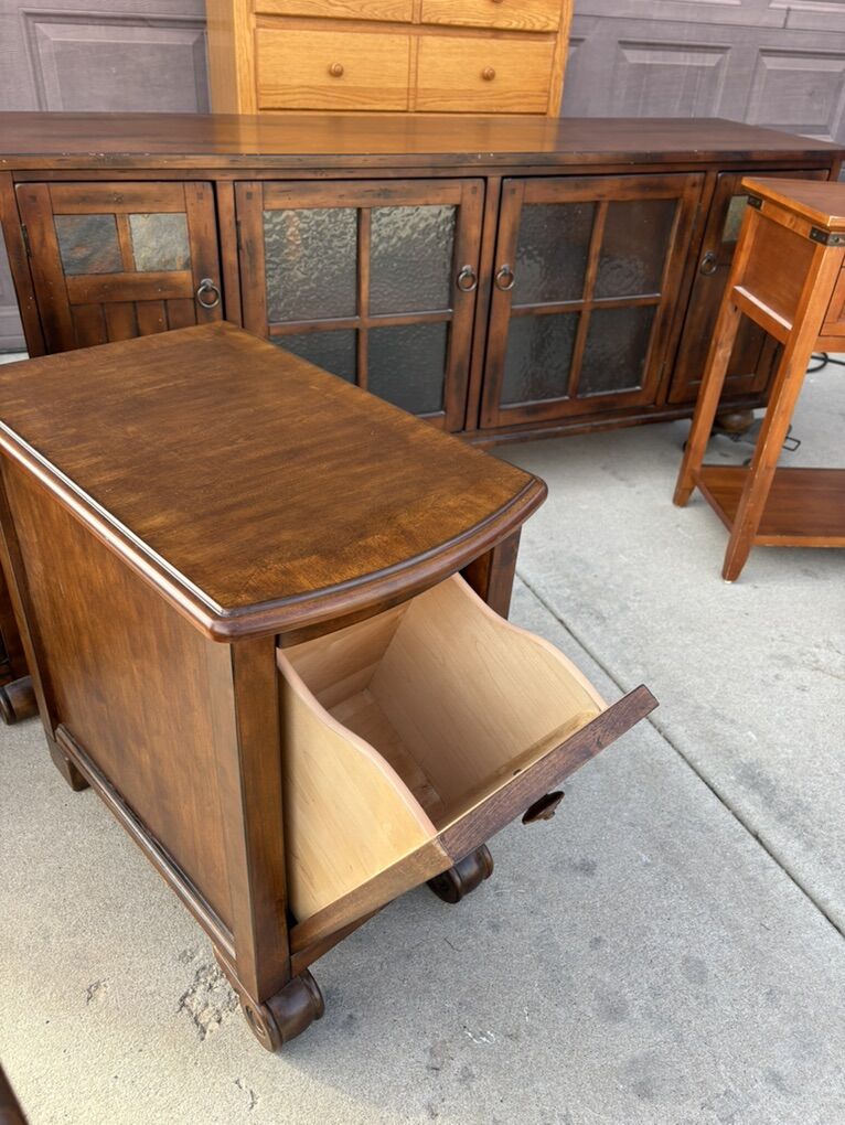 Two luxury chairs Two nightstands One media cabinet One end table with drawers One dresser And two many foldable tables