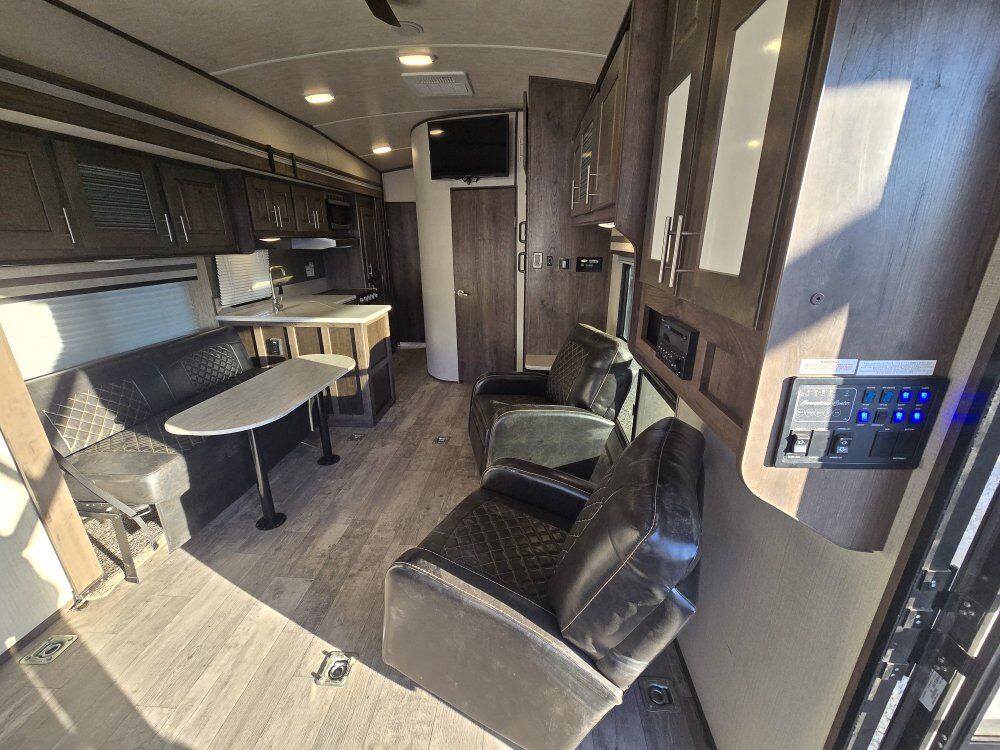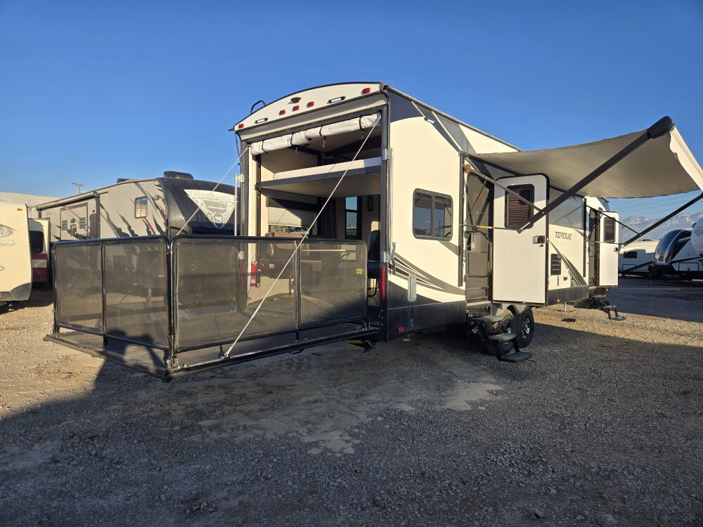 We've got a 2019 Heartland Torque 285 for sale! This thing has a massive garage and has everything youd ever need to go our camping! Rebuilt title On board fuel station 30 gallons On board generator 200 hours Solar Ready Enclosed Underbelly King Bed First Garage dimensions: 16feetx78x71 Second: 16feetx68x85 Electric front and rear jacks Party deck Sleeps 7+ Tires in good shape Brand new battery 2 full propane tanks Roof is solid Length: 35 feet Dry Weight: 8700 GVWR: 12K 100 Gal fresh water 60 Gal Gray 40 Gal Black Lots of storage And so much more! Overall this is a great trailer for the price and it is ready to be taken out! It does hold a rebuilt title due to some front end damage (as shown in pictures) that has been repaired and sealed up. We are a small family owned dealer and take pride in our trailers! We only charge a doc fee and no other hidden fees! Asking 23,800 obo DL#641B