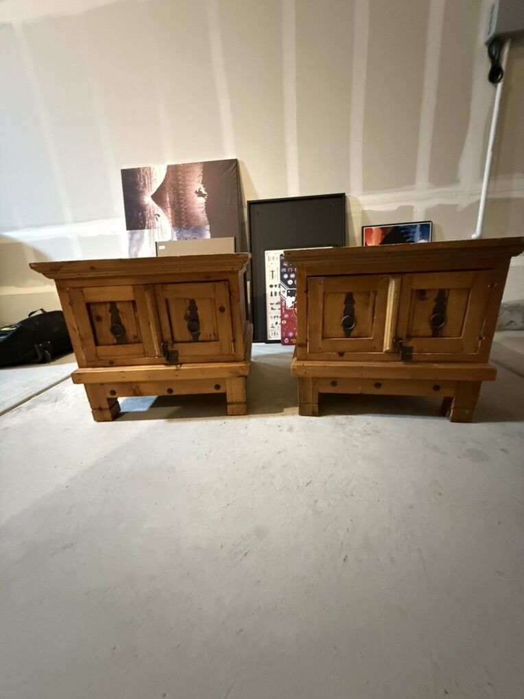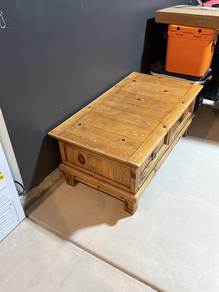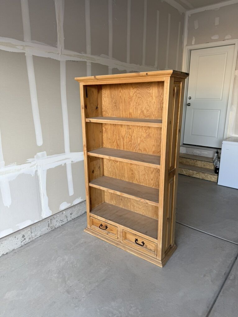 Zelle5 piece Solid Pine furniture set. Set includes 2 end tables with large storage inside, 1 coffee table with drawers storage, 1 Armoire with removable shelves, and 1 Bookcase (4 shelves, 2 drawers). Cabin style feel, furniture is in good shape. Priced as a set, individual pieces available if requested.
