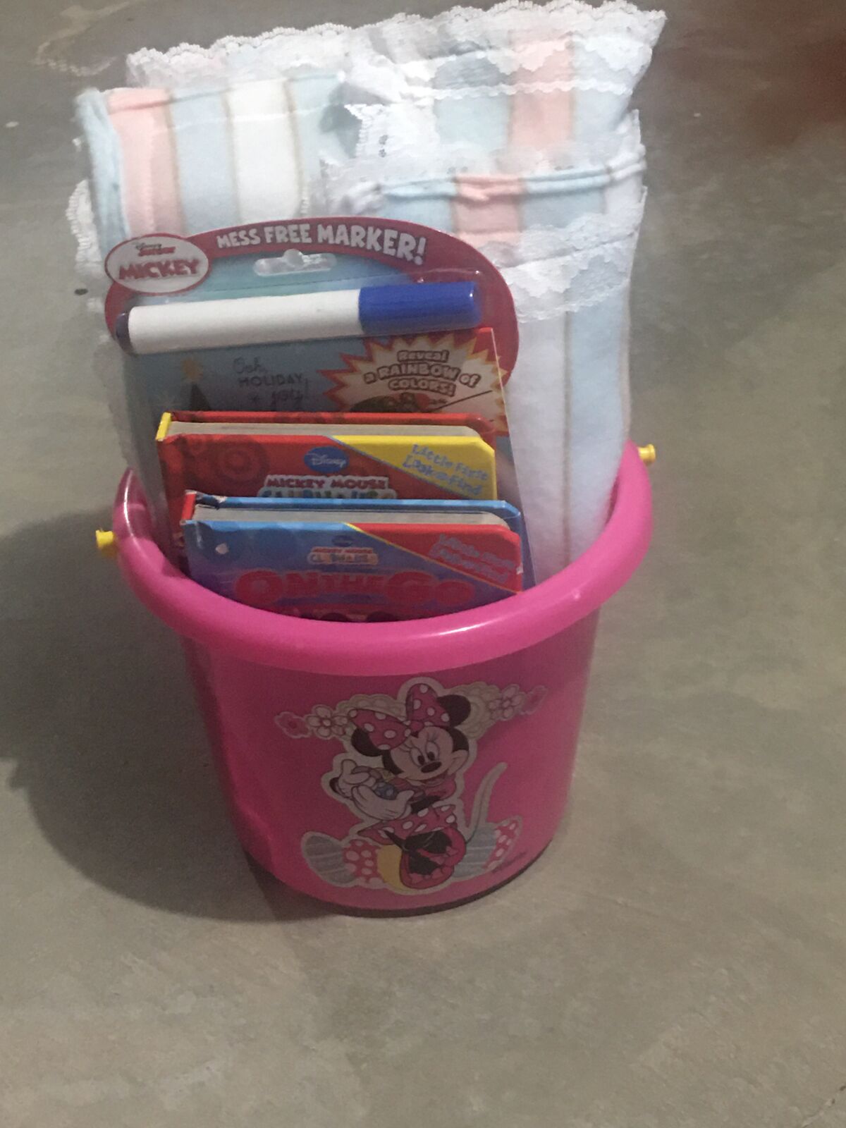 Pic 21: Cute Pink bucket with Minnie on it, darling blanket, & (3) books $12.