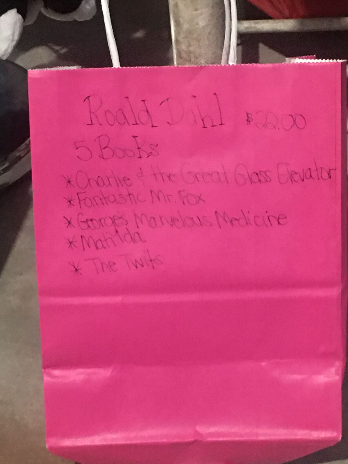 Pic 7-8: Pink bag with (5) Roald Dahl books in it. $18