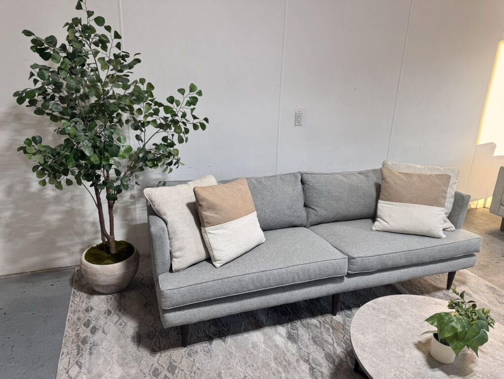 ApplePayMid-century modern style with sleek lines and tapered wooden legs. Cushions are reversible & covers are removable for easy cleaning. No structural damage, rips, or stains. Pet & Smoke free!