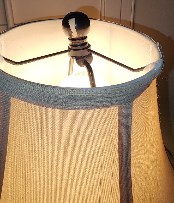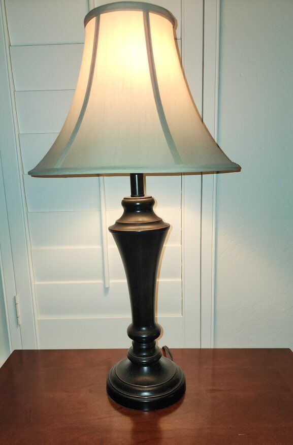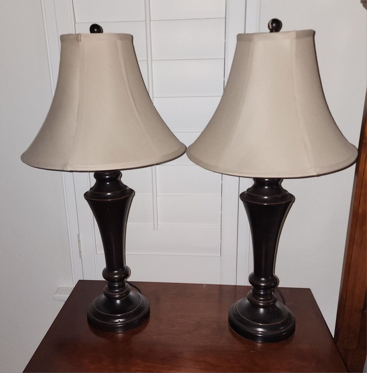Venmo2 espresso colored lamps with cream colored shades. From the base to the top of the shade they are about 28"H. One of the balls that hold the shade in place has a little scratch. The lamps work great!