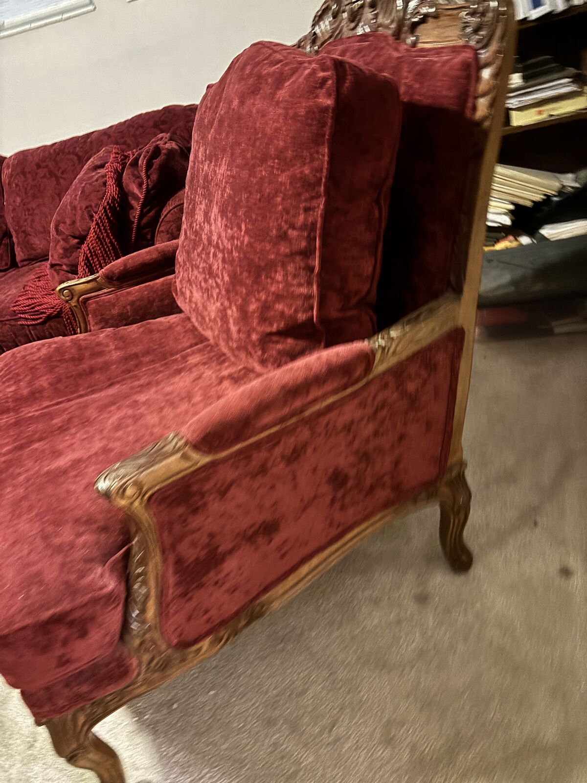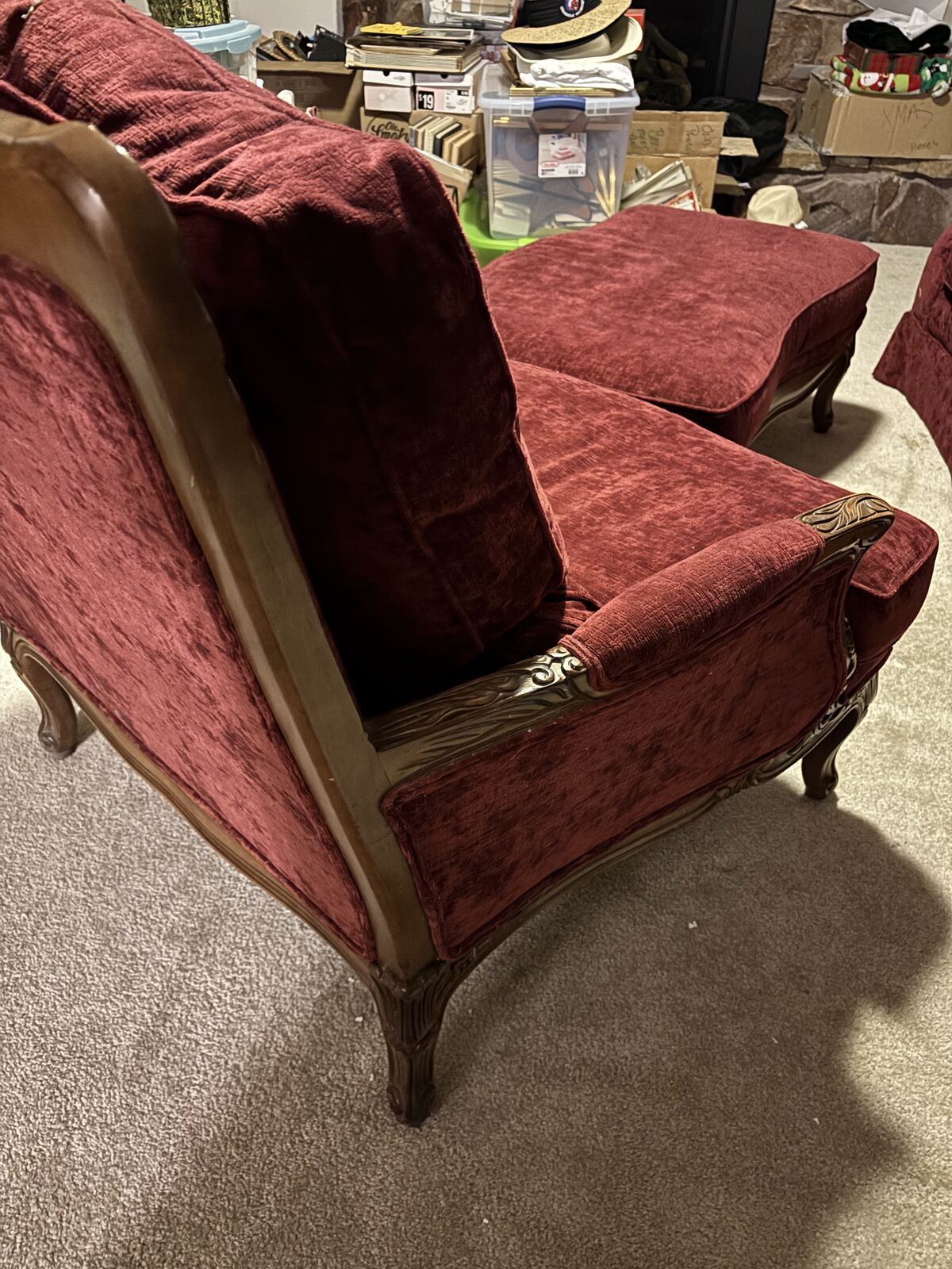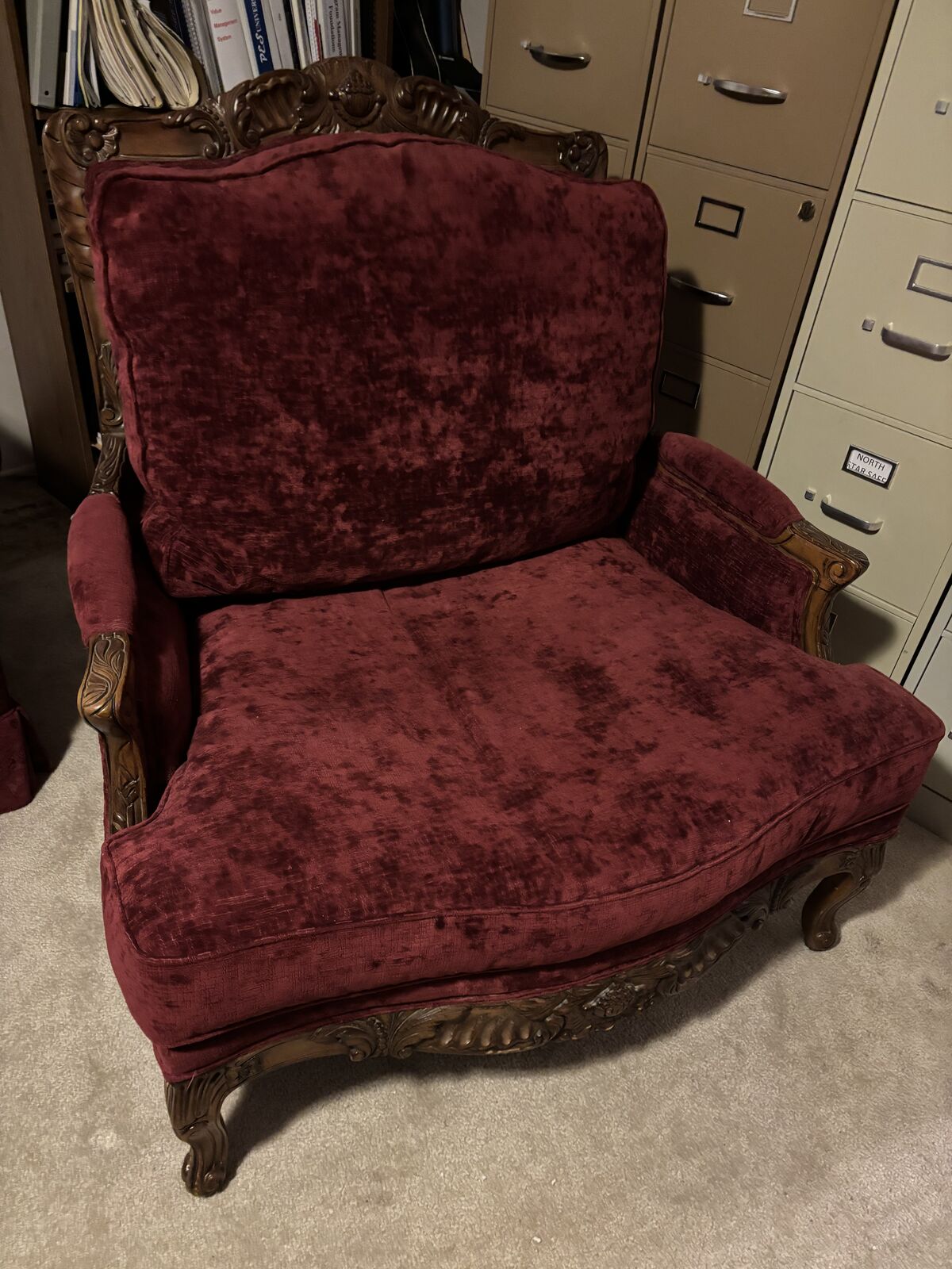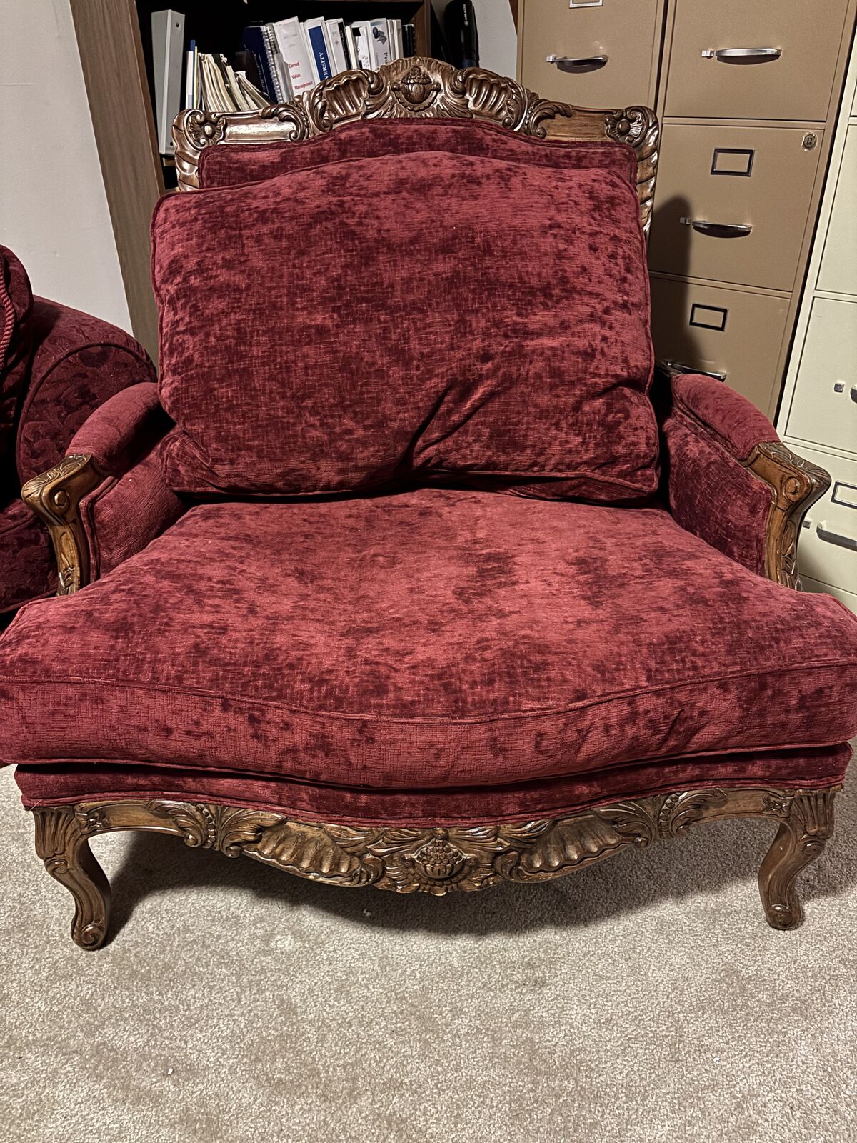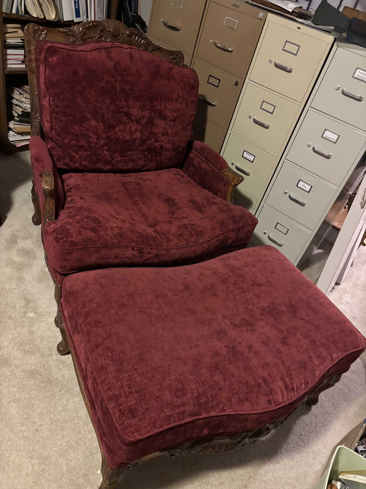 LOUNGE CHAIR & OTTOMAN: Red velvet. Large! Intricate wood sculpture. Solid pieces of furniture.
