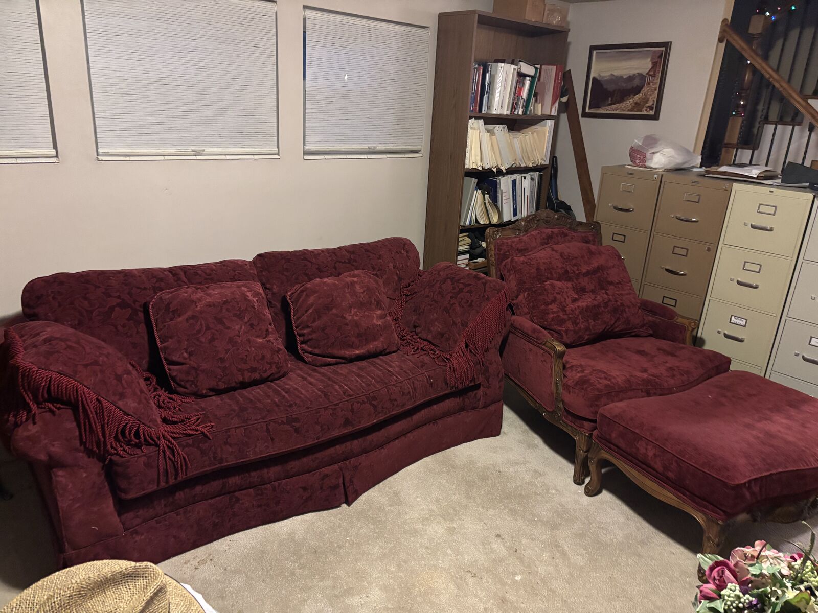 VenmoSOFA: Red Velvet Sofa and Chair. Traditional Vintage upholstered with crimson deep red damask-patterned fabric. Curved front, rolled arms, and matching cushions. Pillows with heavy decorative tassel fringe. Includes plush, loose back cushions for comfort. Mfd by SHERRILL.