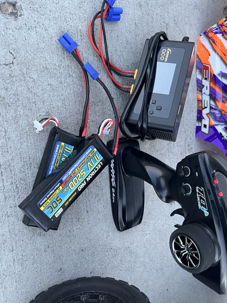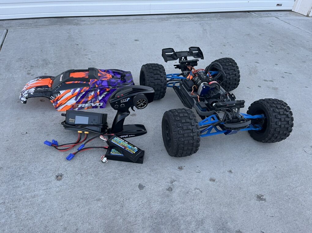 Selling my traxxas erevo 2.0, comes with two 3s lipos and a dual charger. Upgraded to hobbywing max 8 electronics. I still have the old stock motor I can throw in as well.