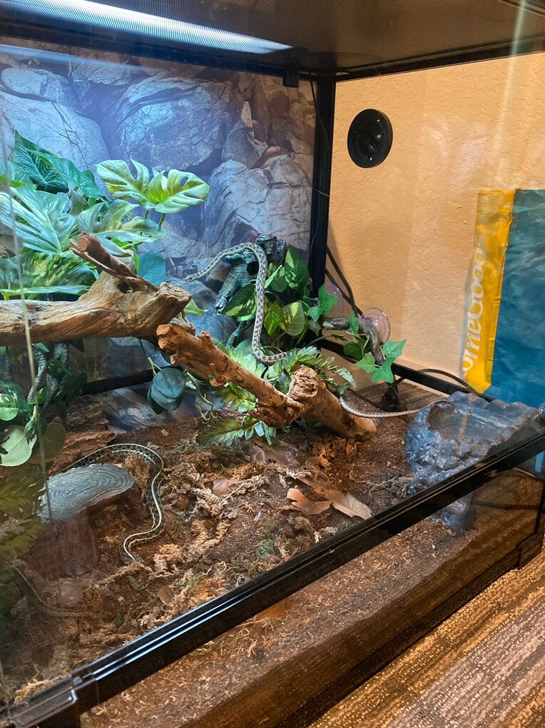 Zelle90 gallon terrarium. It’s basically new, and in perfect condition. Has bioactive substrate alive with spring tails and isopods. Comes with all decorations, water bowl, hides and more. With two UVB stripe laps and a hood heat thermostat lamp. All with new bulbs. Both doors lock and has two sections up top that lock and come off for easy access. Has two healthy and very active Garters in there. Dm for more information.