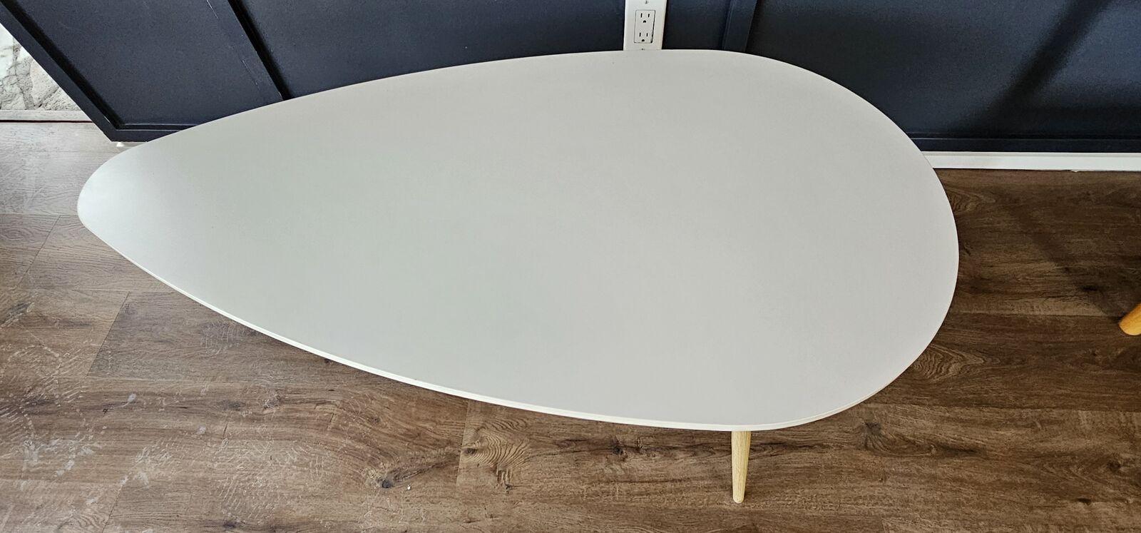 White, teardrop shaped coffee table with oak legs. In perfect condition. Cash only please.
