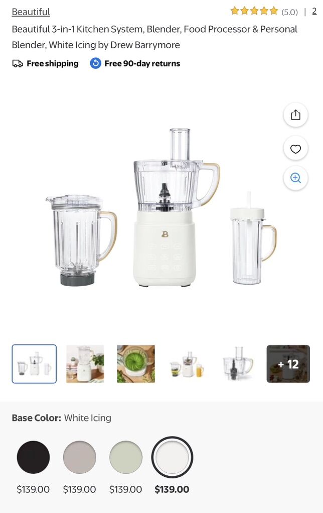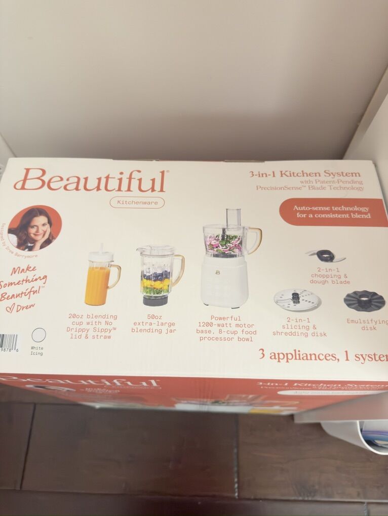 Item Details: Created by Drew Barrymore, the Beautiful™ 3-in-1 Kitchen System is your all-in-one solution for blending, chopping, mixing & more. With a powerful 1200-watt motor and three interchangeable vessels, this versatile system transforms from a full-sized blender to a food processor to a personal blender in seconds. Five one-touch, preset functions—Ice Crush, Chop, Dough, Milkshake, and Smoothie/Clean—plus three manual speeds make it easy to handle anything from frozen fruits to fresh dough. The sleek, touch-activated display only lights up when you need it, while the soft matte finish adds a modern look to your kitchen counter. Designed for real life, with dishwasher-safe parts, a self-cleaning mode, and smart details like a wide 3” feed tube and no-drip sippy lid, this system makes every prep step simpler and more beautiful. Beautiful by Drew Barrymore brings together contemporary design, high-performance features & thoughtful innovation—so you can focus on what matters most: making something beautiful.