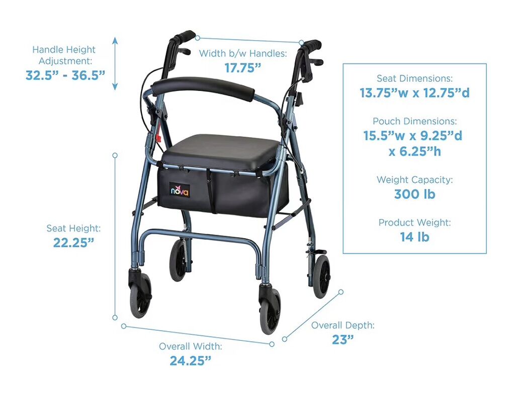 Stay mobile and comfortable with the NOVA GetGo Classic Rollator Walker. Designed for users 5’4” – 6’ tall, this rolling walker features a convenient seat height of 22.25” and a sturdy frame for everyday support. Lightweight, easy to maneuver, and perfect for indoor or outdoor use.