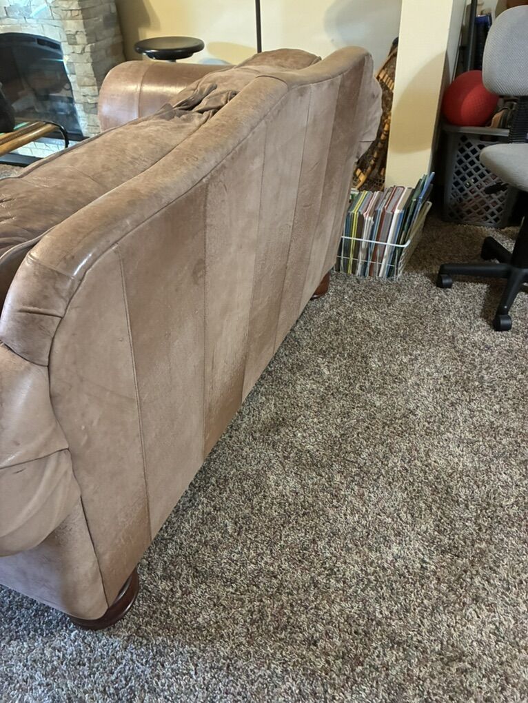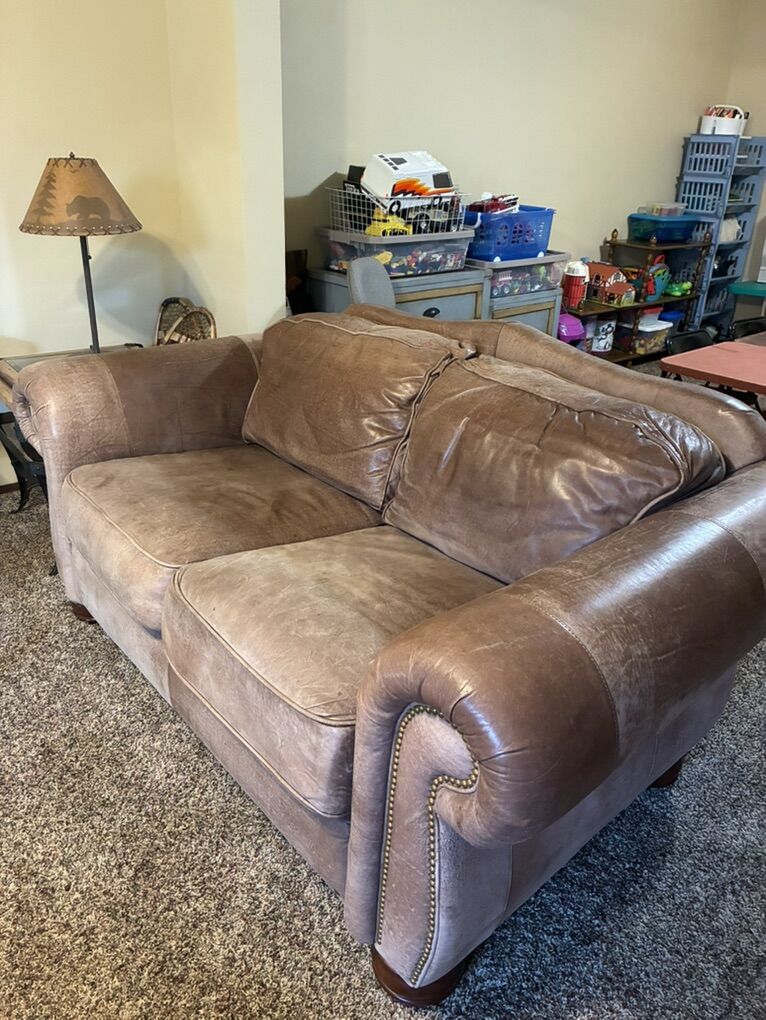 VenmoQuality built genuine leather loveseat with tax-head design on the arms. Bought new for $1995. No tears or smells. Cushions are still firm but so comfortable. It’s in my downstairs family room and doesn’t get used much. We are downsizing. Some fading from the light by the window but it adds to the character of the loveseat. Back cushions are stationary so they stay looking good after you sit on it. Local sales only. We’re seniors so bring strong helpers.
