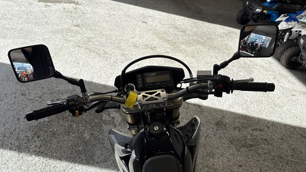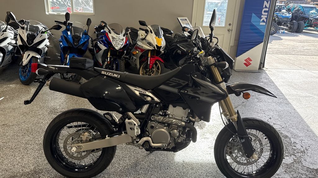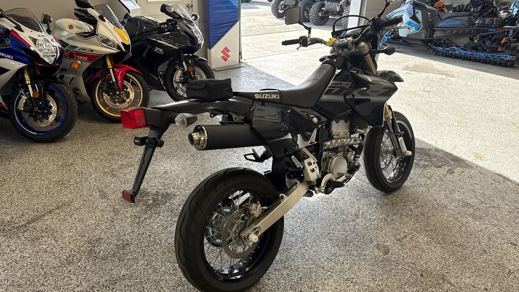 2024 Suzuki DR-Z400SM Suzuki's 2024 SuperMoto DR-Z400SM is based on the proven DR-Z400S. So, it combines Supermotard style and features in a narrow, lightweight, street-legal package. This bike brings off-road soul and fun to paved roads. It is common to take the SuperMoto down a twisty forest road, around tight canyon corners, or through commuter traffic. Its 398cc, liquid-cooled, four-stroke engine provides strong low-rpm torque and crisp throttle response for any of these occasions. Key differences between the DR-Z400SM and the DR-Z400S are the inverted front fork, wide spoke-style wheels, and 300mm diameter floating front brake rotor. The inverted fork contributes to less unsprung weight and improved overall handling, while the large brake and wider rims with high-grip tires offer an exhilarating sportbike experience. Features may include: Suzuki's Supermotard model, based on the proven DR-Z400S, combines Supermotard style and features in a narrow, lightweight, street-legal package Versatile and strong, 398cc, DOHC, liquid-cooled, dry-sump engine has push-button starting SuperMoto boasts fully adjustable MX-style suspension plus high-grip sportbike tires on strong spoke wheels featuring anodized, aluminum Excel rims Both the Grand Blue and Solid Black or the Solid Black bodywork feature new graphics packages that complement the motorcycle’s styling and mission. ENGINE Lightweight, 398cc, DOHC, liquid-cooled, dry-sump engine produces strong, tractable power. Compact, four-valve cylinder head has 36mm intake valves, 29mm exhaust valves, narrow 28-degree included valve angle, and shim-under-bucket valve adjustment system. Simple electric starting is powered via a lightweight starter motor with an automatic mechanical decompression system. SCEM-plated cylinder (nickel-silicon-phosphorus) is lighter and more durable than an iron liner and has excellent heat transfer properties. TRANSMISSION Compact, five-speed transmission utilizes a cable-operated clutch with a separate magnesium outer cover for simplified clutch maintenance. Low-maintenance, long-life, sealed O-ring type drive chain produces minimal sounds when riding. CHASSIS Wide, blue- or black-anodized RK Excel aluminum rims with stainless steel spokes are fitted with sporty radial tires: 120/70-R17 front and 140/70-R17 rear. Strong braking performance is supplied by a front disc brake with a large 300mm floating-type rotor and dual-piston caliper, plus a 240mm rear disc brake with a single-piston caliper. ELECTRICAL Compact, digital instrument cluster includes speedometer, odometer, twin-trip meters with addition/subtraction capability, clock, and stopwatch functions. On-road legal lighting includes bright 60/55-watt halogen headlight, compact tail/stoplight, lightweight, rubber-mounted turn signals, and horn. Electrical systems, including the easy-push button starter, are powered by a compact, 6.5-amp, maintenance-free battery. ADDITIONAL 12-month limited warranty. Longer coverage periods with other benefits available through Suzuki Extended Protection (SEP). A variety of Genuine Suzuki Accessories for DR-Z400SM owners are available, including a low-profile seat, cargo rack, handguard set, and a large selection of Suzuki logo apparel.