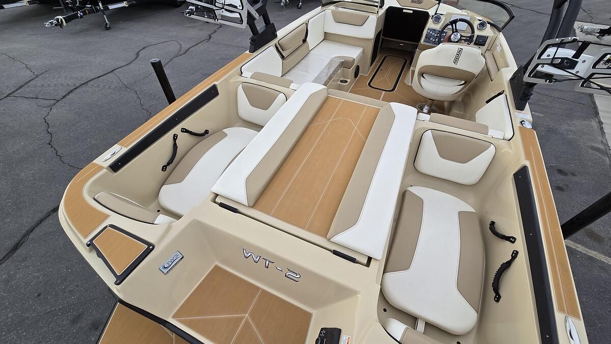 The WT-2DC offers a dual console layout with full windshield and wraparound cockpit seating. This model features a walkthrough to the swim platform with a transom step for getting ready between rides. There’s plenty of storage thanks to a spacious ski locker and under seat base storage. And of course, it has Heyday’s signature ‘Heyday Hangout Zone’ seats that get passengers closer to the action and conceal even more storage below