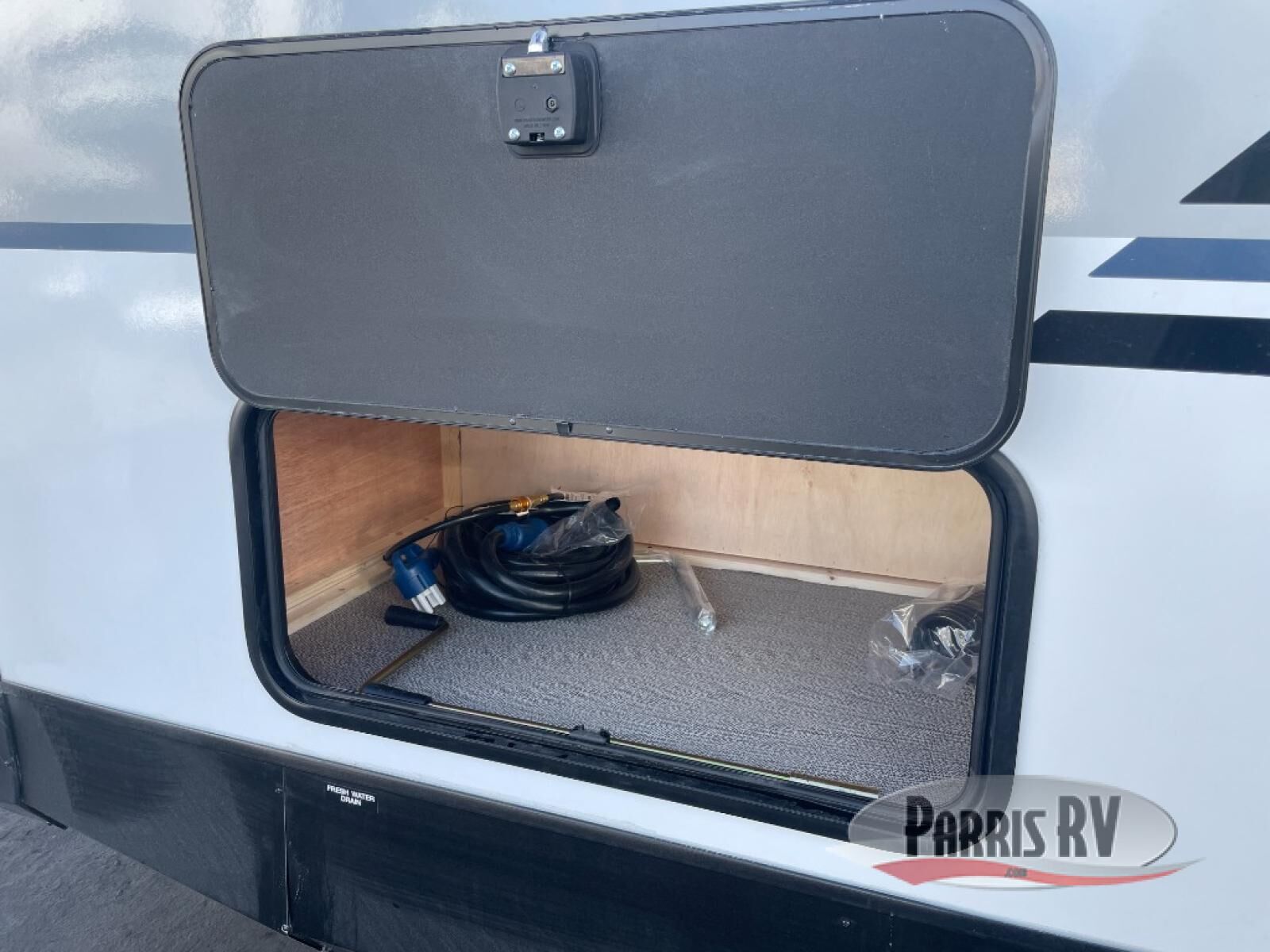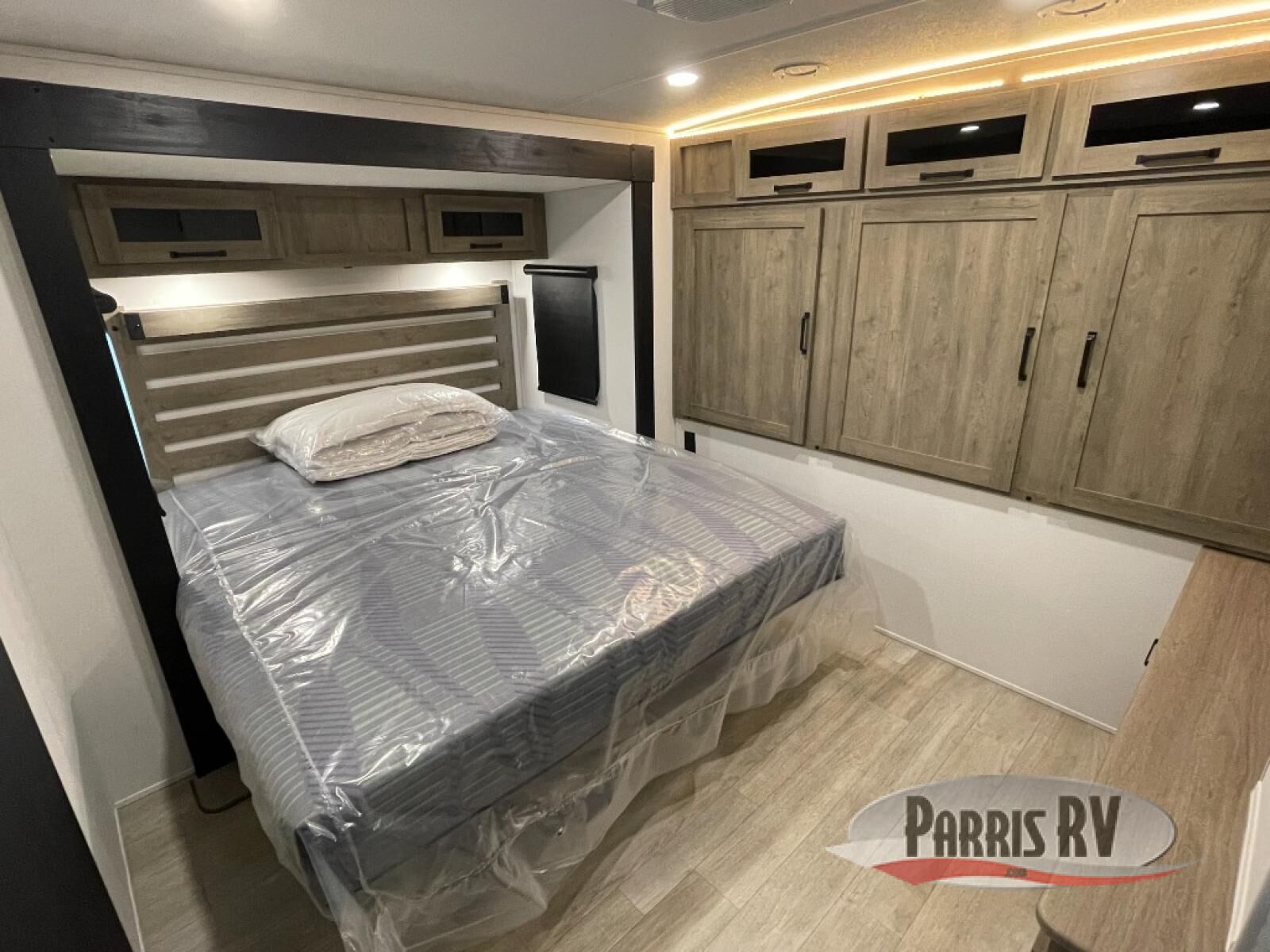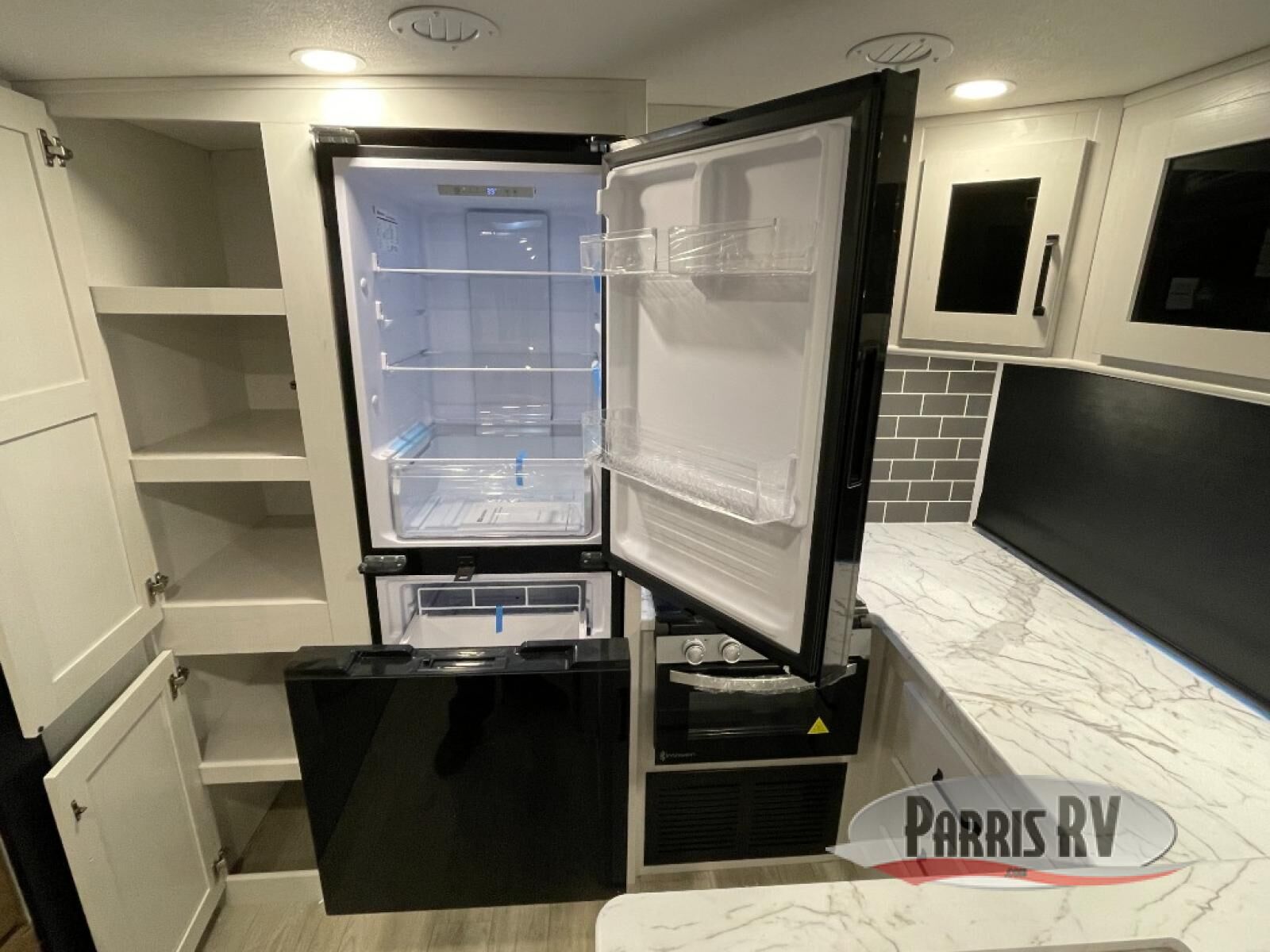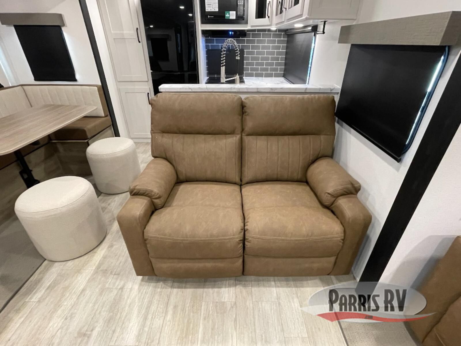 One look at this spacious travel trailer and you'll be sold! The rear kitchen features a U-shaped counter, an 11-cu. ft. refrigerator, plus a pantry for dry goods and snacks. There is a 1/2 dinette with bench seating, plus a tri-fold sofa and two theater seats. Everyone can take turns cleaning up in the full bath that includes a shower with a seat, then head outdoors to relax under the patio awnings with LED lights. When it's time for bed, you will enjoy the king bed slide out in the front bedroom. You'll also find a dresser and a closet here, plus a wardrobe with washer and dryer prep if you choose to add those appliances!