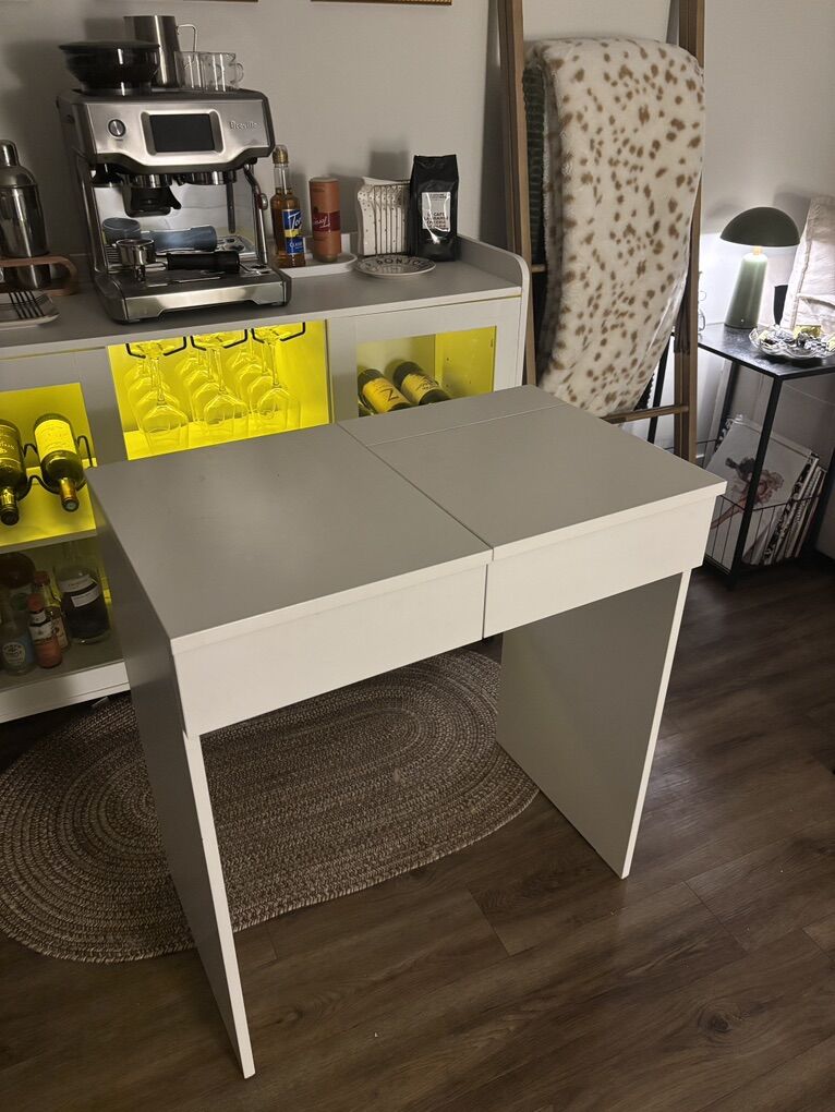 ApplePayIKEA small white vanity, red interior, fold down mirror and a drawer.