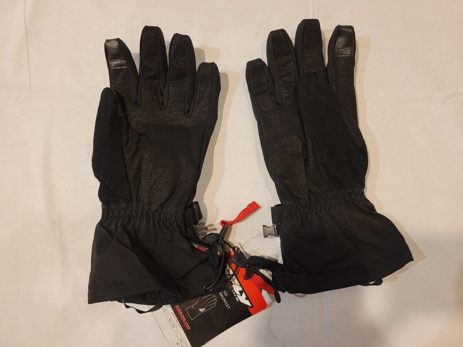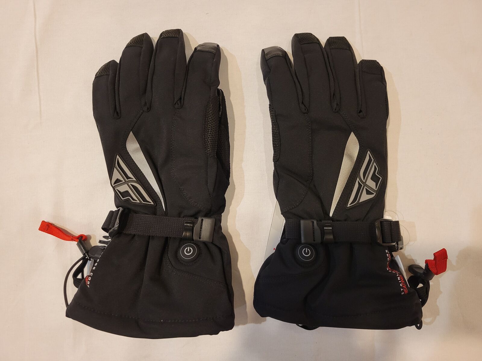 New with factory tags attached Fly Racing Title heated gauntlet snowmobile gloves. Designed for snowmobiling but work great for snowbikes, snowboarding, skiing, and other cold weather activities. Also a great addition to a roadbike raingear kit.